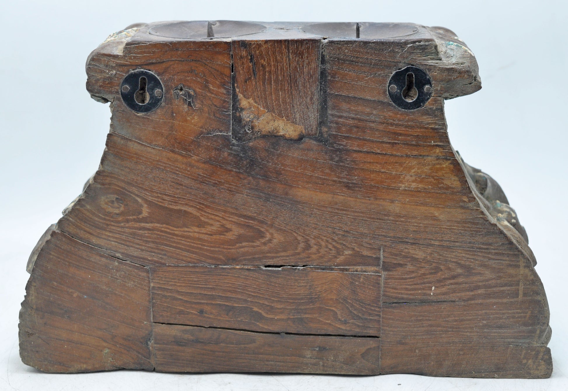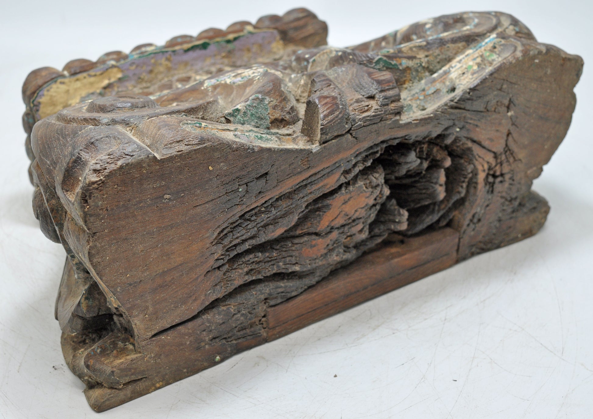 A stunning old wooden half pillar/column base, transformed into a distinctive candle holder. Hand-carved with intricate details and preserving its original rustic hue, it's in good condition with a rich, historic patina. Origin: India.