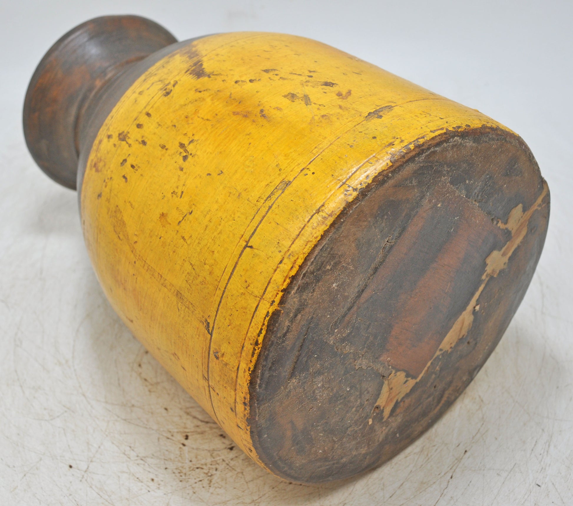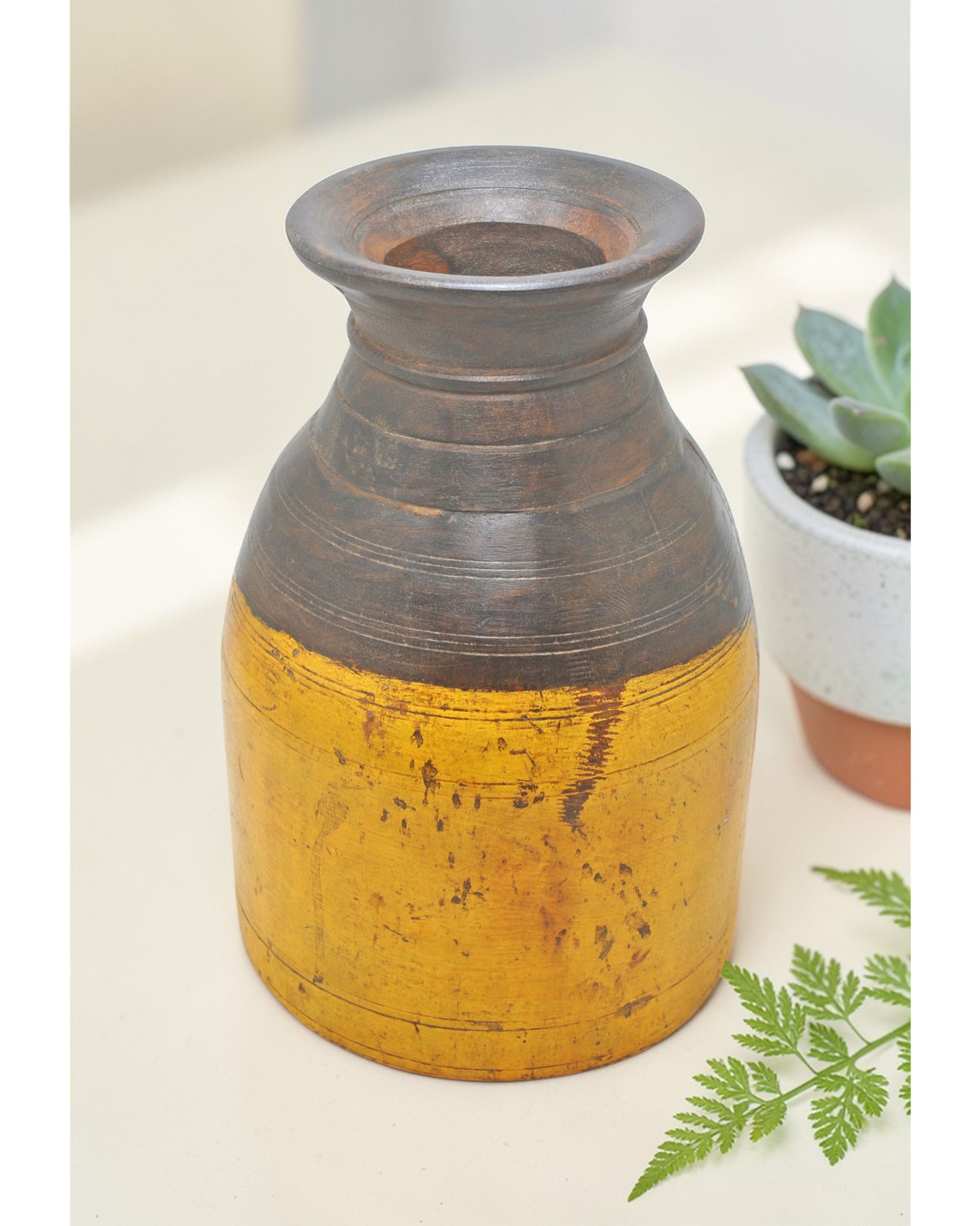 A striking old wooden Himalayan water pot, shaped with a bold and traditional form and enhanced by hand carved detailing, skillfully crafted using age-old techniques and sturdy workmanship, the wood carries a deep naturally aged patina that enriches its vintage character, preserved in good condition, this Indian piece reflects cultural heritage and rustic appeal.