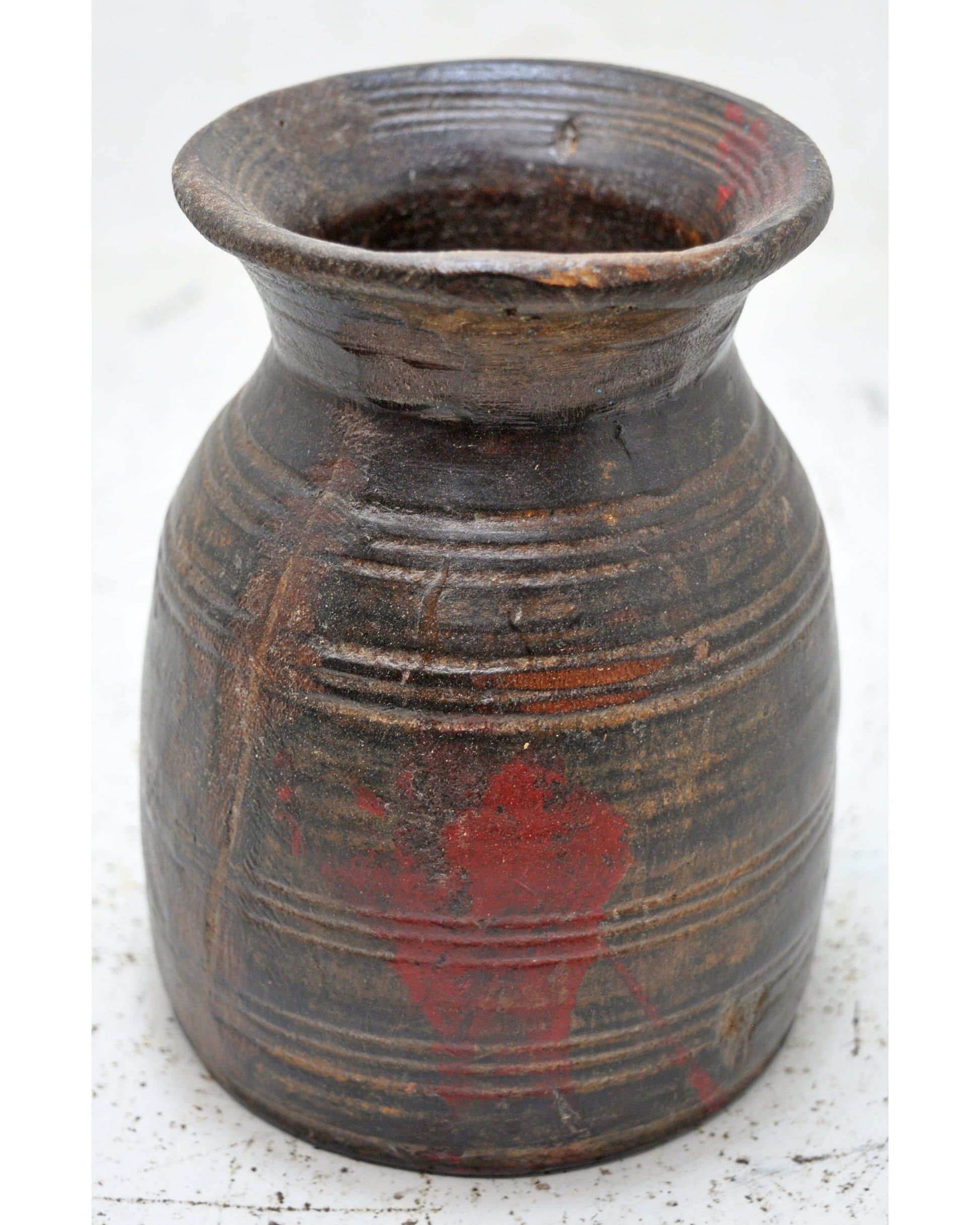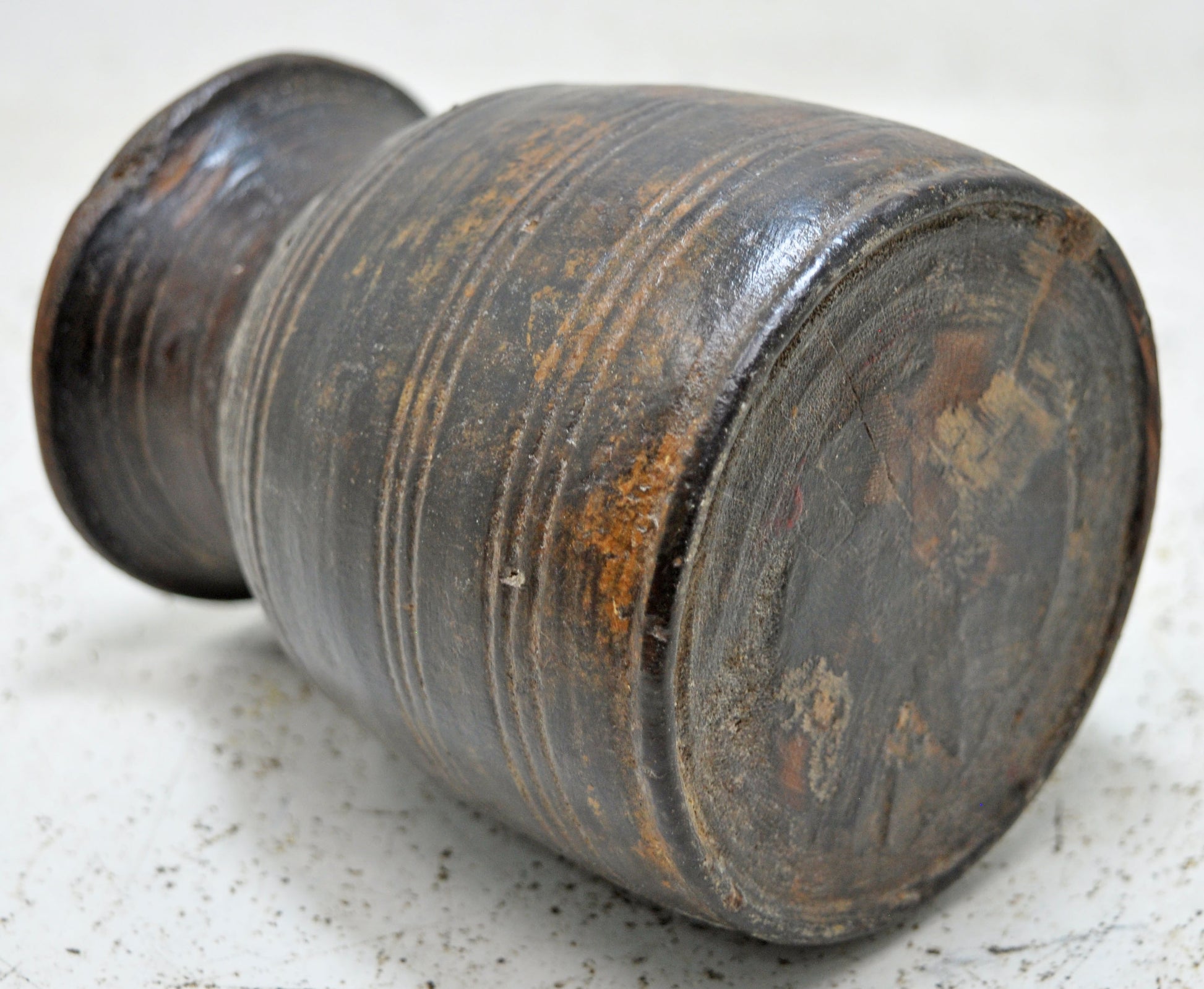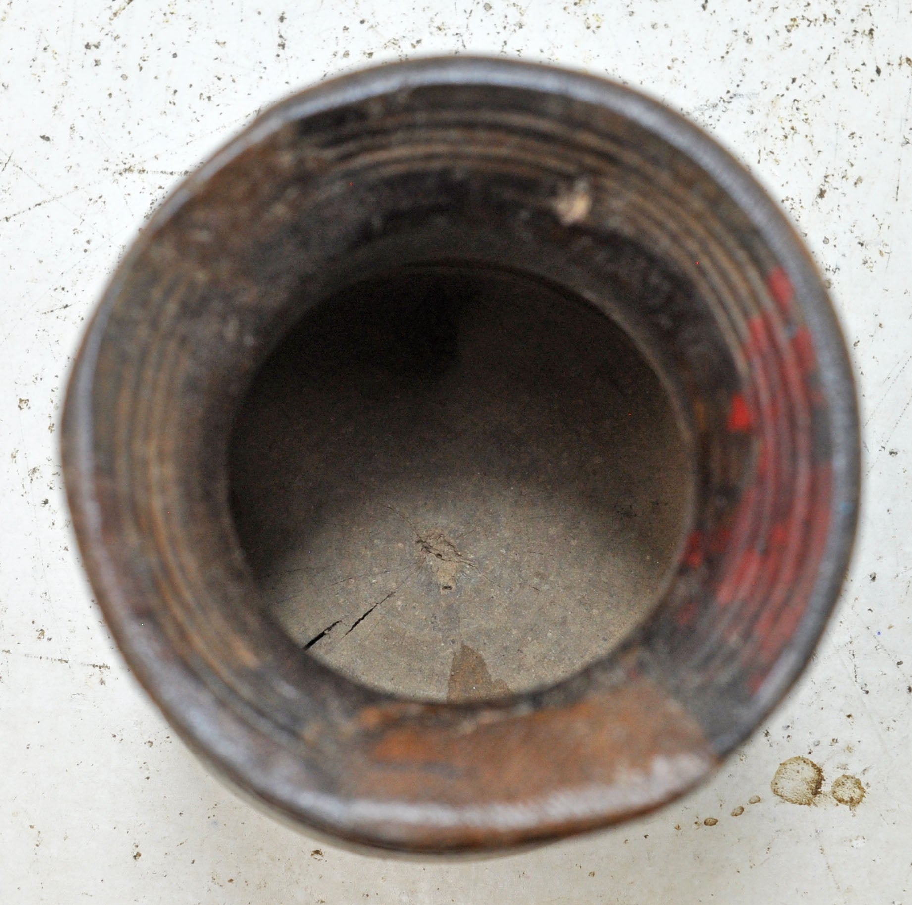 A nice looking old wooden small round pot originally used for storing water. Hand crafted in a nice shape. Good condition and a rich patina. Origin India.
