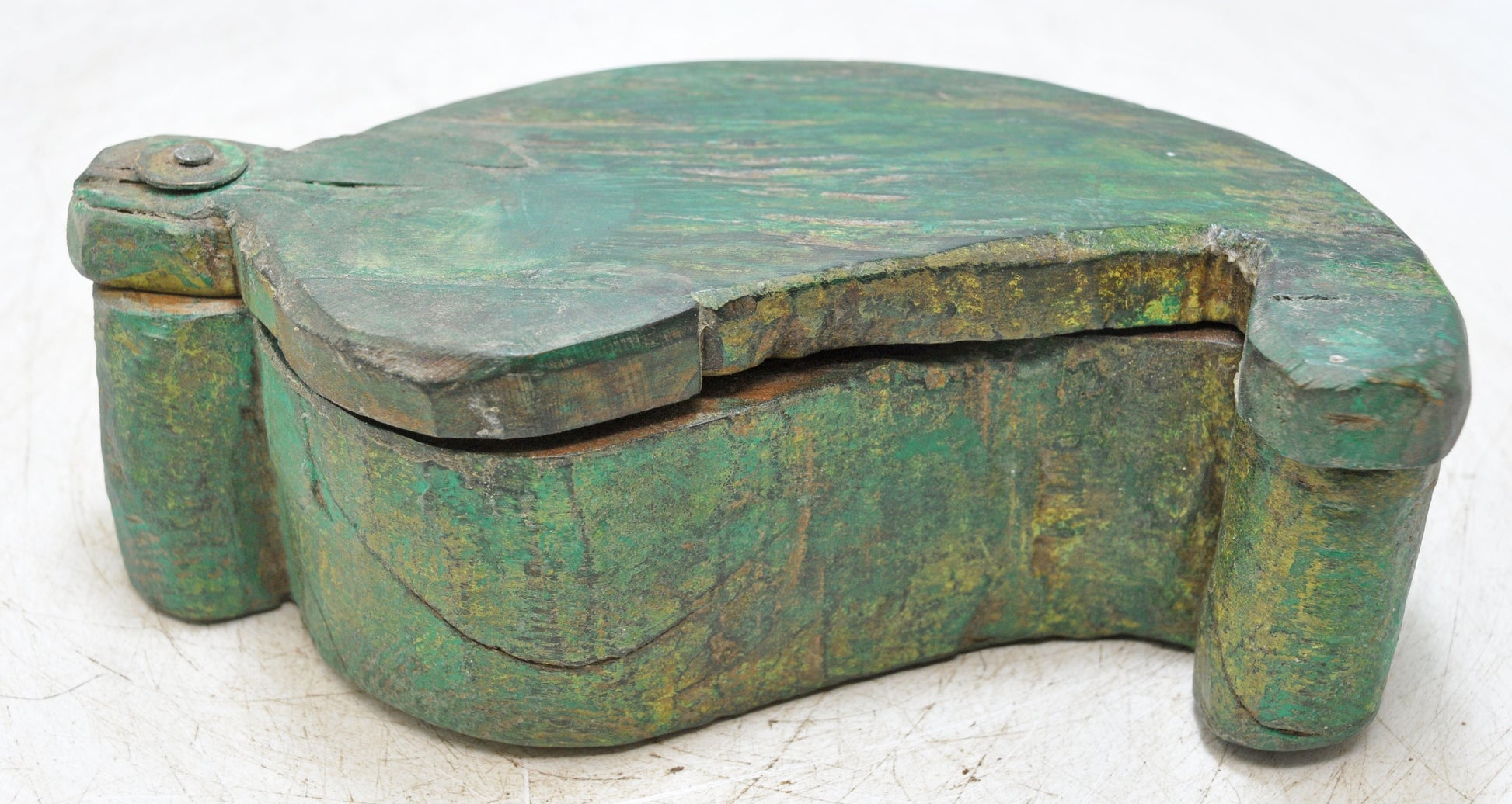 An exquisite old wooden box, once holding spices in historic Indian kitchens, handcrafted with attention to detail. The carvings and elegant shape highlight the artistry of bygone eras. Its deep, rich patina evokes the passage of time while enhancing its antique beauty. In good condition, this piece from India exemplifies the tradition and craftsmanship of skilled artisans.