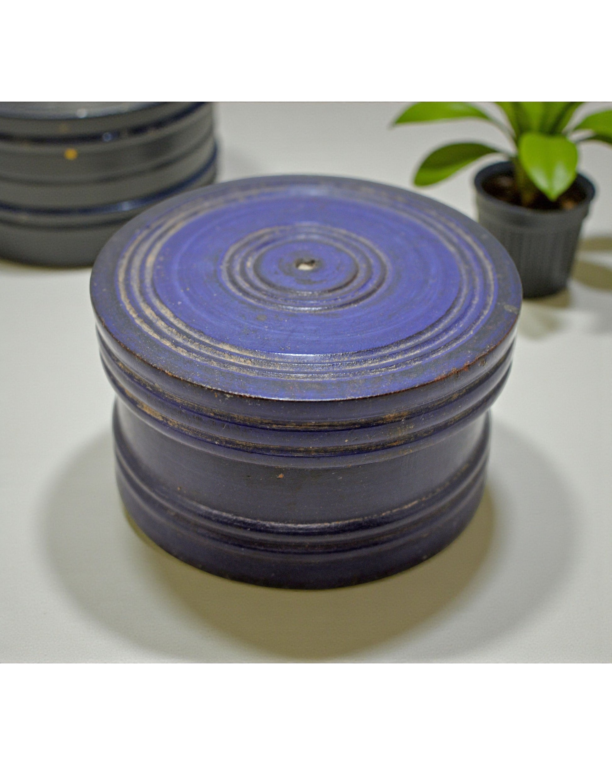A finely aged wooden kum kum storage box showcasing traditional Indian craftsmanship. Hand carved with attention to form and proportion, the box is finished in glossy lacquer paint that has matured beautifully. It remains in good original condition, carrying a deep patina that speaks of age, ritual use, and its authentic Indian origin.