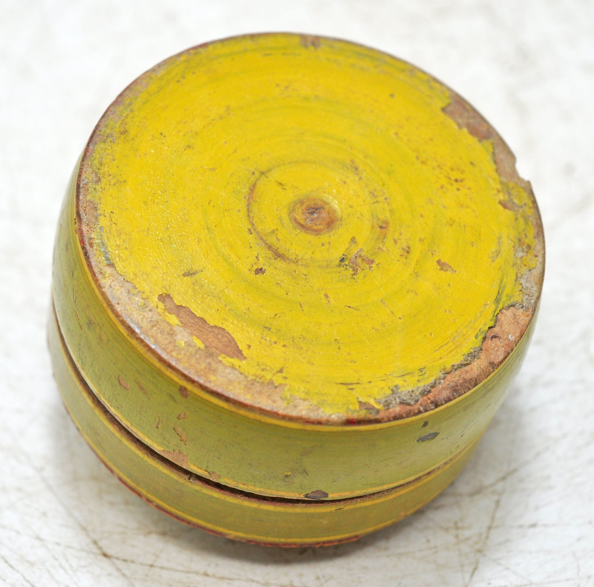 This vintage kum kum storage box is crafted from solid wood and shaped by hand using traditional techniques. Its glossy lacquer-painted surface adds charm and depth, while years of aging have created a beautiful patina. The box remains in good condition and stands as a fine example of Indian ritual craftsmanship.