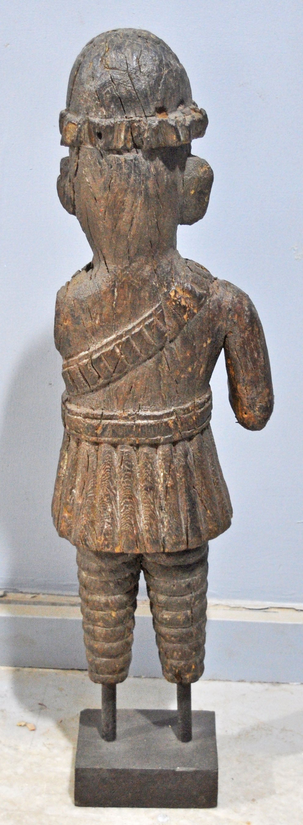 A striking old wooden man figurine of large size, expertly hand carved with fine and expressive detailing throughout the form. The figure is mounted on a stand, allowing it to be displayed with strength and presence. The surface carries a deep, naturally aged patina that enhances its antique character. Preserved in good condition, this impressive piece originates from India and reflects skilled traditional craftsmanship.
