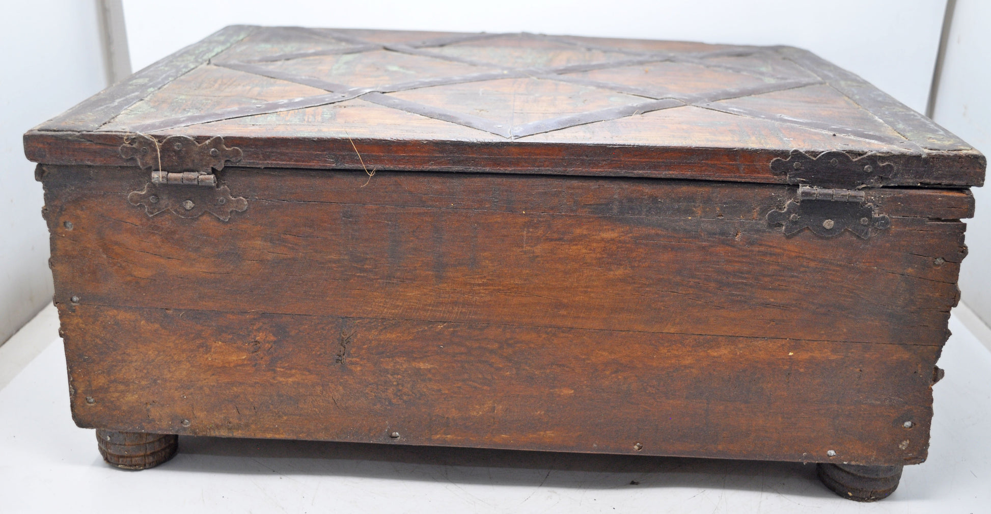 A stunning large, old wooden storage chest, hand-crafted with intricate fine carvings on the base and decorative metalwork on the top. In good condition, showcasing a rich, historic patina. Origin: India.