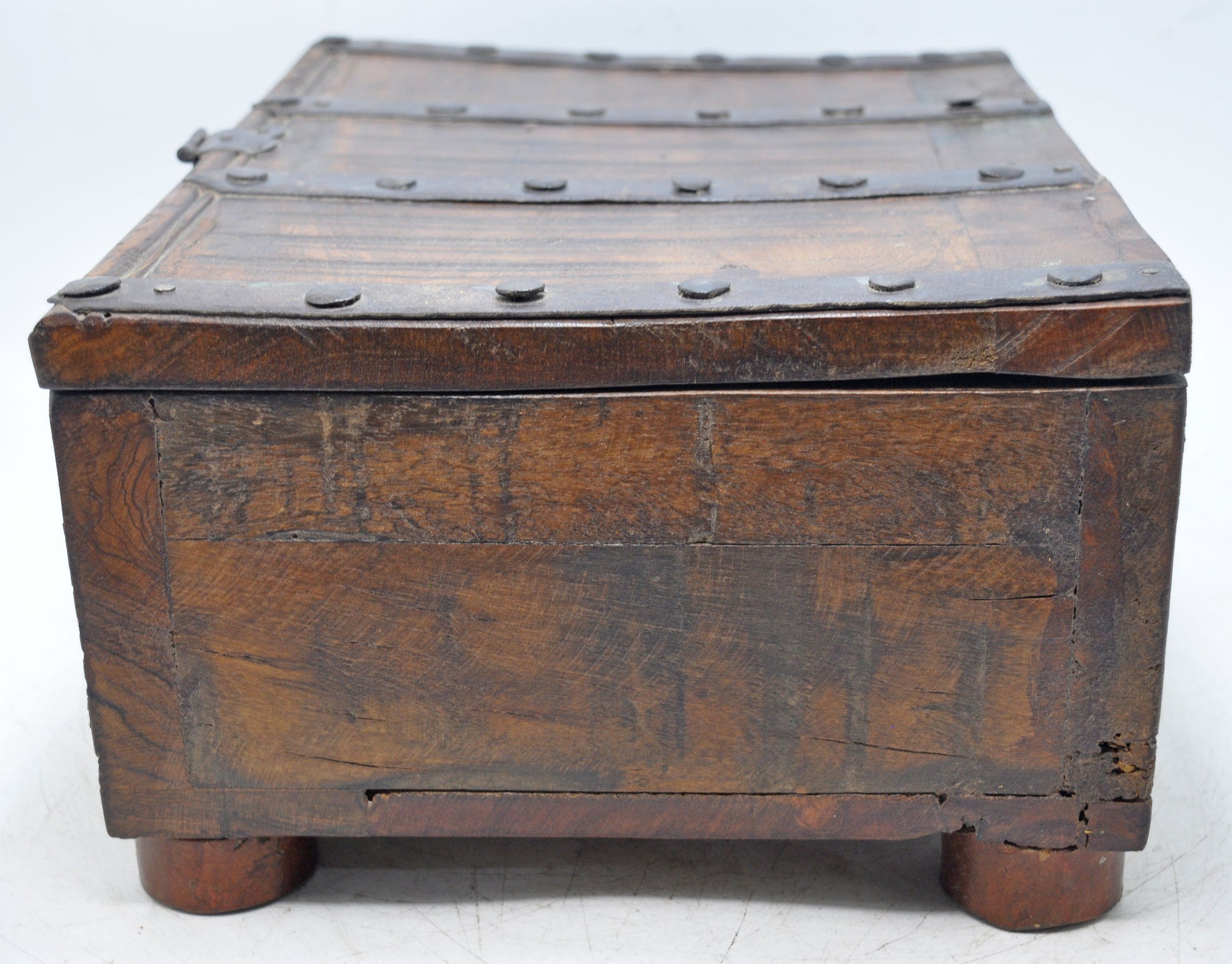Unearth the charm of this venerable wooden chest, a hand-crafted treasure from India. Its appealing silhouette is adorned with delicate carved borders and sturdy metal accents on its surface. Remaining in good condition, it possesses a profound, historic patina.