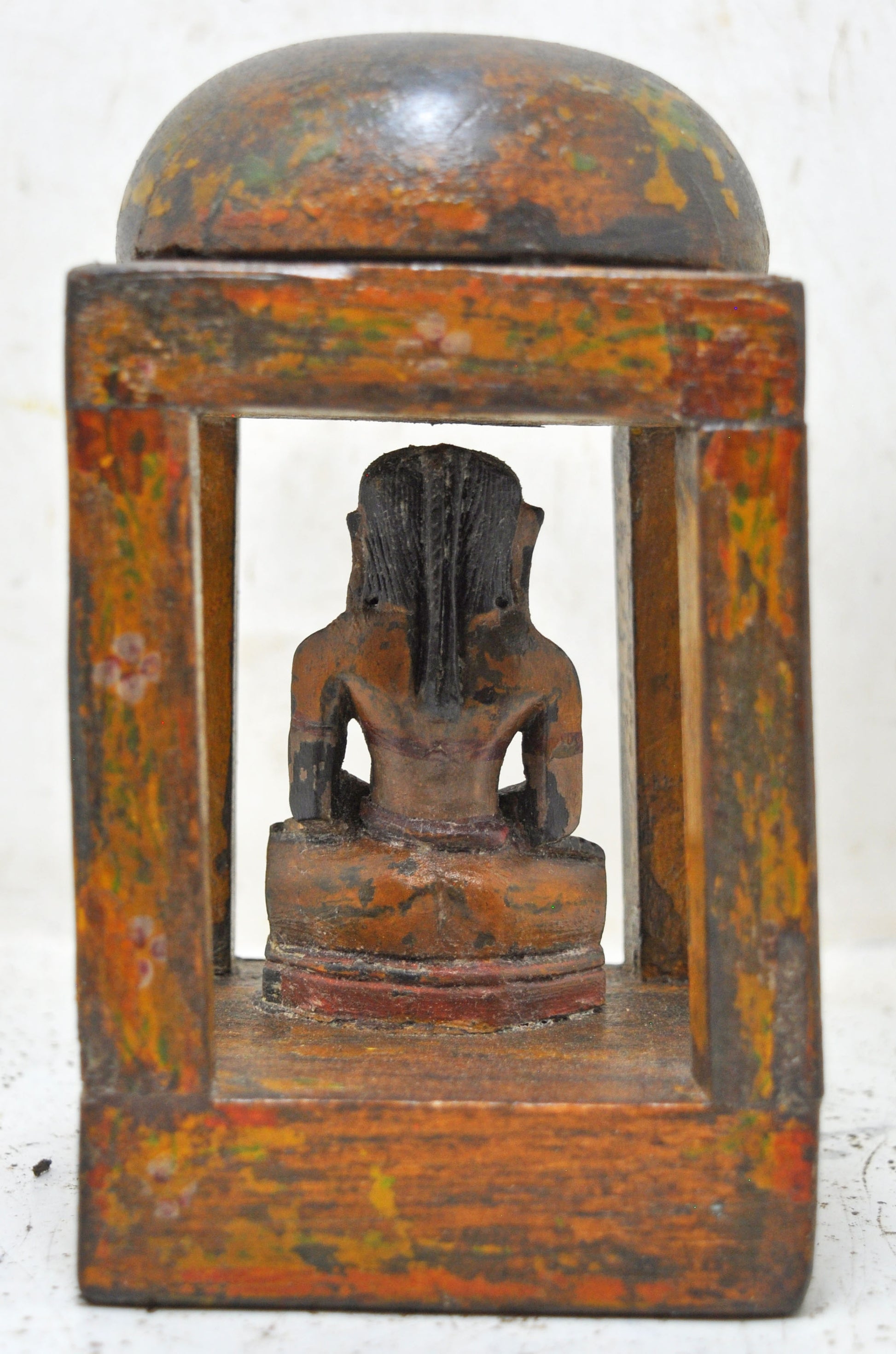 A beautiful old wooden small idol of Lord Mahaveer sitting in an arch. Hand carved with fine details. Good condition and a rich patina. Origin India.