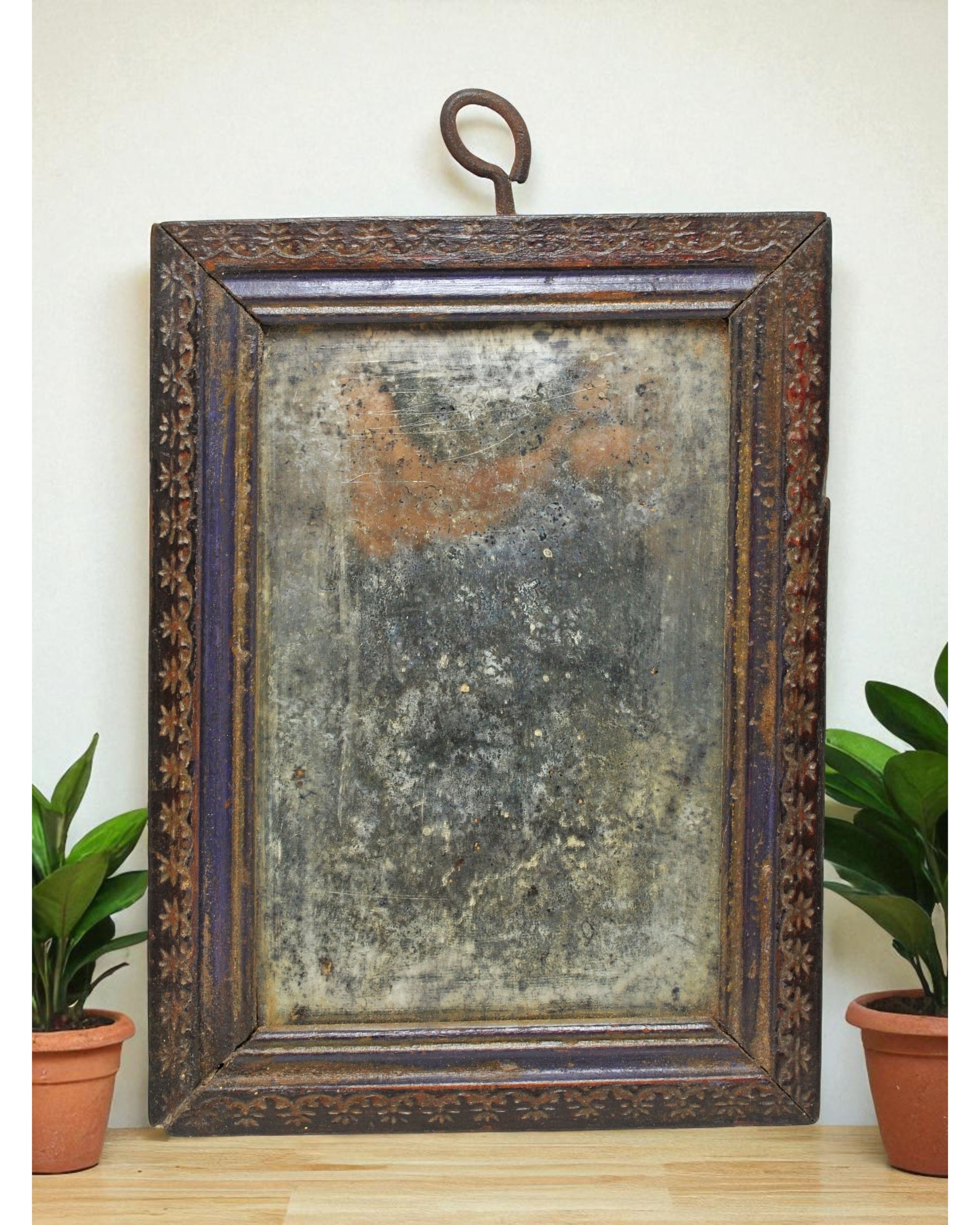 This vintage mirror frame, carved from wood and retaining its original antique glass, showcases cultural richness and craftsmanship. The aged patina across the wood enhances its authentic appearance, while the sturdy condition ensures durability. An antique with both beauty and function, it represents Indian tradition and artistry, ideal for those seeking unique and meaningful additions to their home décor.