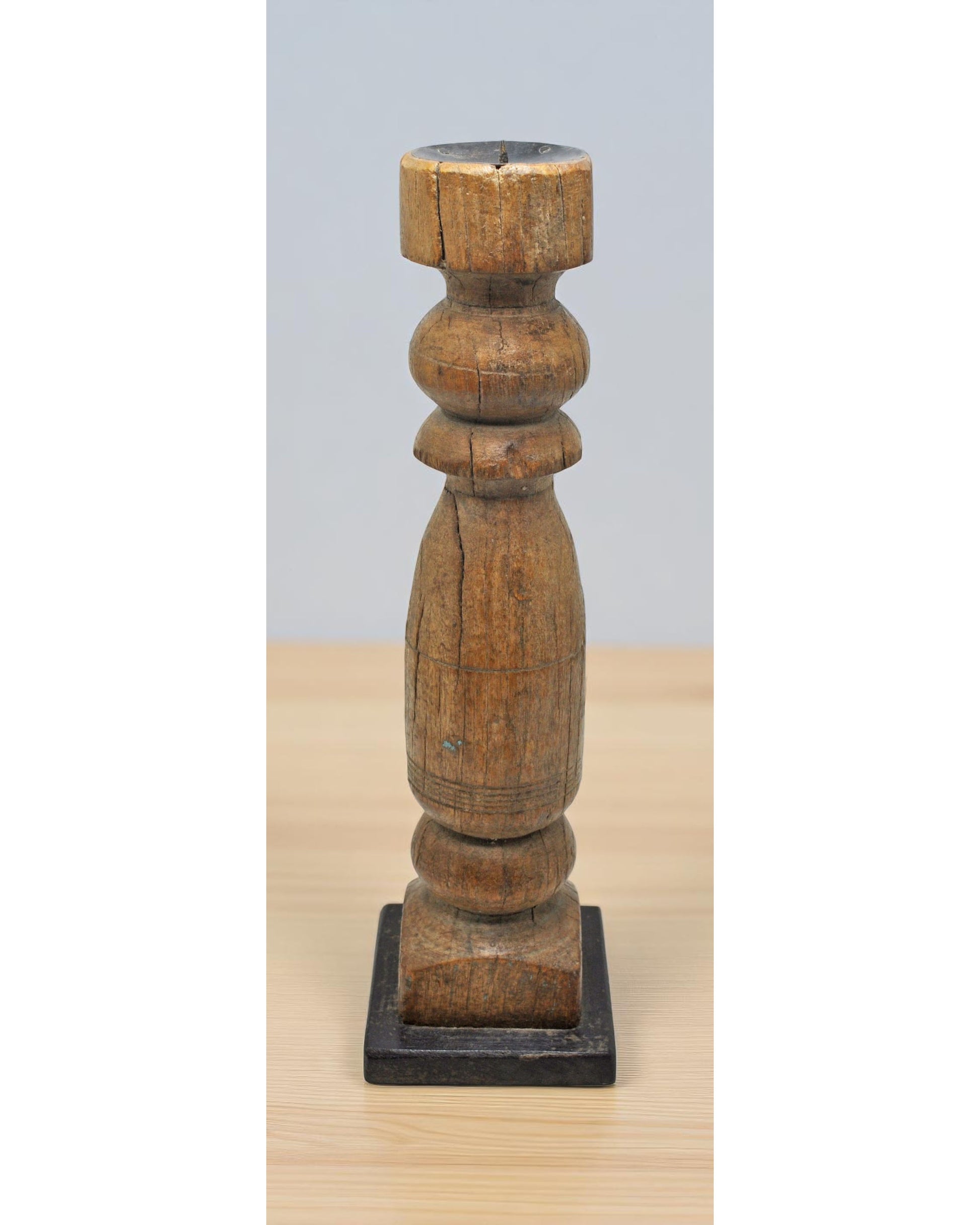 A touch of rustic elegance to your home with this distinctive old wooden candle holder. Hand-carved in an appealing shape from a repurposed daybed leg, it carries the charm of a rich patina. In good condition and originating from India, it's a perfect conversation starter.