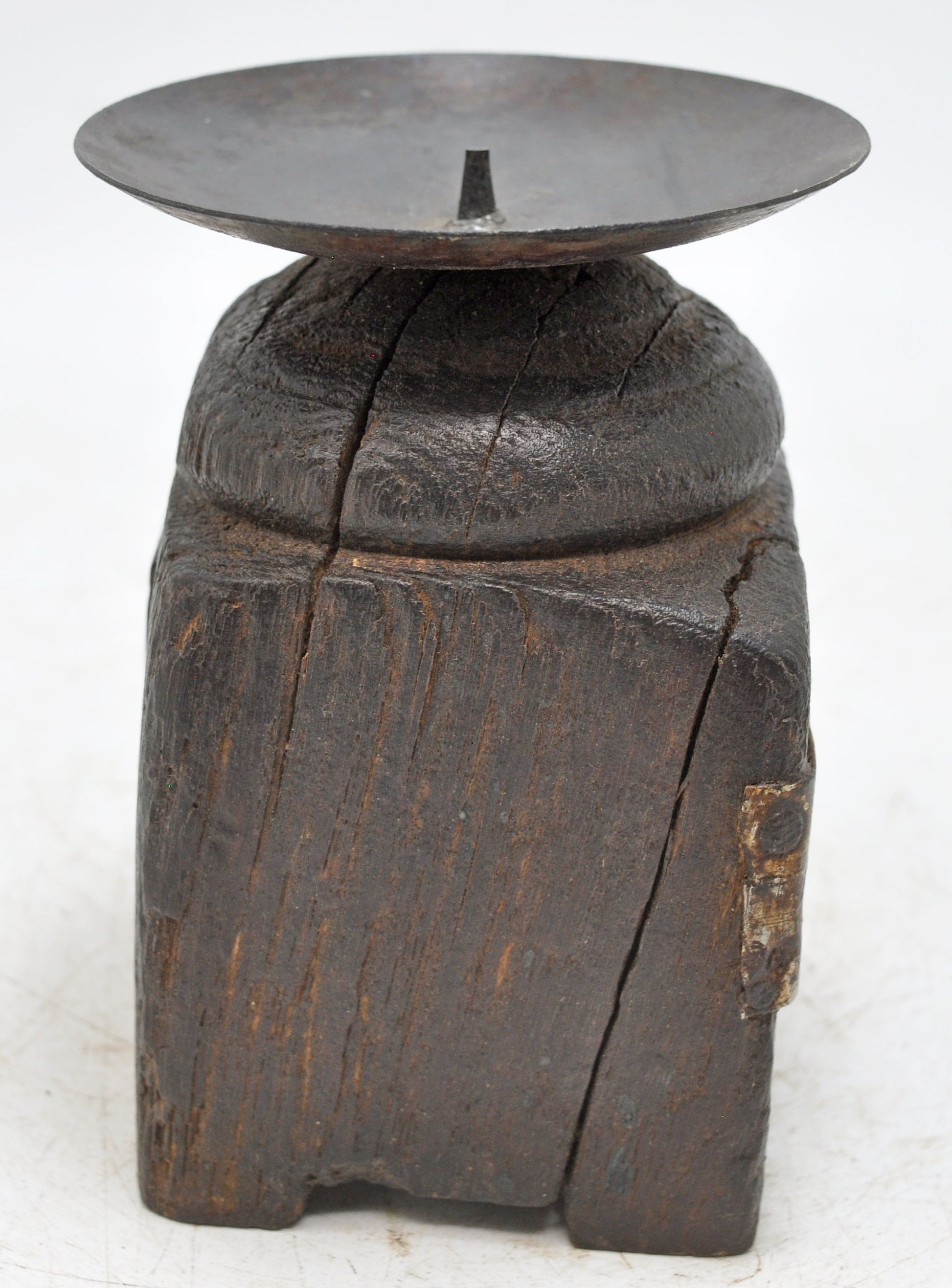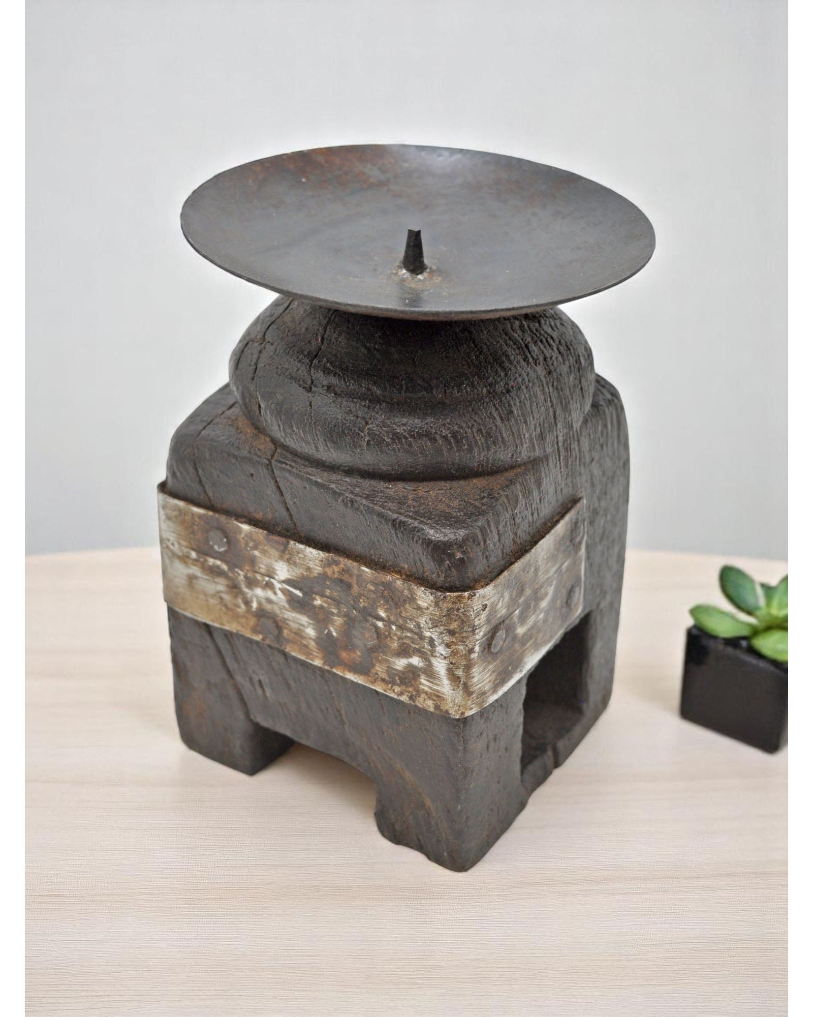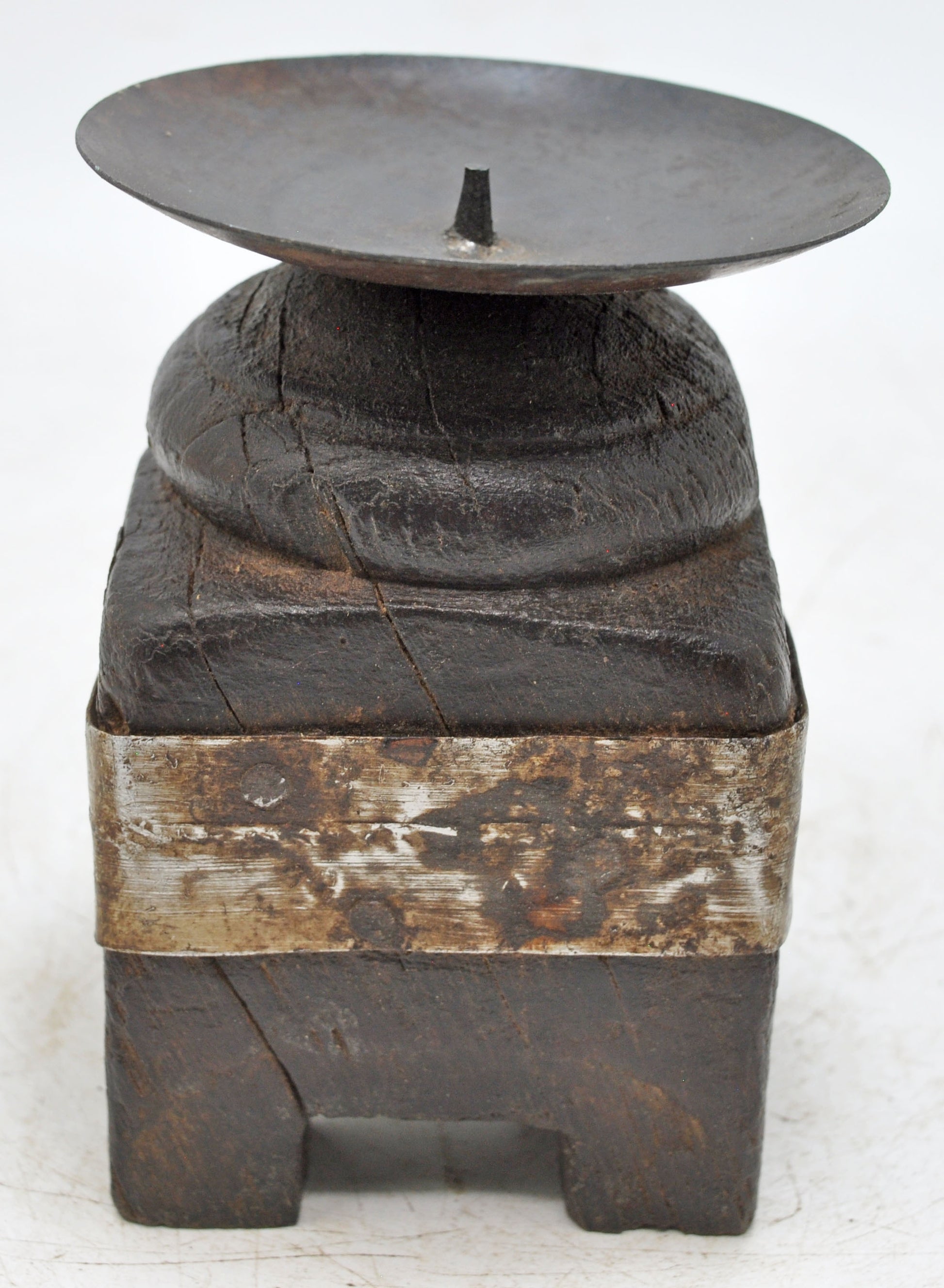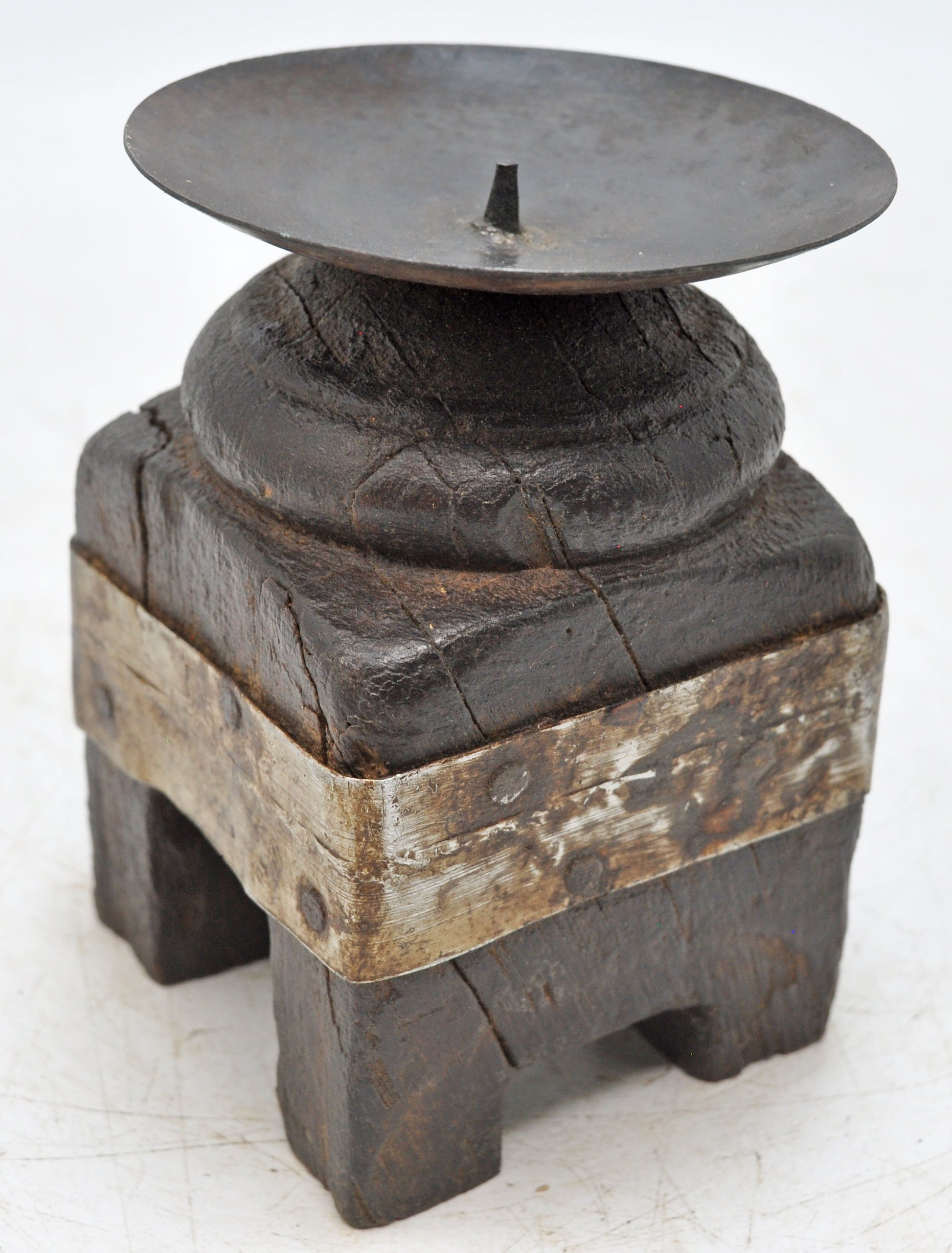 This is a nice looking old wooden candle holder. Hand carved in a nice shape. It is in good condition and has a rich patina. Its origin is India.