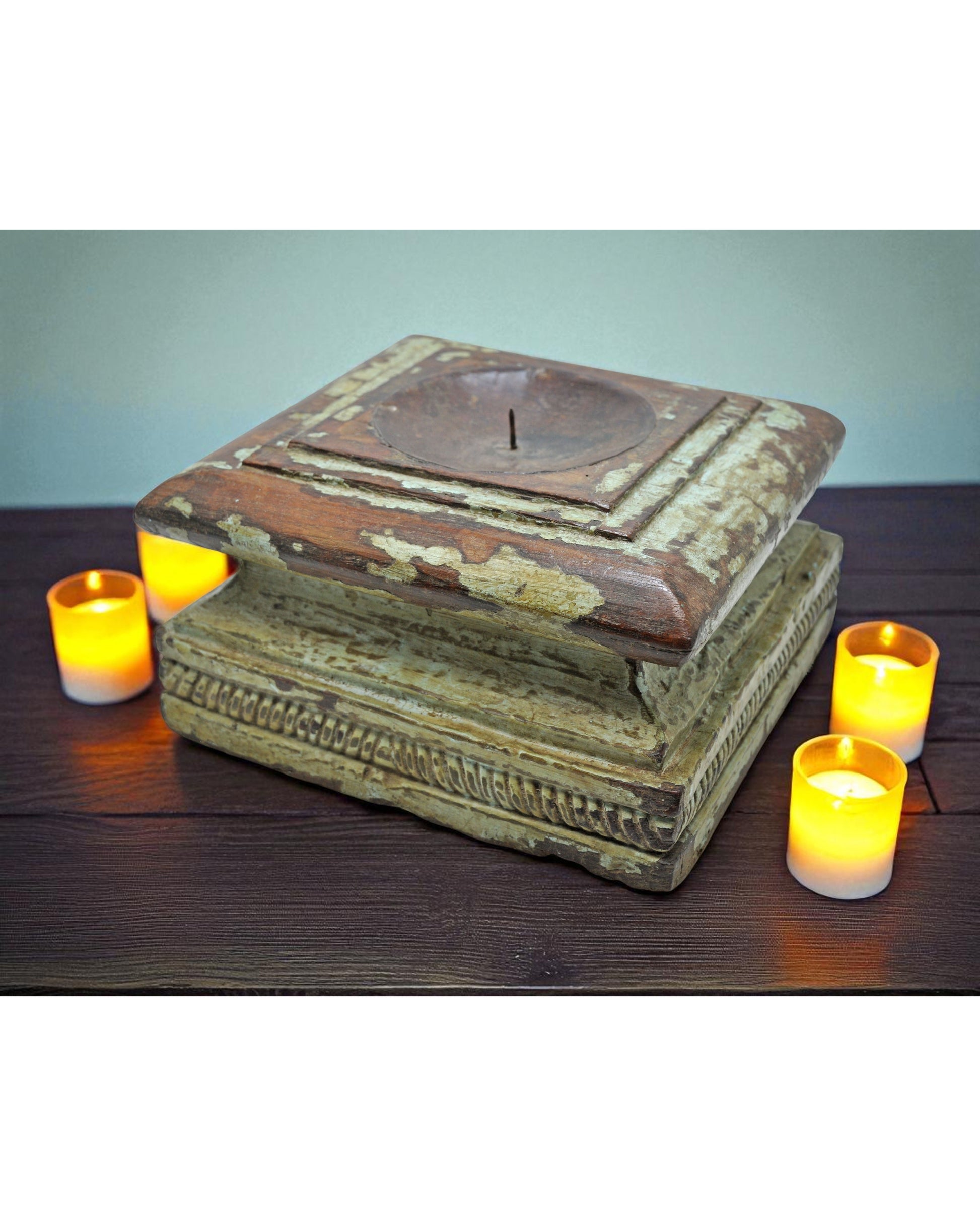 A truly captivating, vintage wooden upright element, once a structural base, now imbued with new purpose as an exquisite candle holder. Hand-carved with a pleasing contour, it boasts its unaltered, rustic hue. It remains in pristine condition, revealing a lustrous, genuine surface aging that speaks to its provenance from Jodhpur, Rajasthan, India.