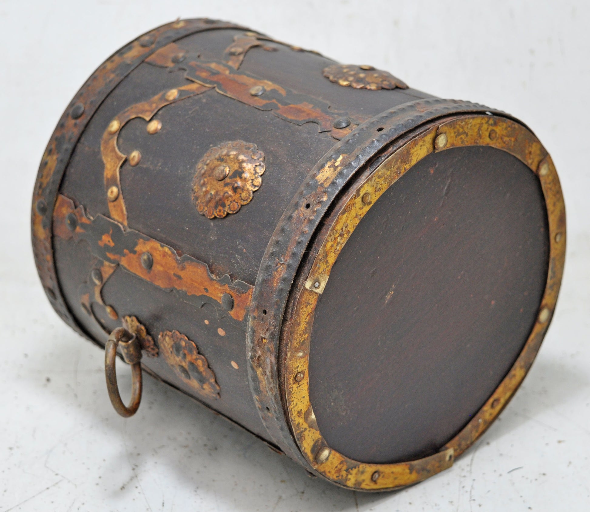 A nice looking old wooden round pot originally used for measuring grains. Hand crafted in a nice shape and brass fitted on wood. Good condition and a rich patina. Origin India.