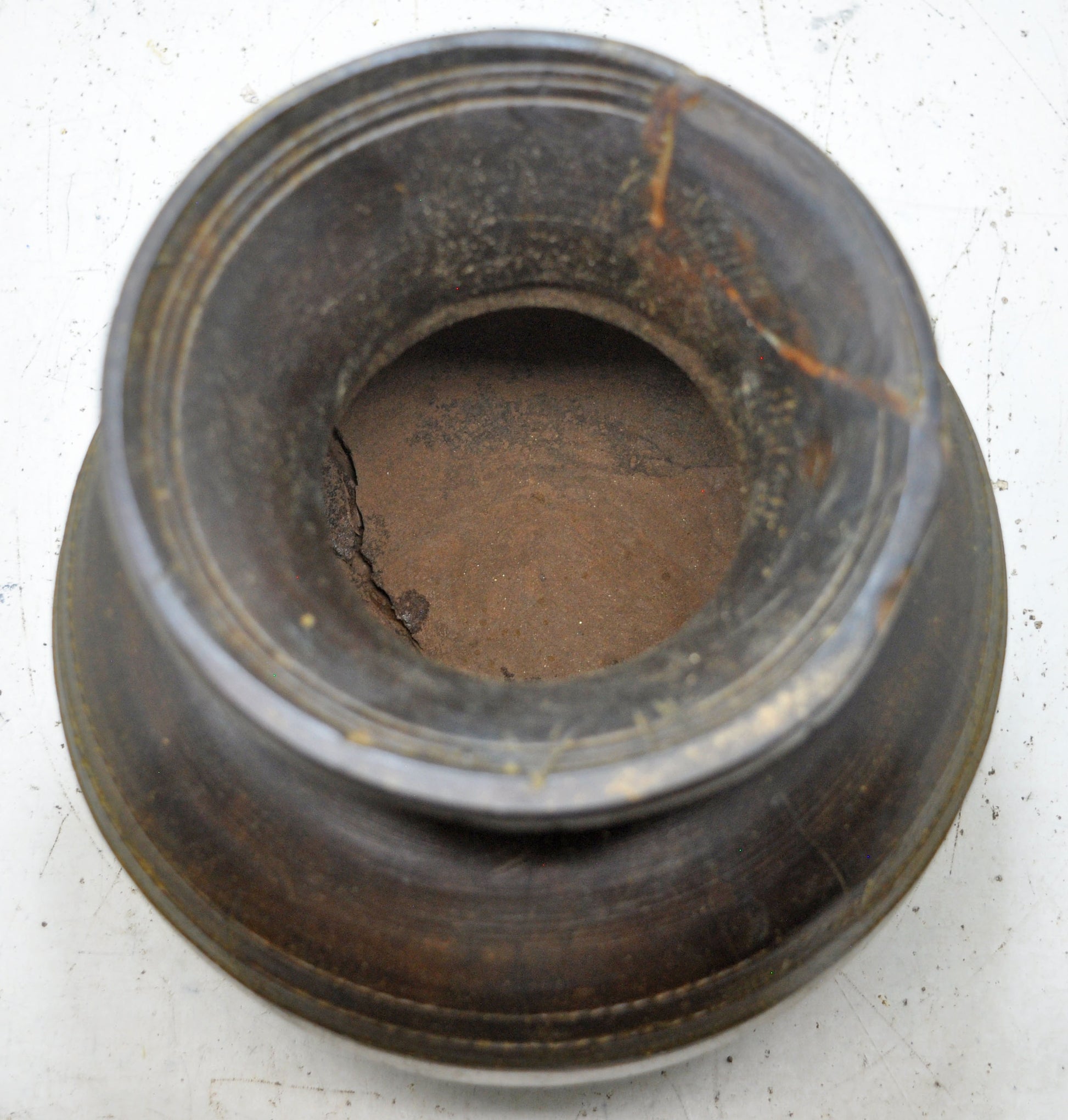 A nice looking old wooden round pot originally used for storage water. Hand crafted in a nice shape. Good condition and a rich patina. Origin India.