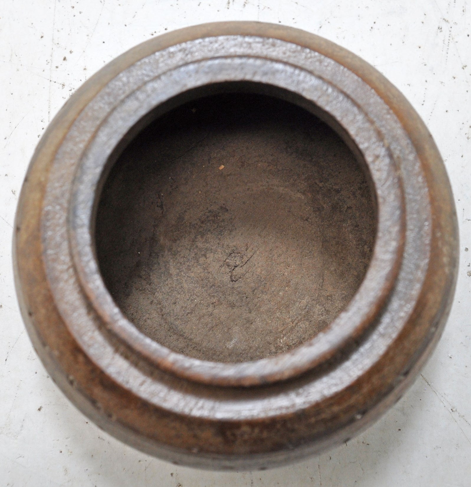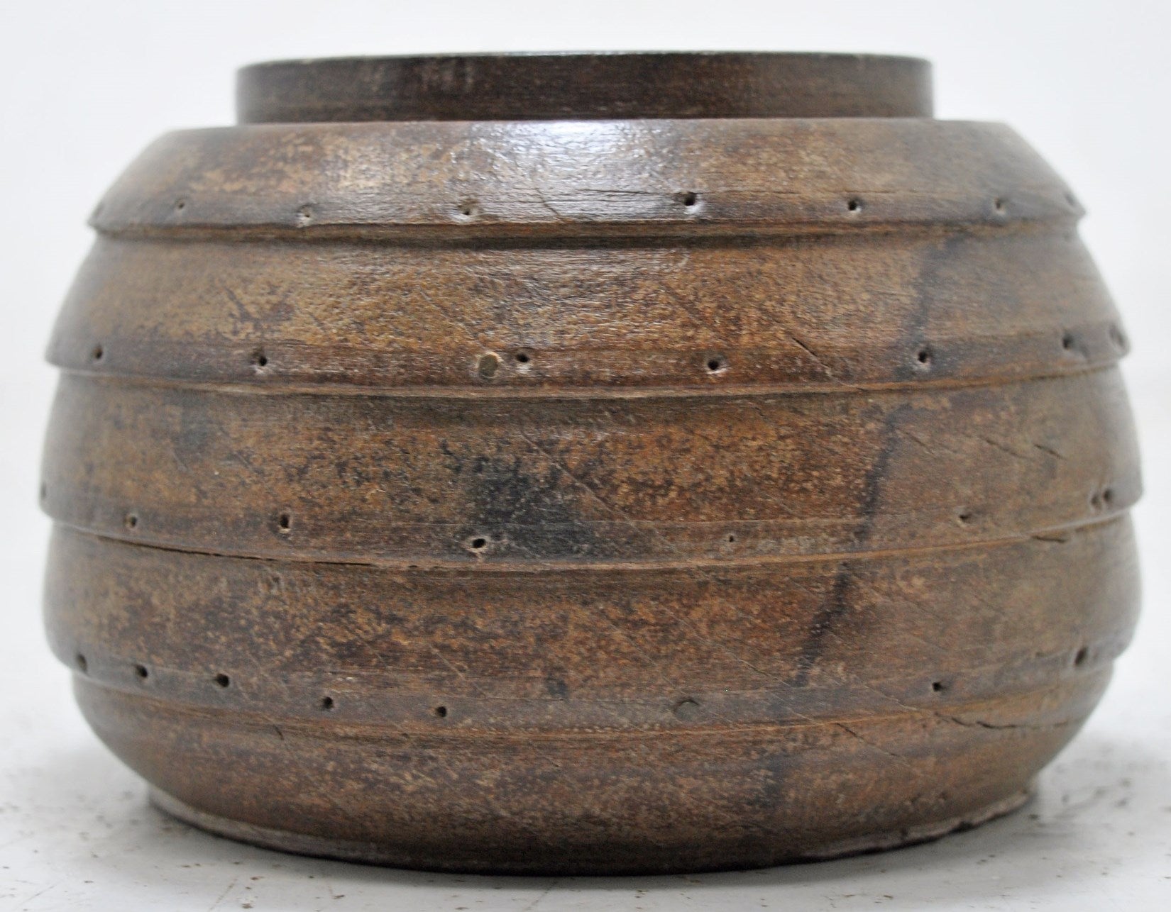 A nice looking old wooden round pot. Hand crafted in a nice shape. Good condition and a rich patina. Origin India.