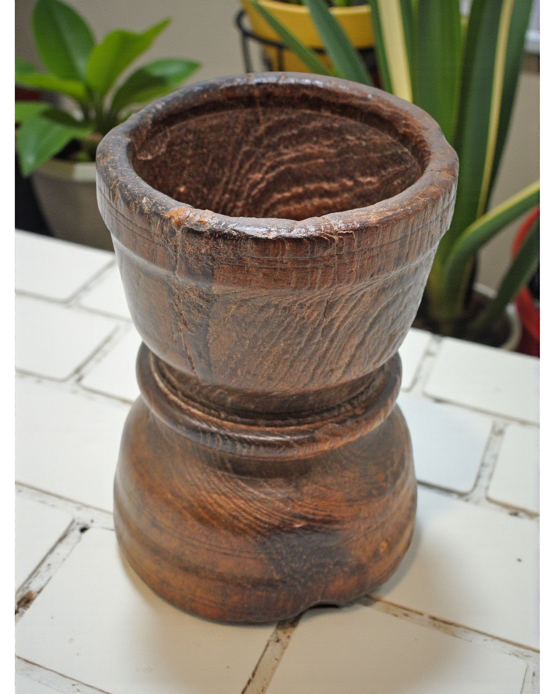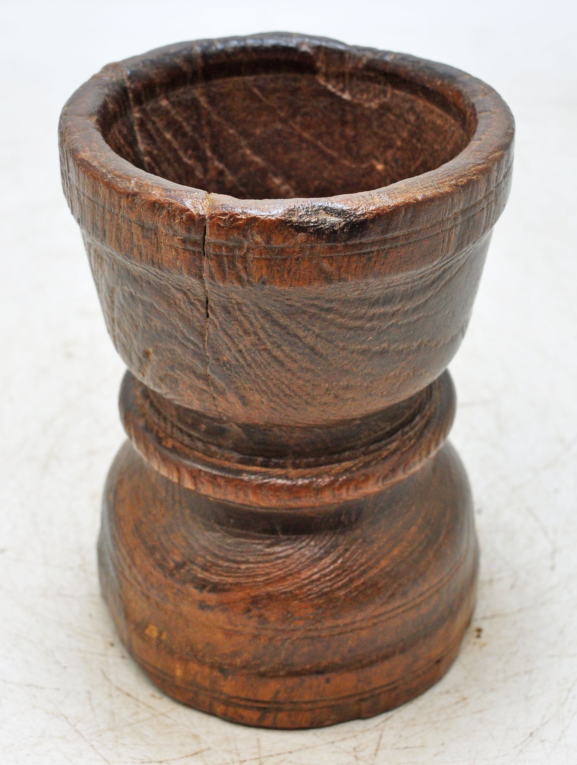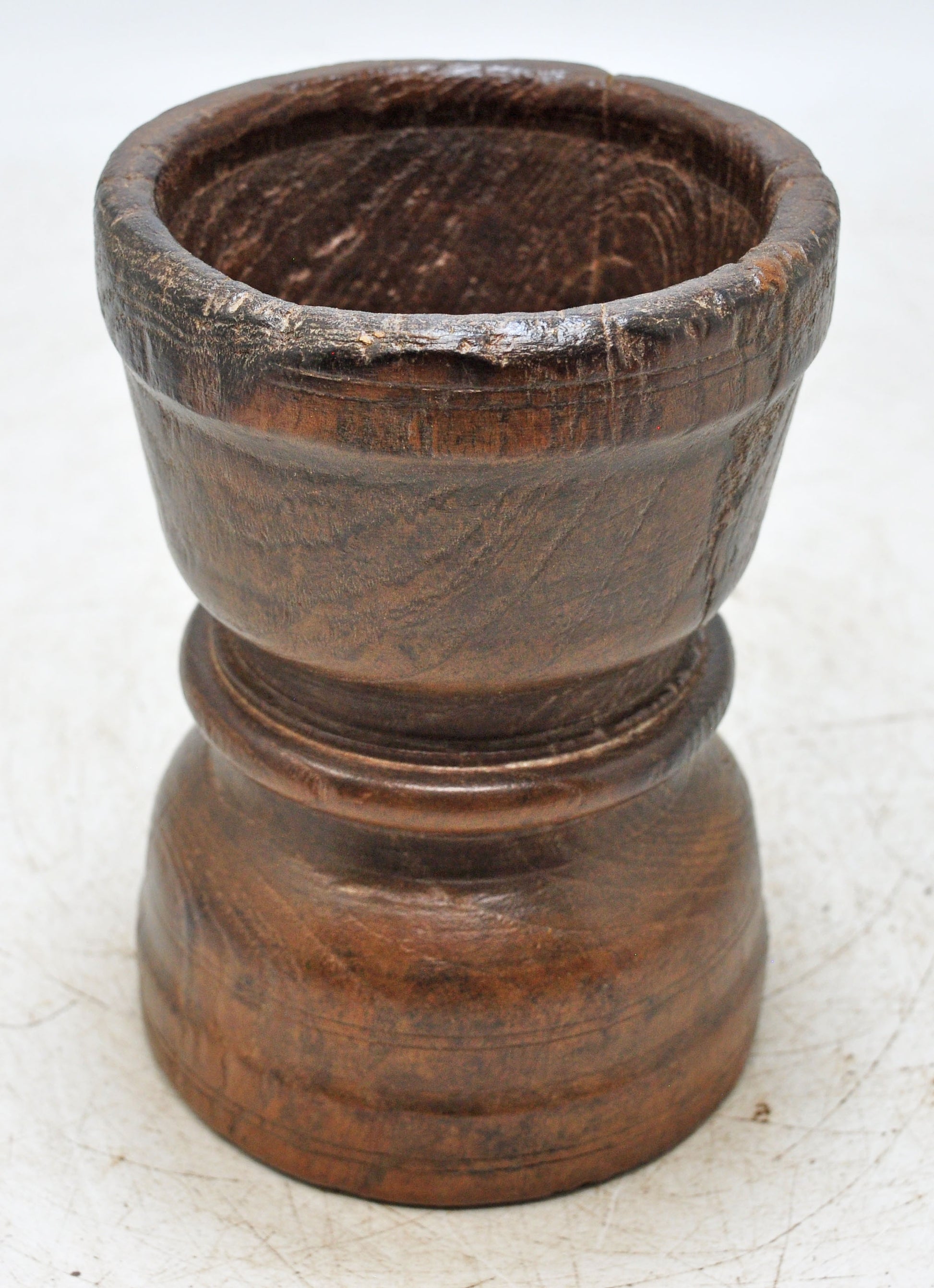 A charming old wooden spice grinding vessel, hand-sculpted with smooth curves and intricate surface details, displaying a rich, aged patina and preserved in very good condition, originating from India, this unique piece embodies centuries of skilled woodwork, practical functionality, and the enduring elegance of handcrafted culinary utensils treasured by collectors of antique household items.