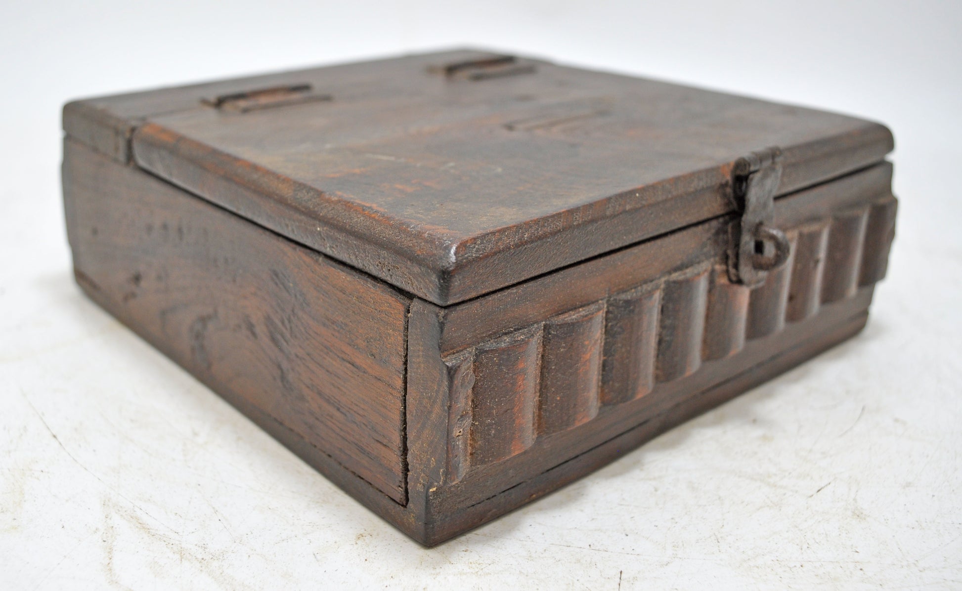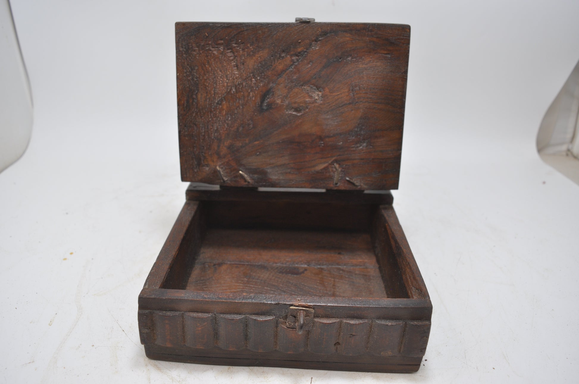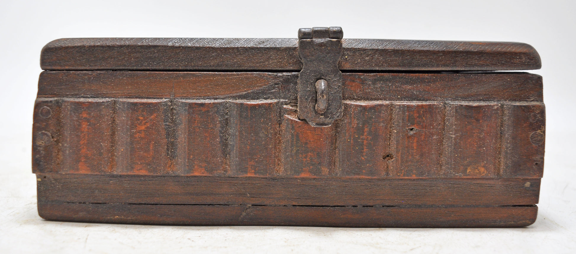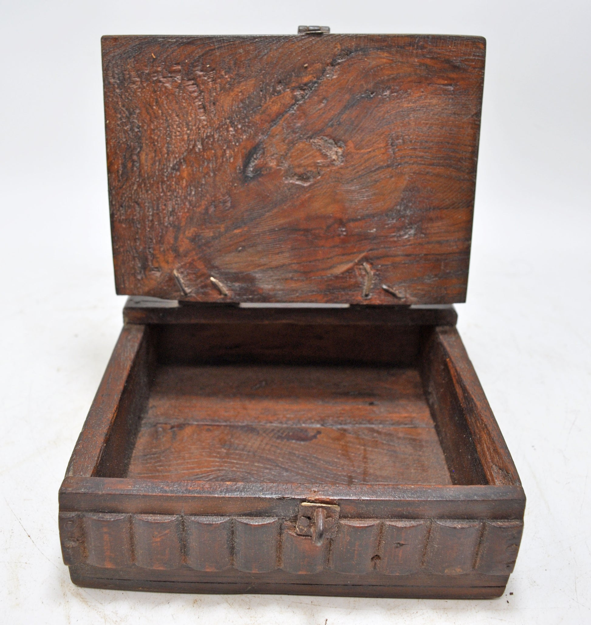 A nice looking old wooden storage box. Hand crafted in a nice shape. Good condition and a rich patina. Origin India.