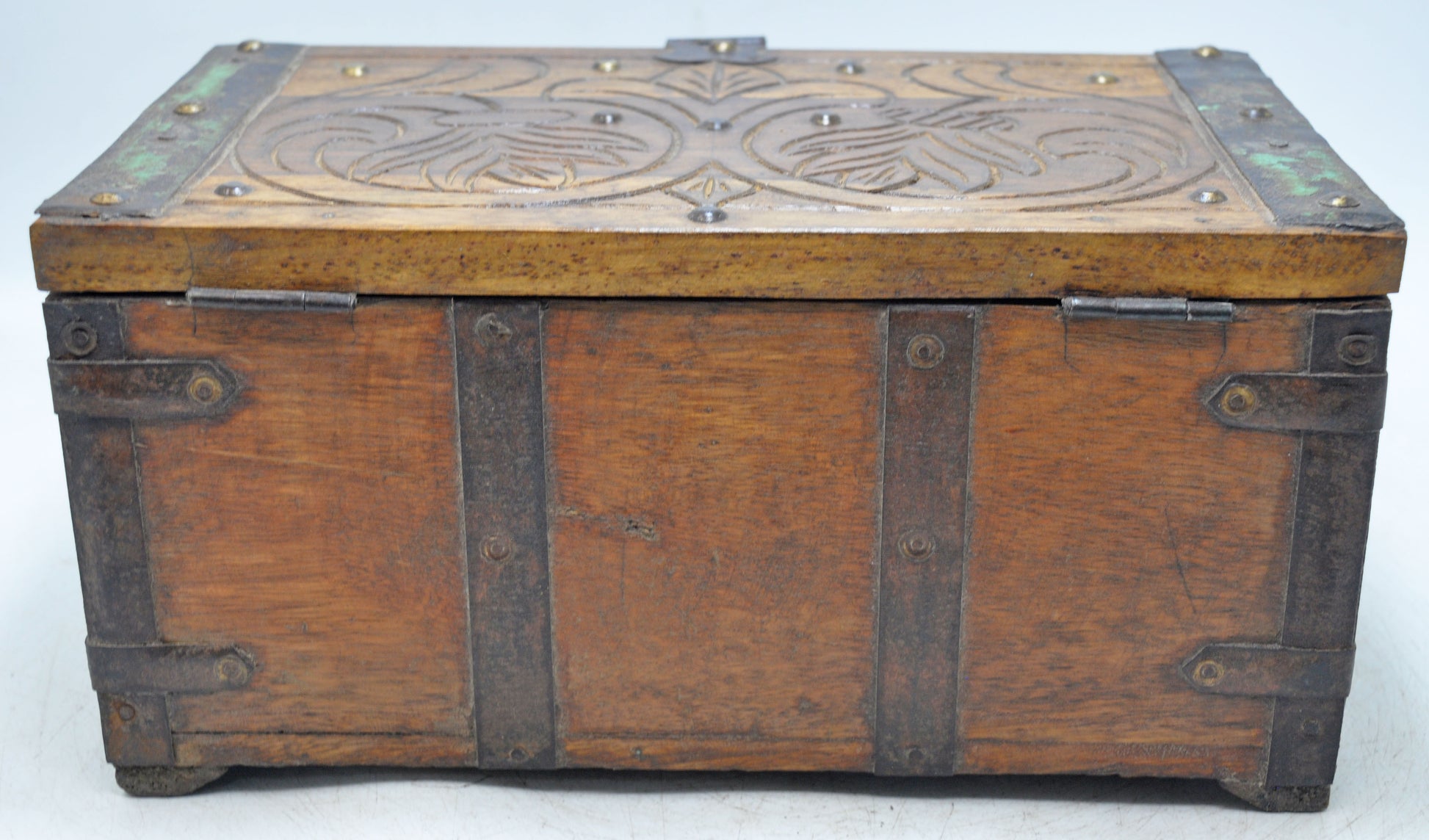 Antique Wooden Storage Chest Box Original Old Hand Crafted Carved Metal Fitted
