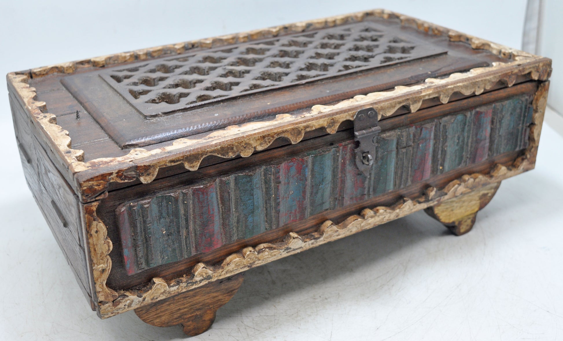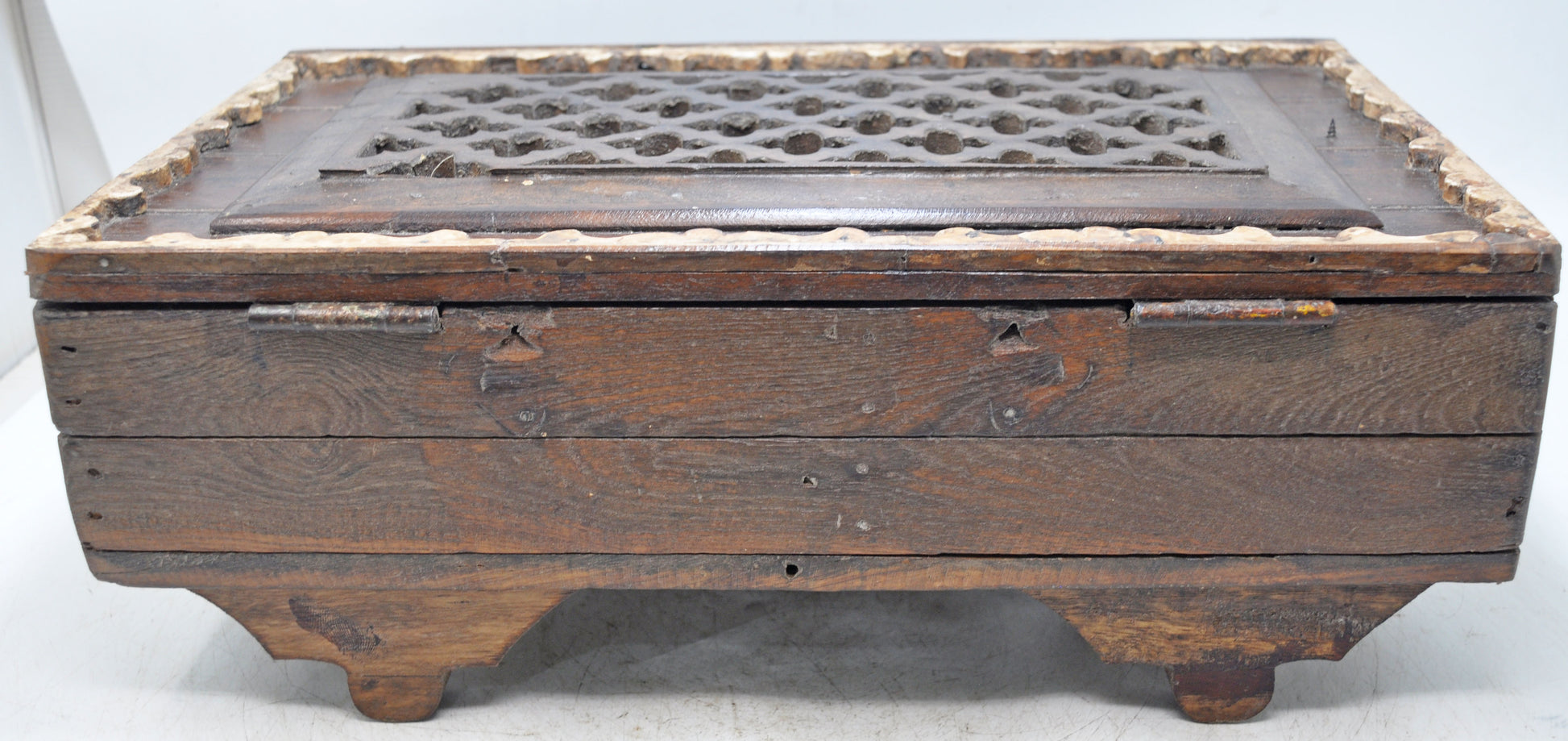 A finely made antique wooden chest box that reflects traditional Indian craftsmanship. The hand-carved borders and decorative jali work on the lid give it an appealing aesthetic. Inside, it contains several compartments and a protective cover, ideal for organizing items. It survives in strong condition, bearing a rich, aged surface patina that adds character and authenticity. Origin: India.