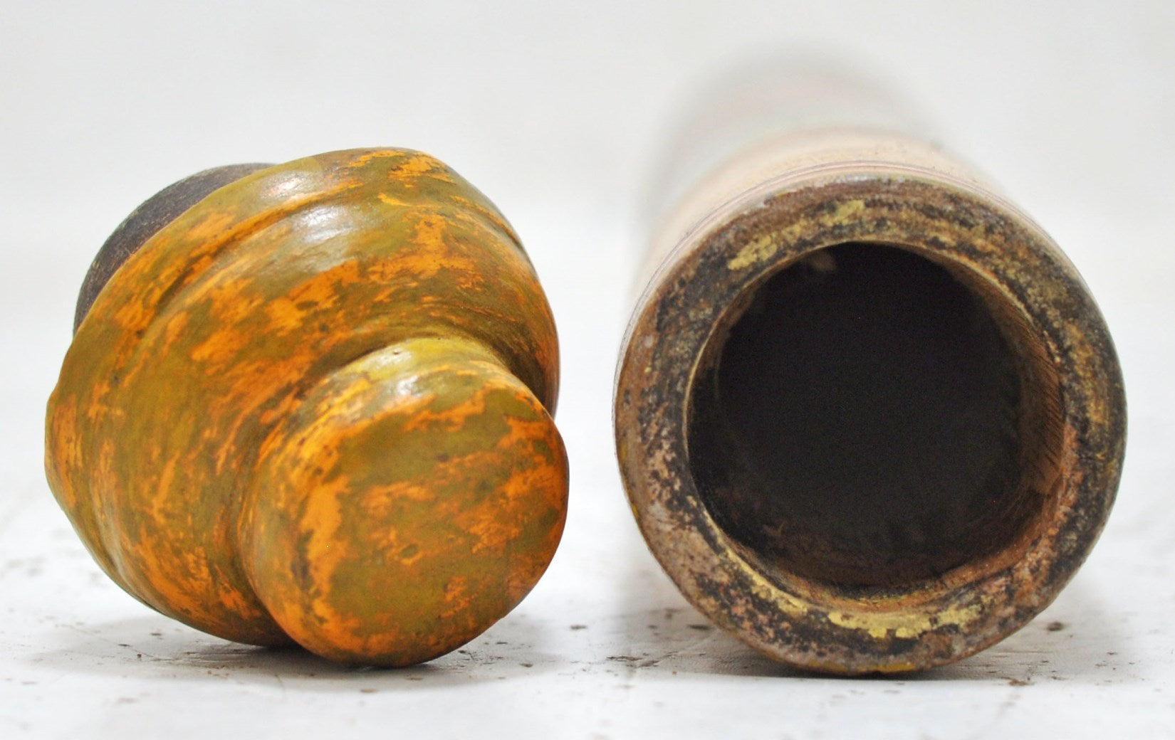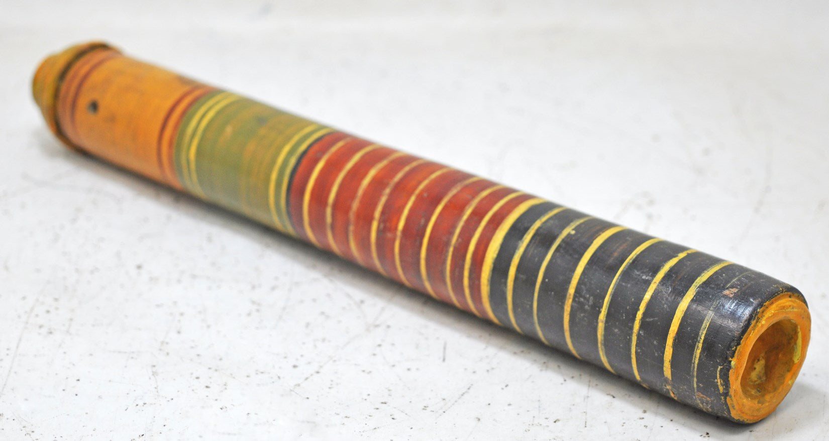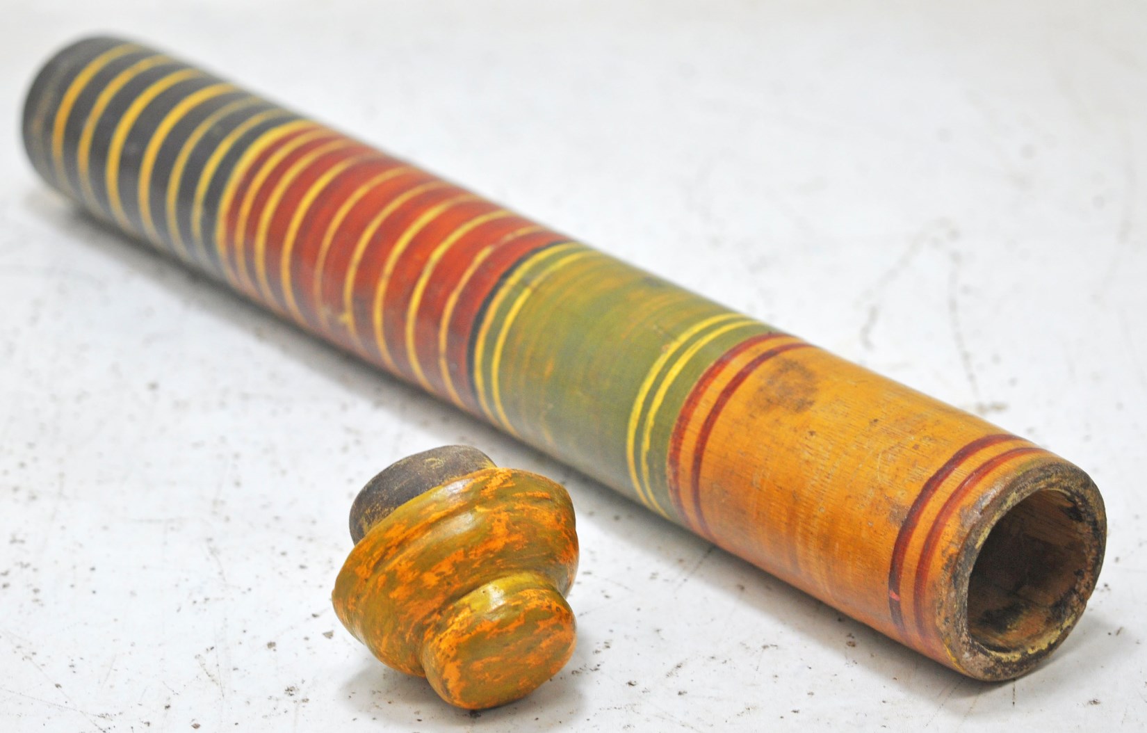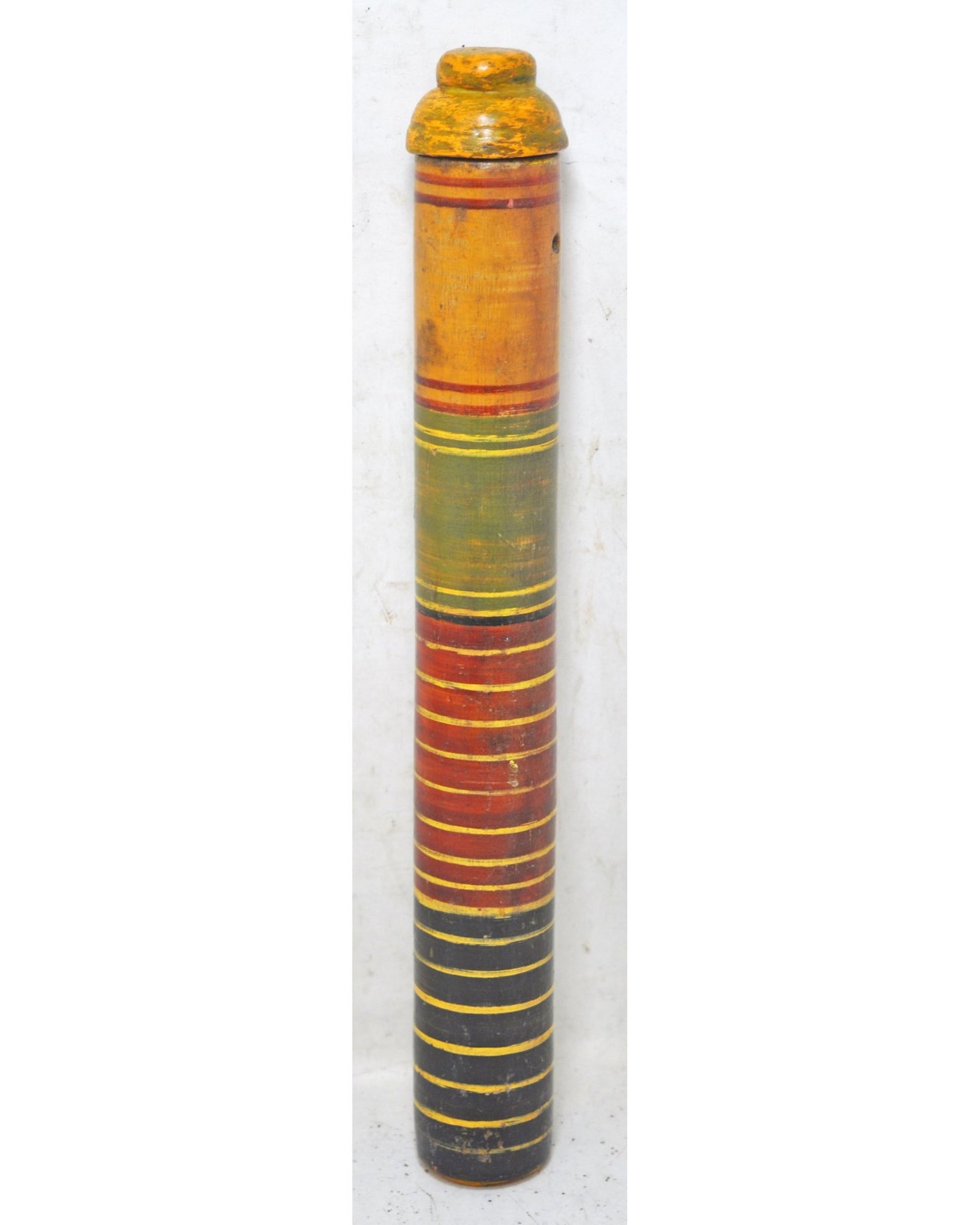 A nice looking old wooden round and tall box originally used for keeping paper scrolls. Hand carved in a nice shape and finely hand painted. Good condition and a rich patina. Origin India.