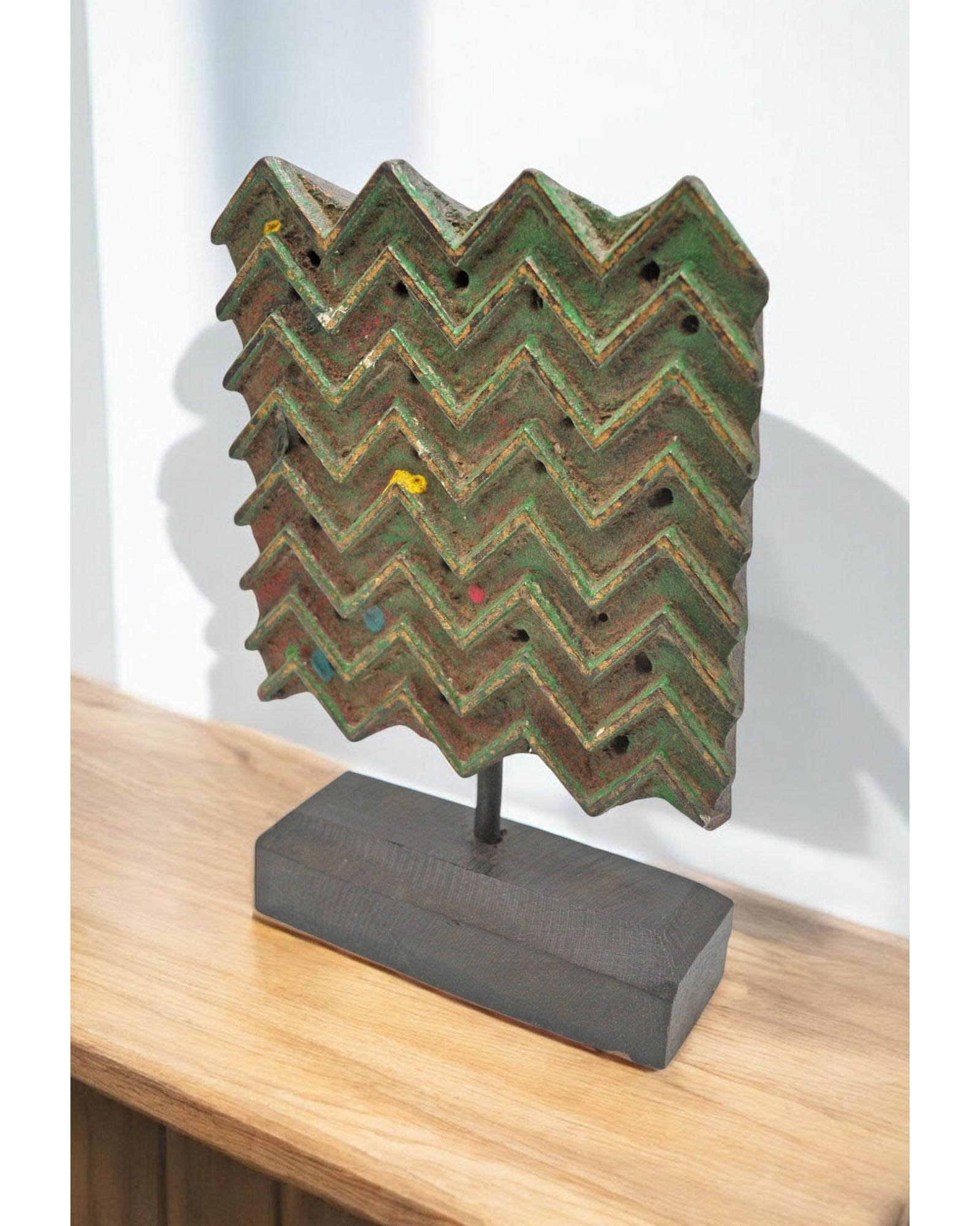 This exquisite antique wooden textile printing block carving originates from India and showcases intricate hand-carved patterns refined through skilled craftsmanship. Mounted elegantly on a sturdy stand, it serves not only as a functional tool historically used in traditional fabric printing but also as a distinguished decorative piece. Preserved in good condition, its rich patina testifies to its age and authenticity, adding depth and warmth to any setting. An exceptional collector’s item, this piece offers a refined glimpse into artisanal heritage while elevating your space with its timeless charm and cultural significance.