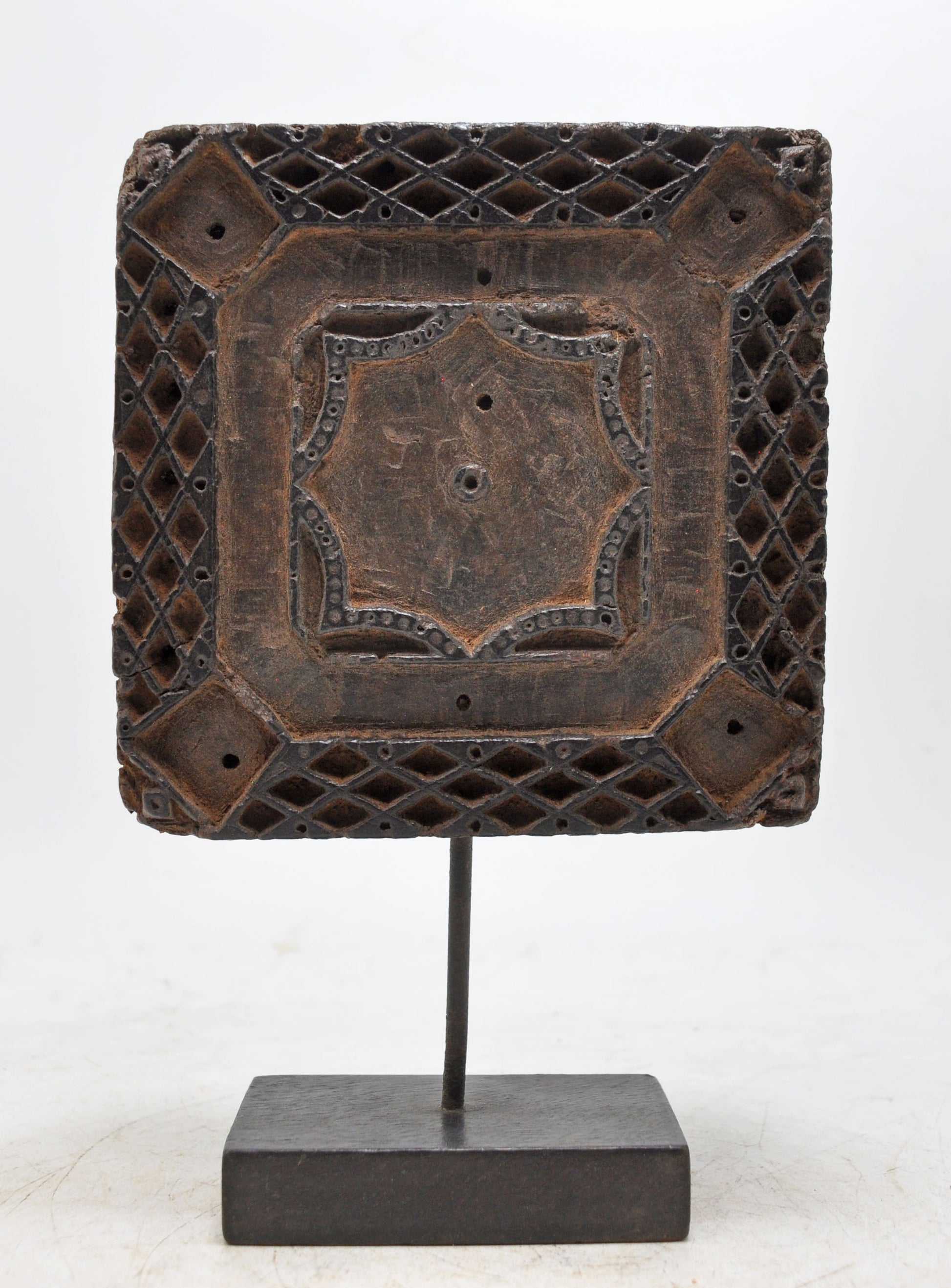A nice looking old wooden printing block used in textiles. Hand carved with nice details and mounted on a stand for display. Good condition and a rich patina. Origin India.