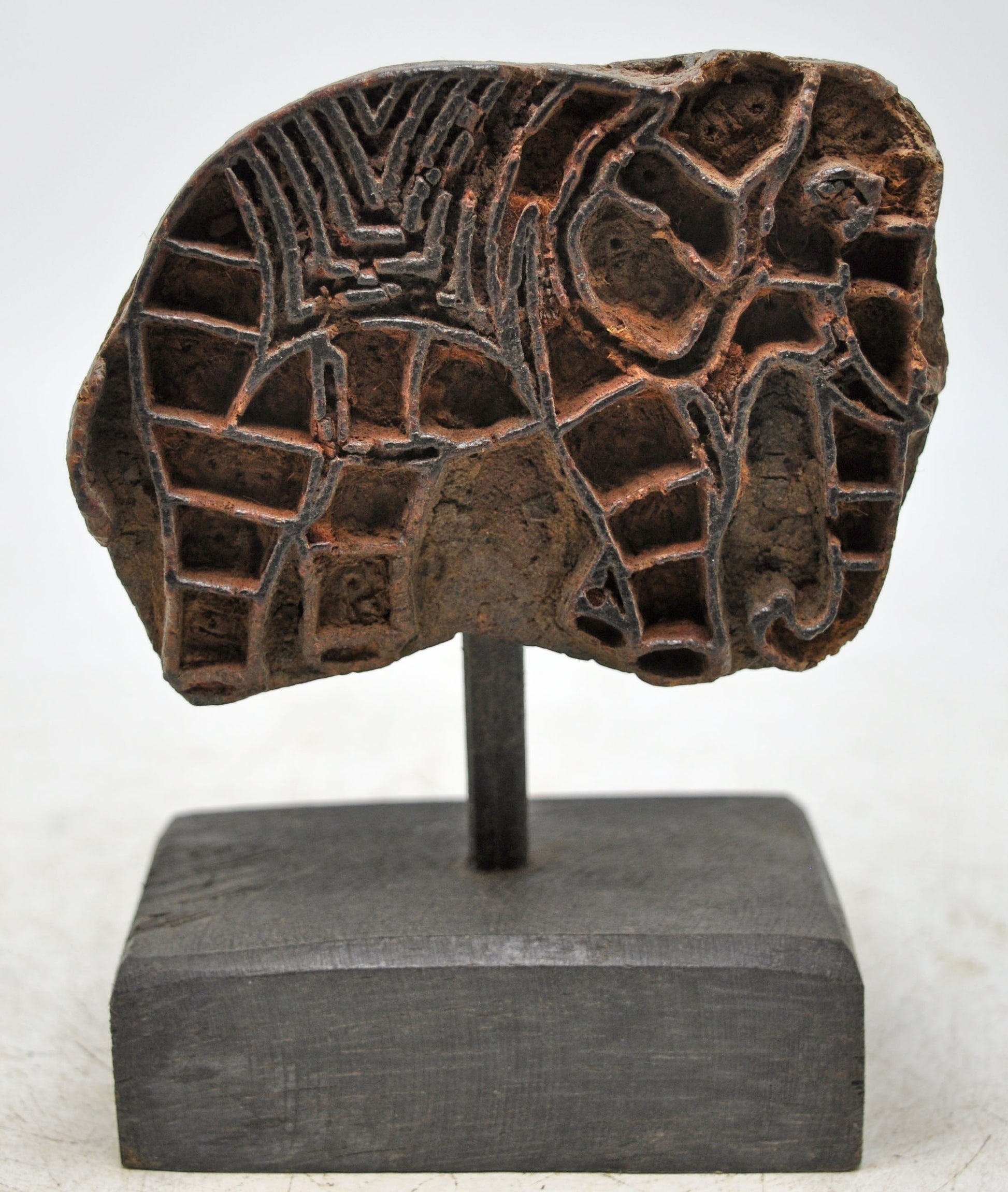 This is a nice looking old wooden textile printing block. It's hand carved in a nice shape with an elephant motif, and it's mounted on a stand for display. It's in good condition, and it has a rich patina. This item was originally from India.
