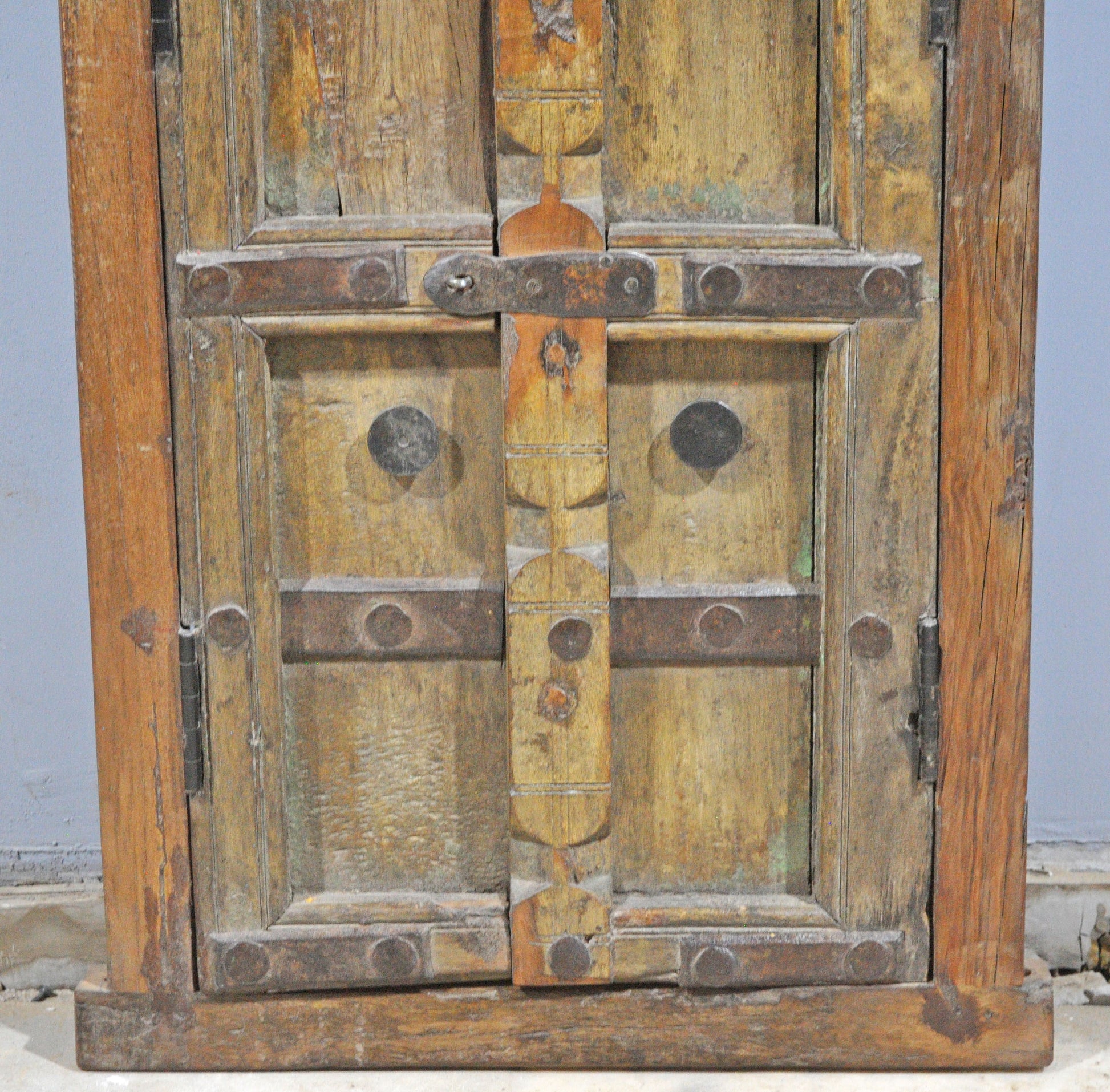 An original large wooden window frame with two panels, finely hand crafted and adorned with carved shapes throughout. The aged wood reveals a rich patina that emphasizes its early character and authenticity. Carefully preserved and in good condition, the frame retains strong presence. From India, this piece is ideal for wall décor or architectural display.