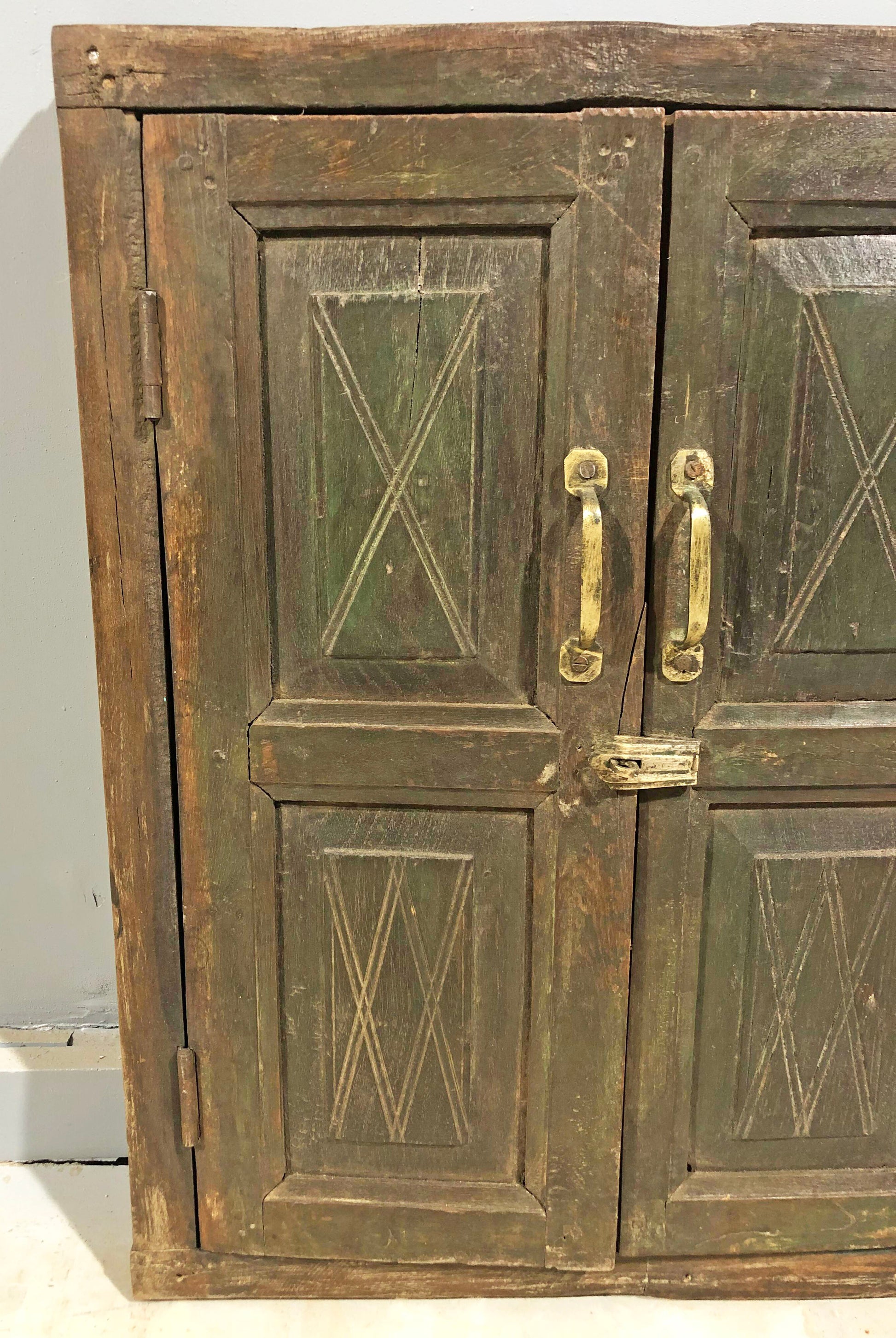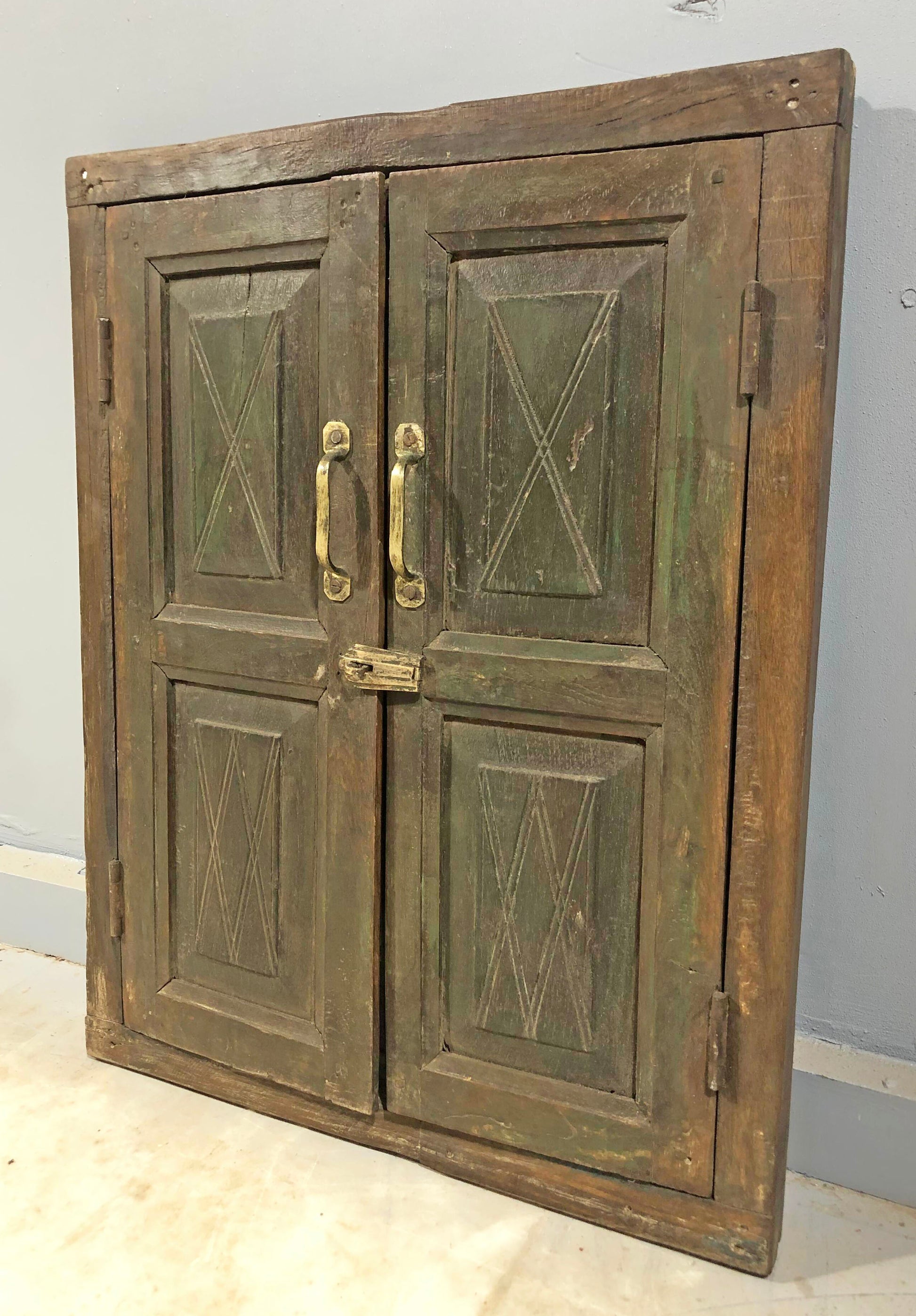 This antique wooden window frame features 2 panels and was originally sourced from old houses. It showcases expert hand-crafted design and intricate carved wooden doors with authentic polychrome coloring. In good condition with a rich patina, this piece originates from India.