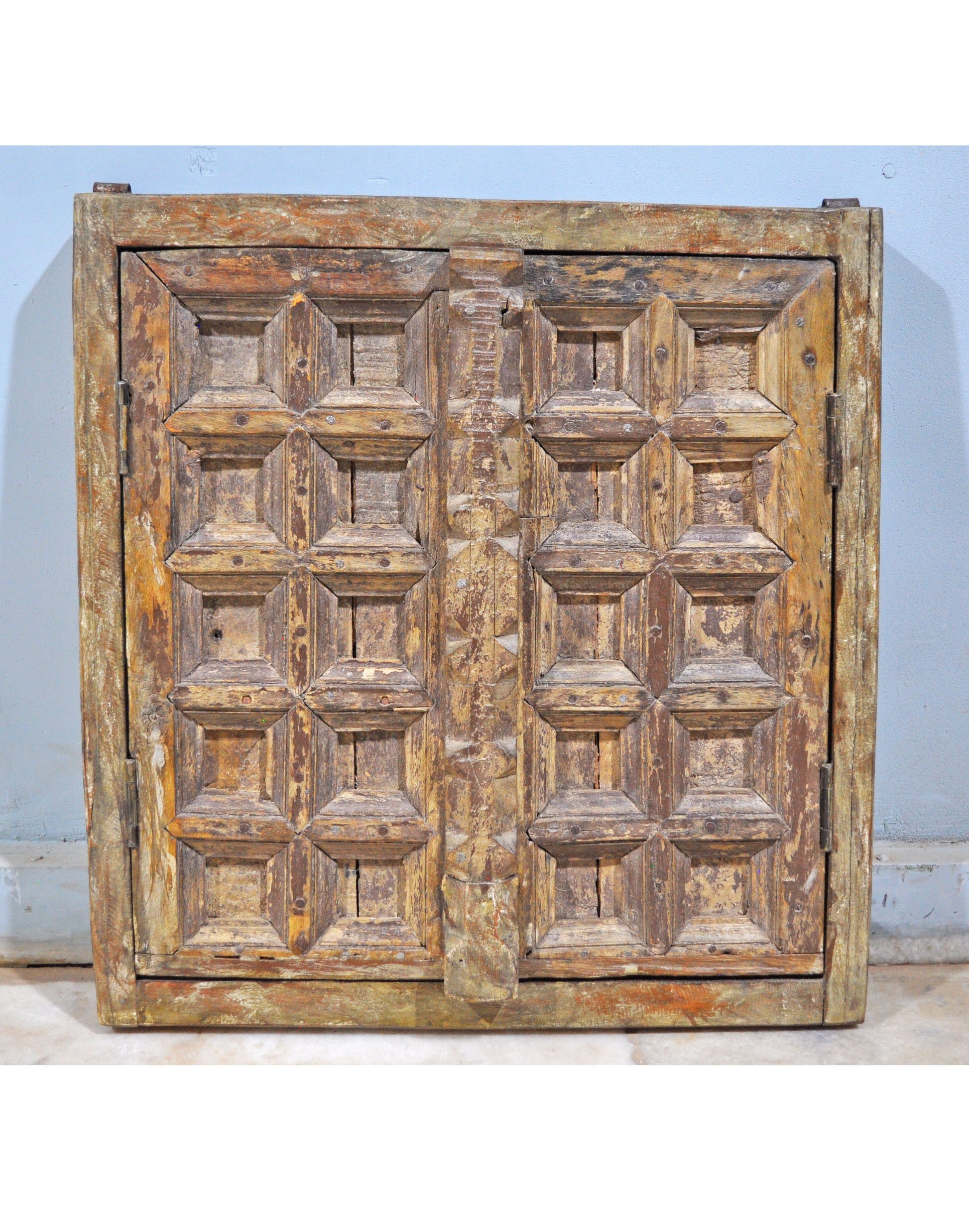 Antique Wooden Wall Décor Window Panel With Frame Square Blocks Crafted