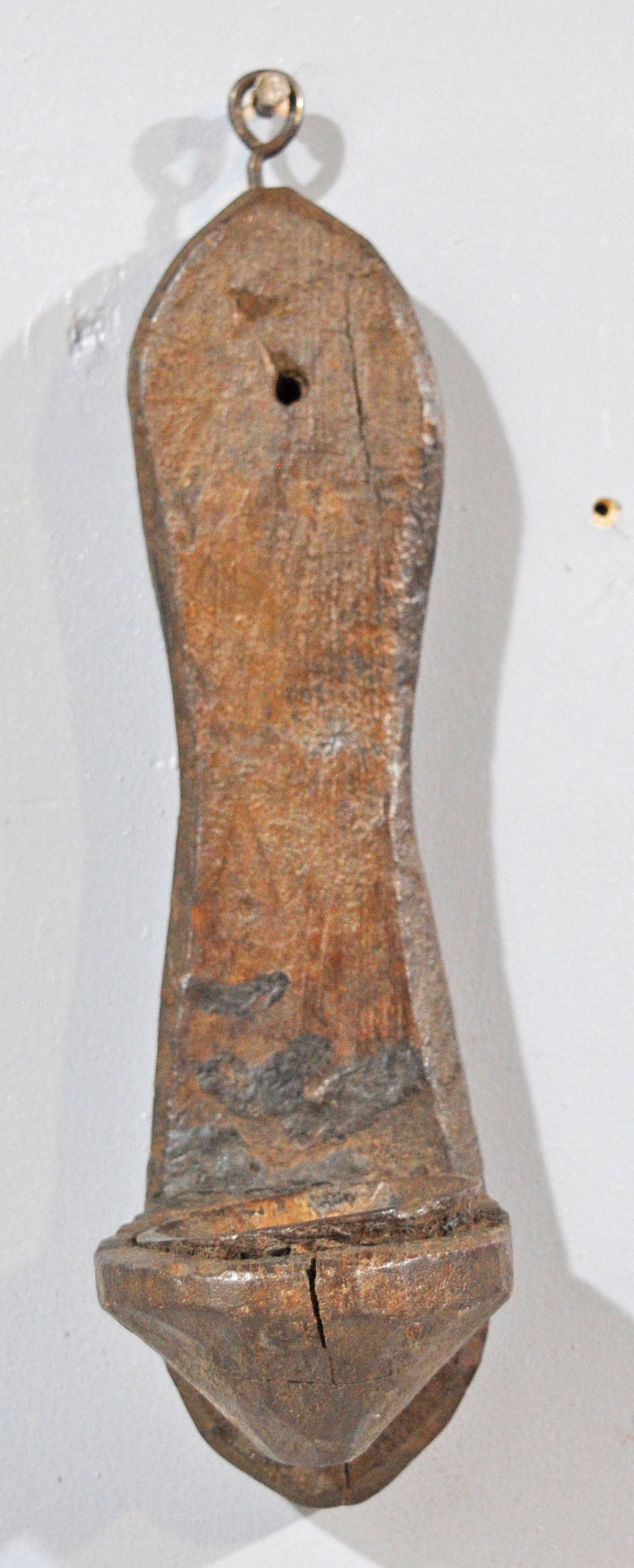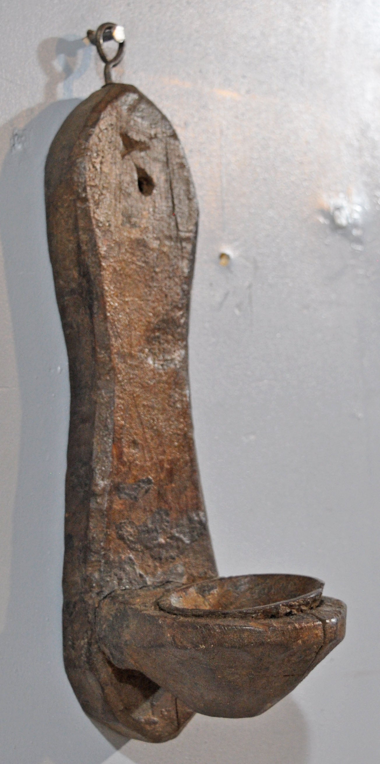 This old wooden wall-mounted candle holder features intricate hand-carved details and a charming shape. The rich patina adds depth and historic character, highlighting its vintage appeal. Originating from India, it is well-preserved, in good condition, and perfectly suited as a decorative and functional piece of traditional craftsmanship.