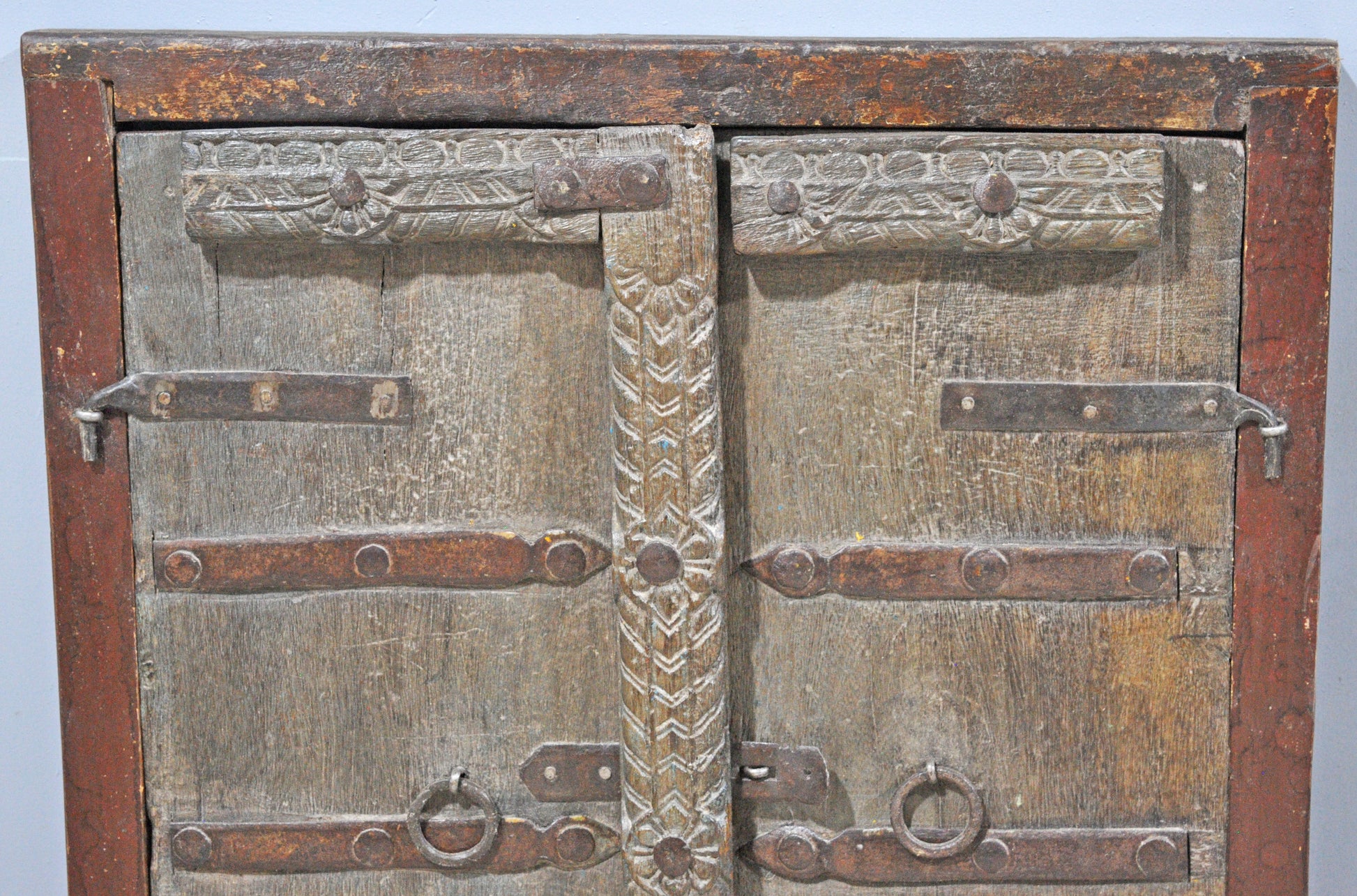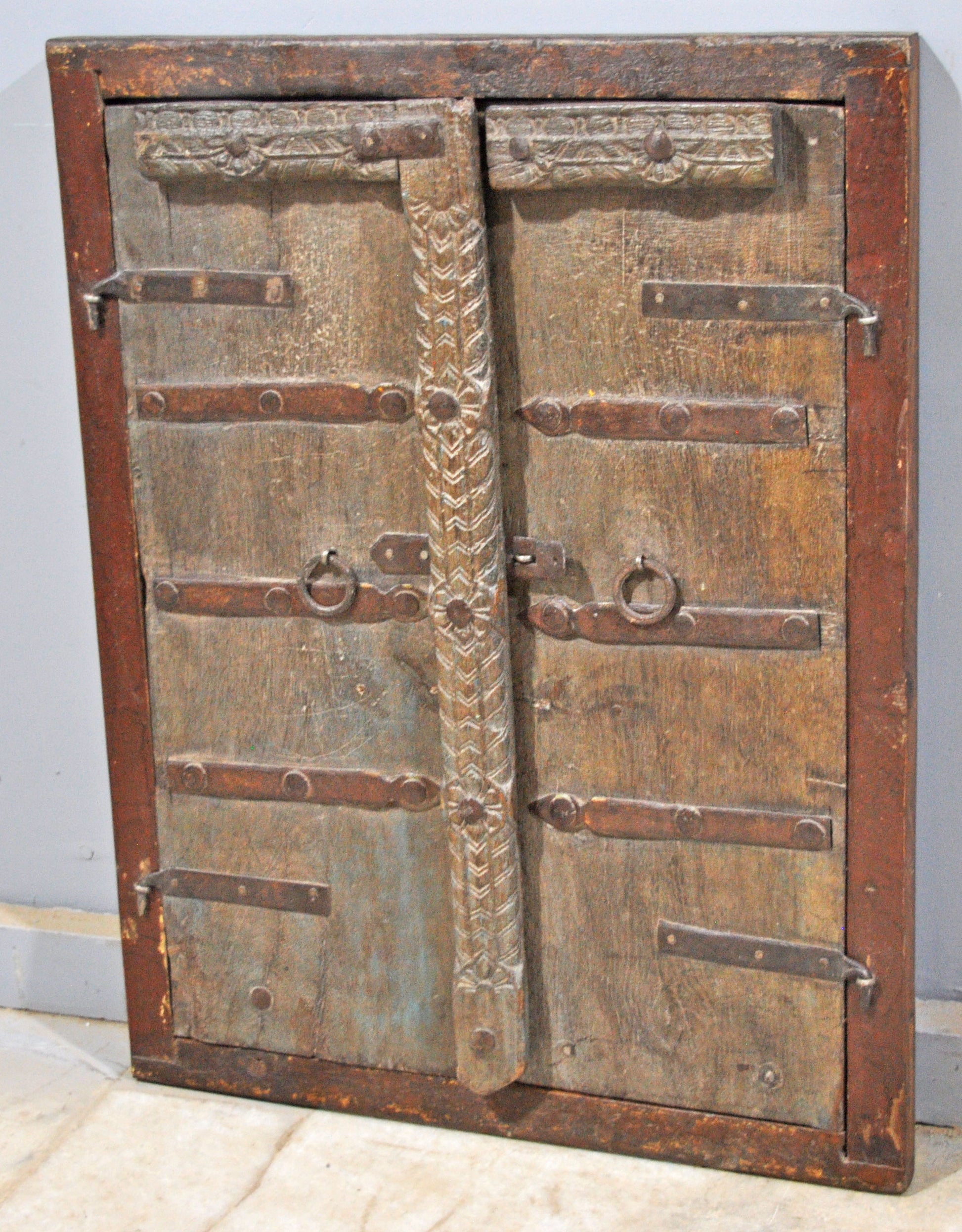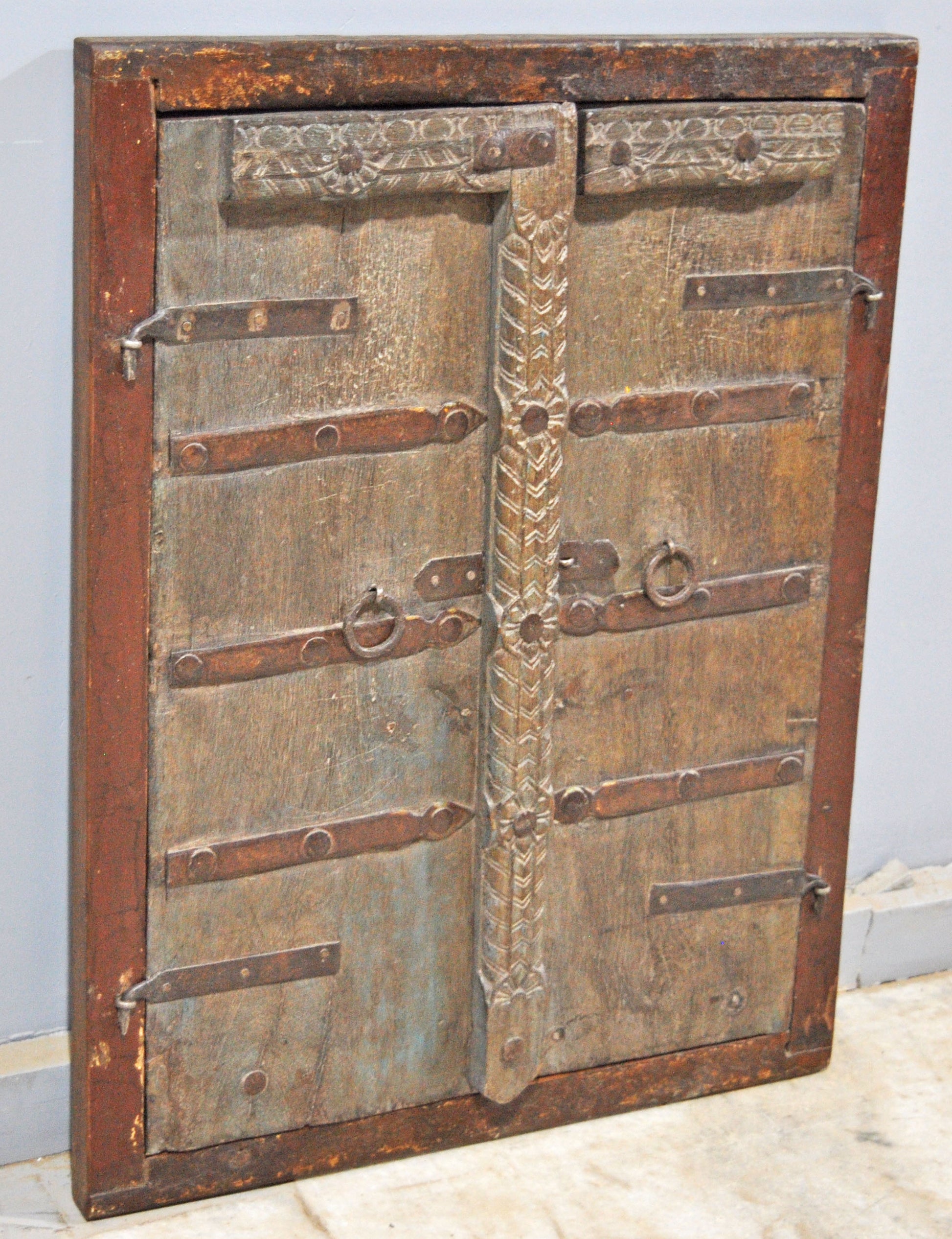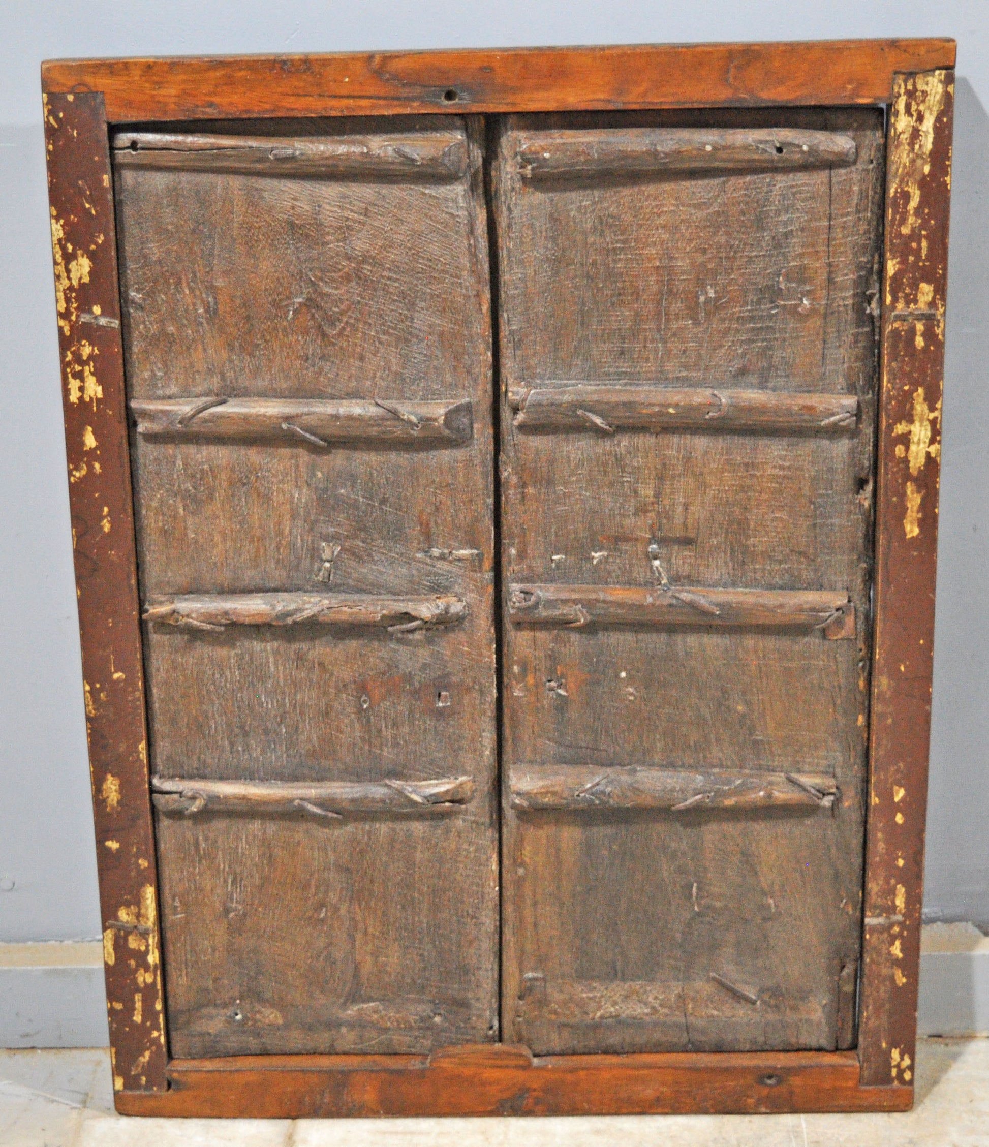 A rare and graceful antique wooden window turned wall art, once gracing the walls of heritage Indian houses. The frame has been lovingly restored while retaining its centuries-old appeal and handcrafted design. Detailed metal accents and hand carving give it an extraordinary presence. Its mellow tone and aged patina reveal the passage of time, embodying rustic beauty and timeless craftsmanship.