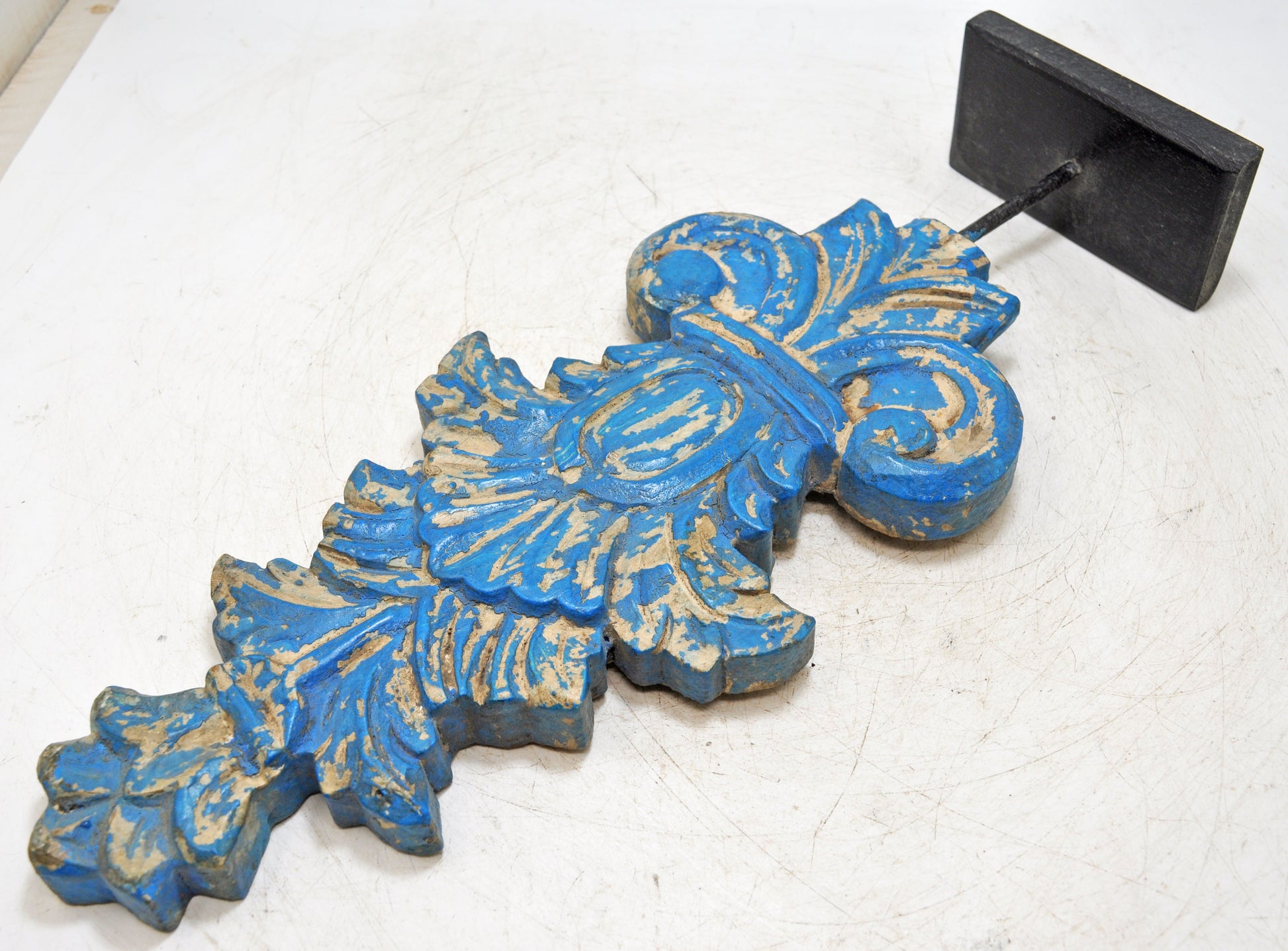 Hand Carved Wooden Flower Carving Panel Plaque on Stand Rustic Blue Painted