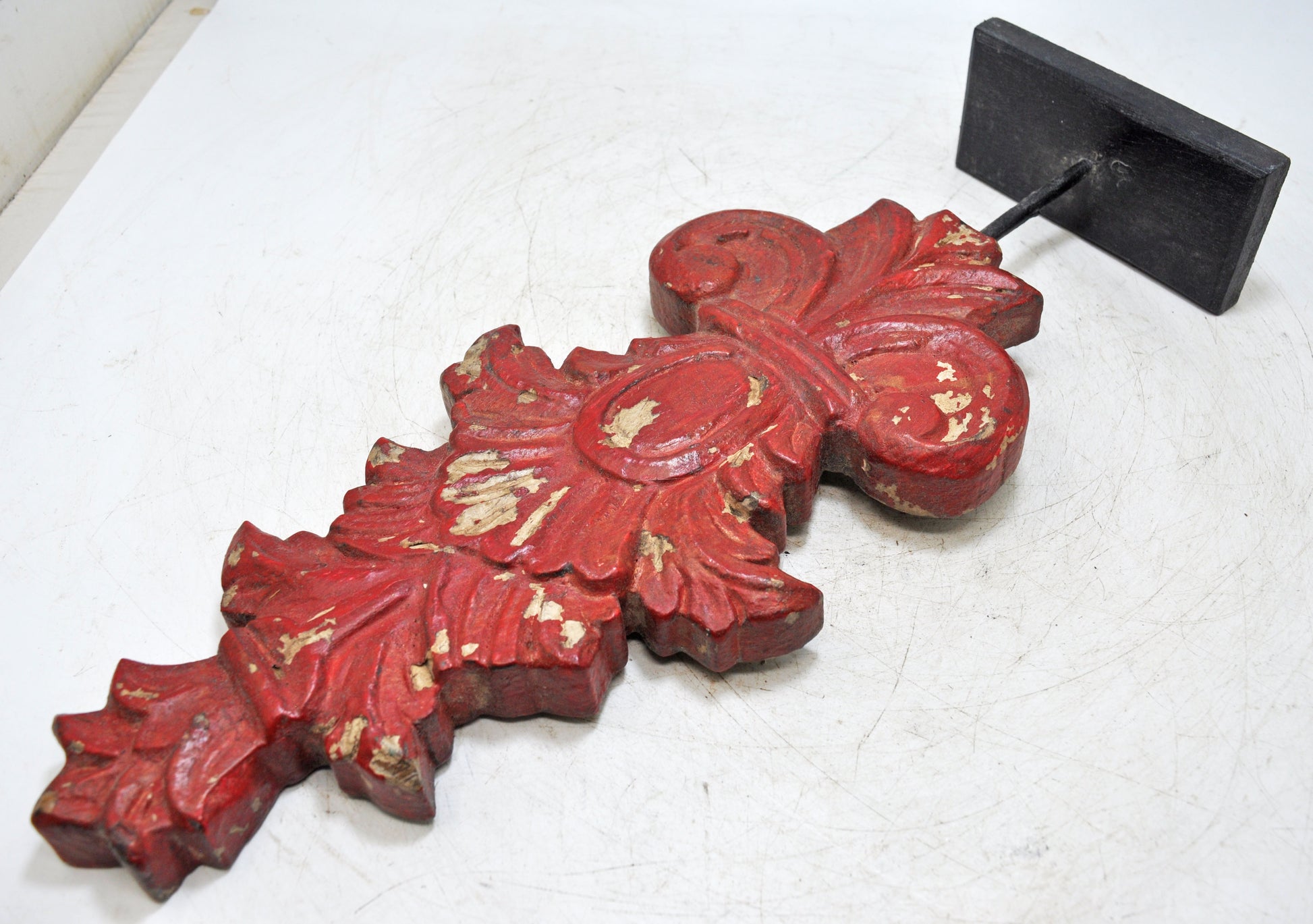 Hand Carved Wooden Flower Carving Panel Plaque on Stand Rustic Red Painted