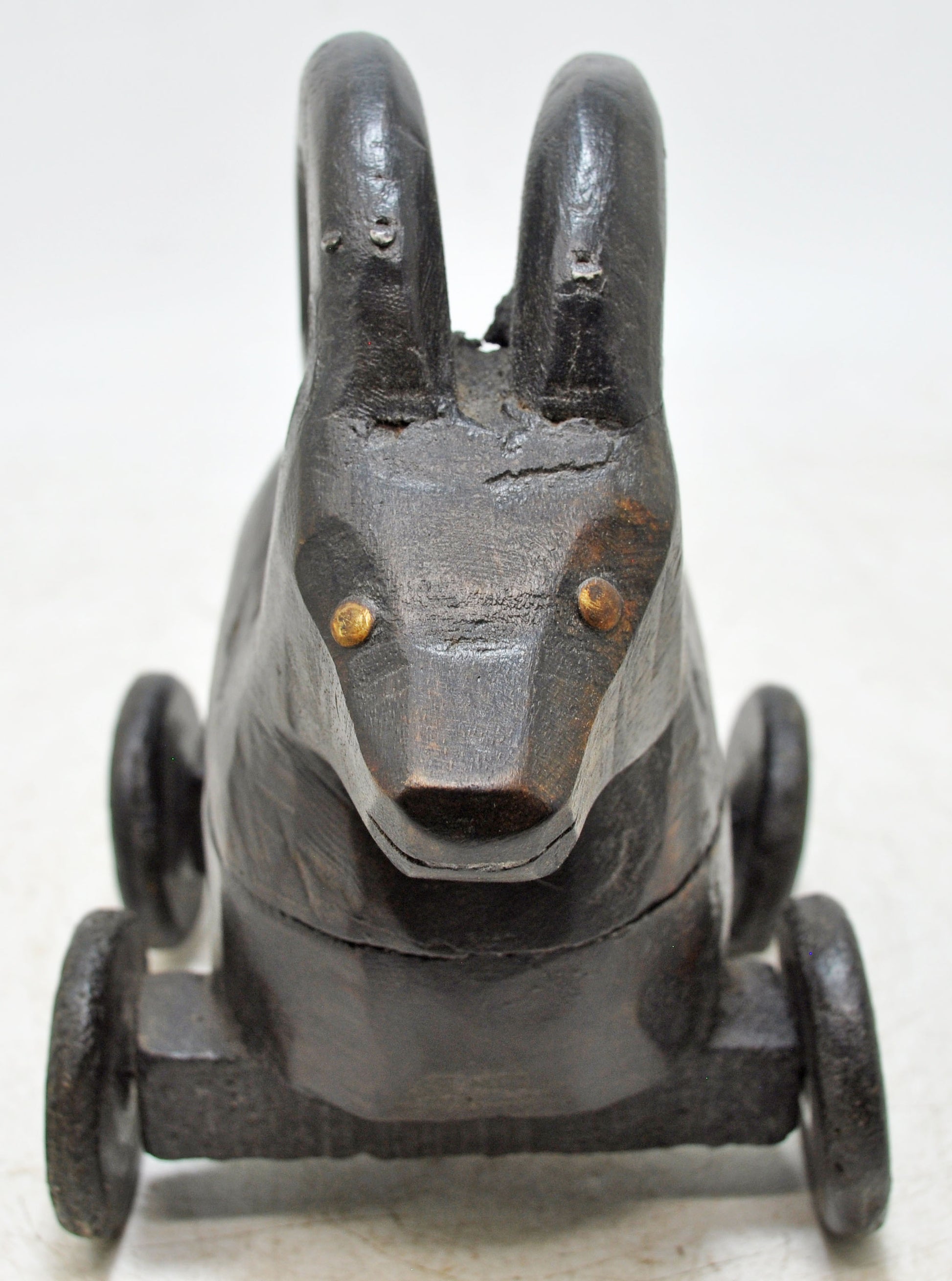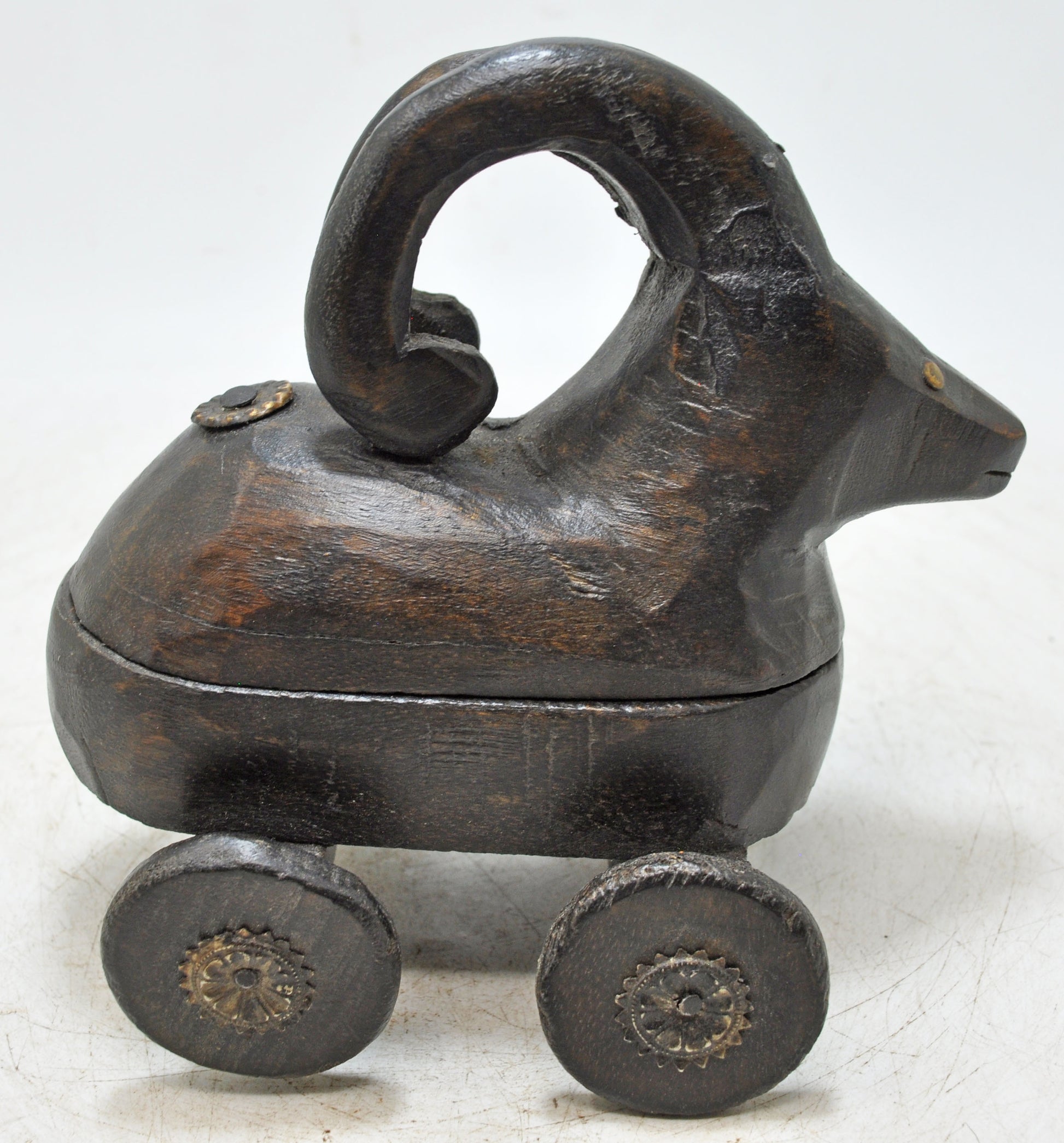 Hand Carved Wooden Goat Ram on Wheels Figurine Spice Box