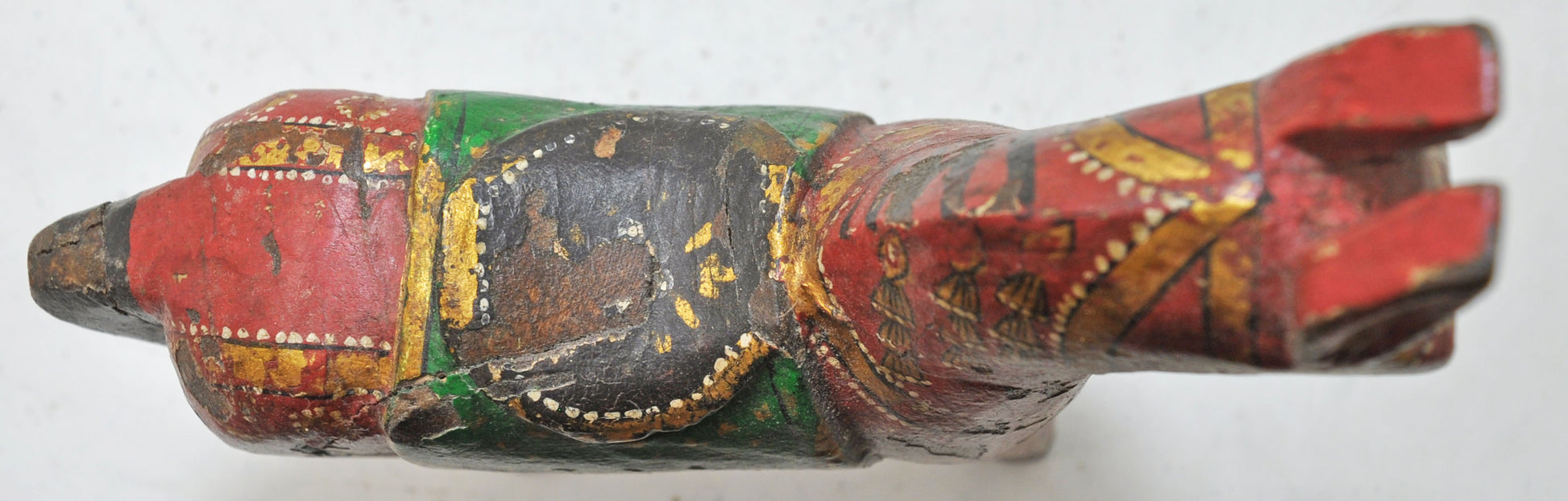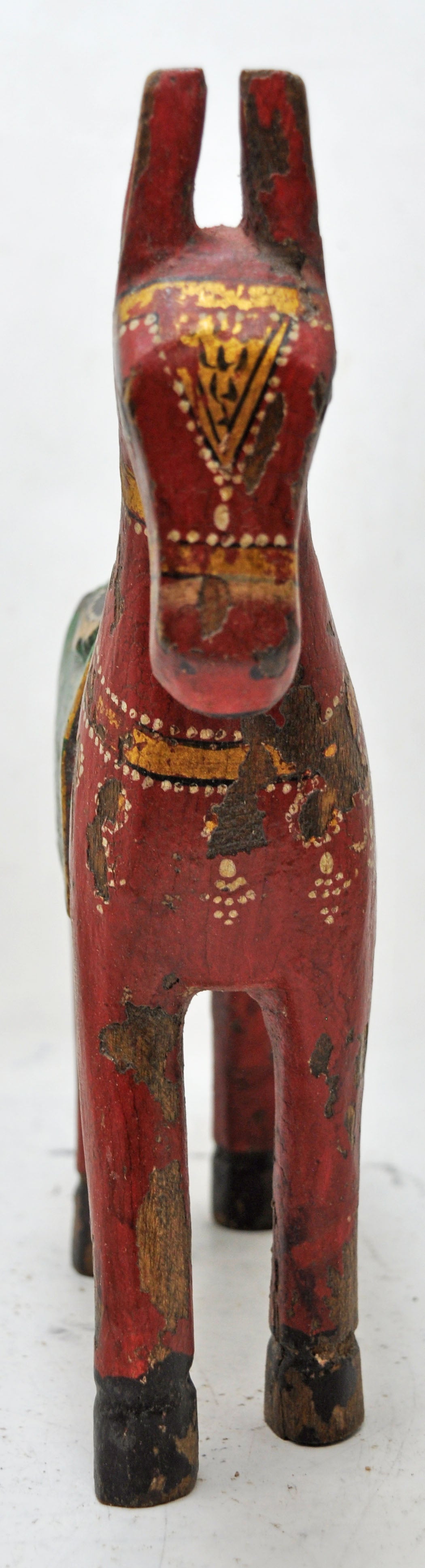 A nice looking wooden standing horse figurine. Hand carved in a nice shape and hand painted. Origin India.