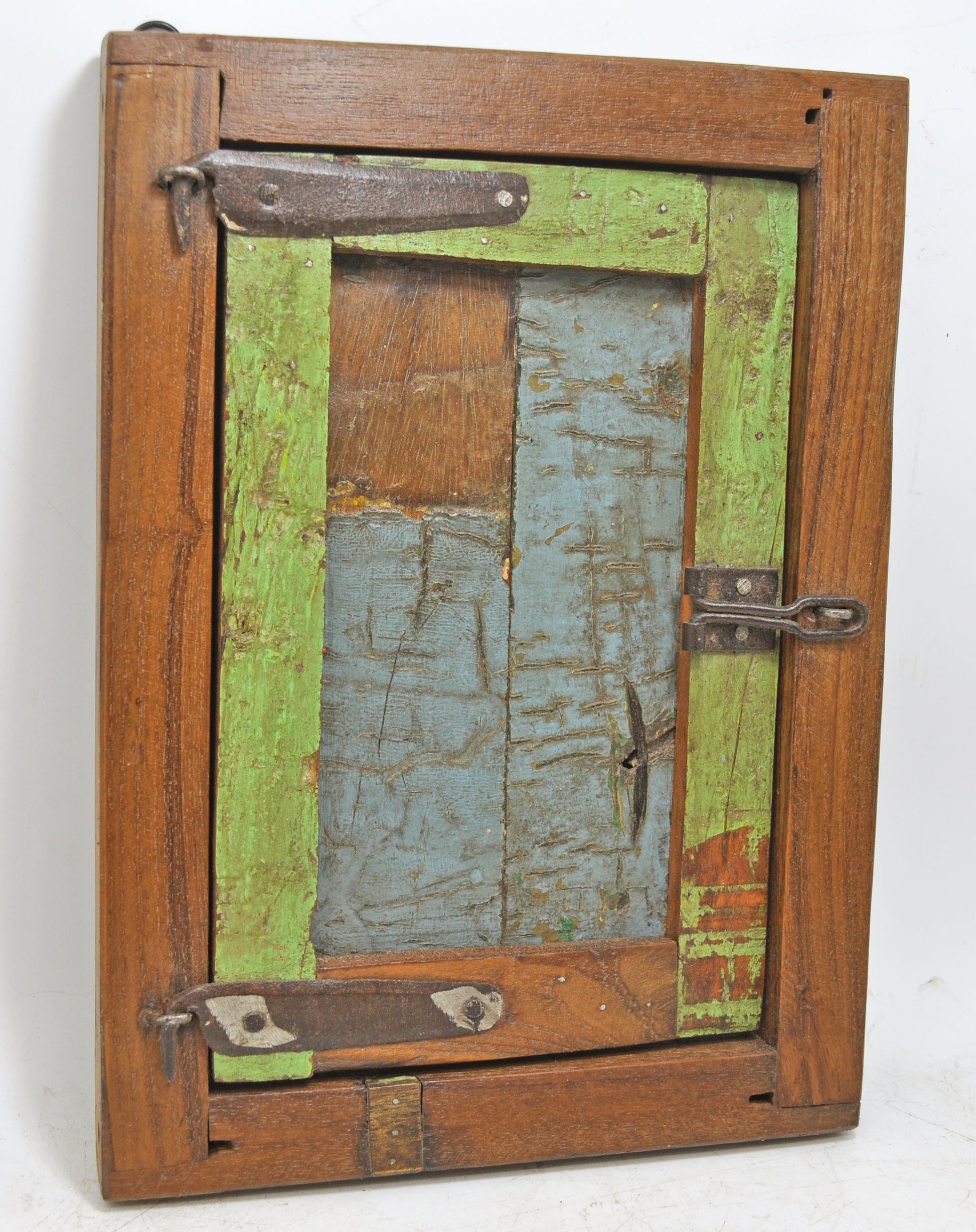 I like the look of this old wooden window panel with frame. It was crafted newly from salvaged old wooden window parts. It's in good condition, and the patina is very rich. Its origin is India.