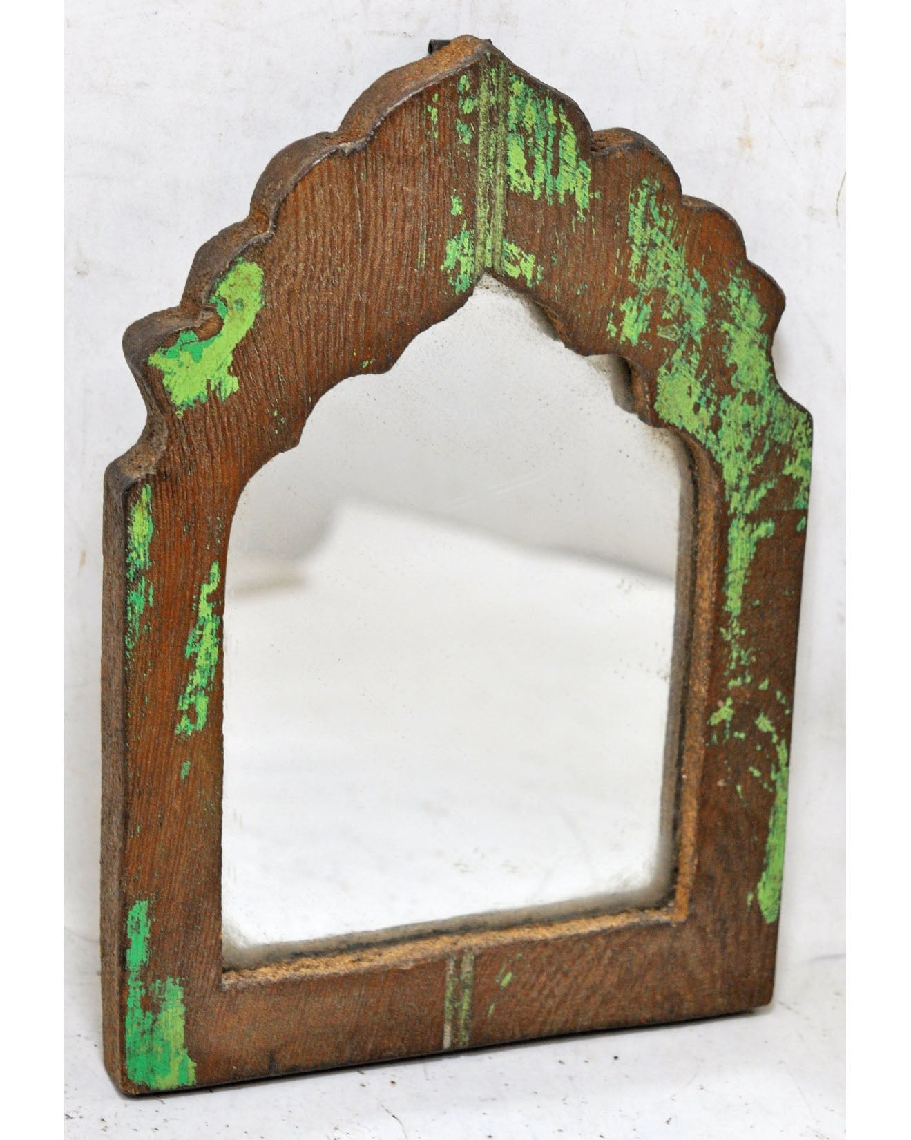 A nice looking wall hanging mirror frame crafted out of salvaged old wood from demolished houses. Hand carved in an arch shape. Each piece has a unique rustic color. Origin India.
