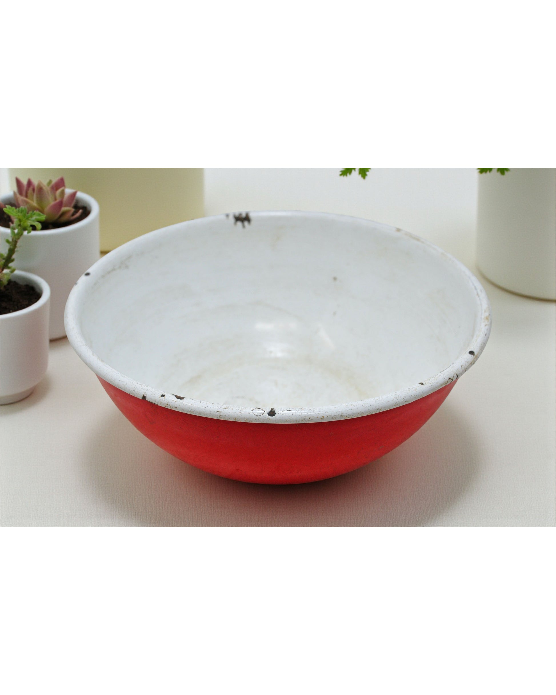 This old enamelware kitchen bowl has a sturdy iron body, expertly shaped by skilled hands into a pleasing round profile. The enamel finish shows signs of age that enhance its vintage aesthetic, producing a beautiful patina that collectors appreciate. A functional utensil in its time, it would have been used daily for mixing or serving. Now, it makes a charming rustic accent for décor or display. Good condition. Origin India.