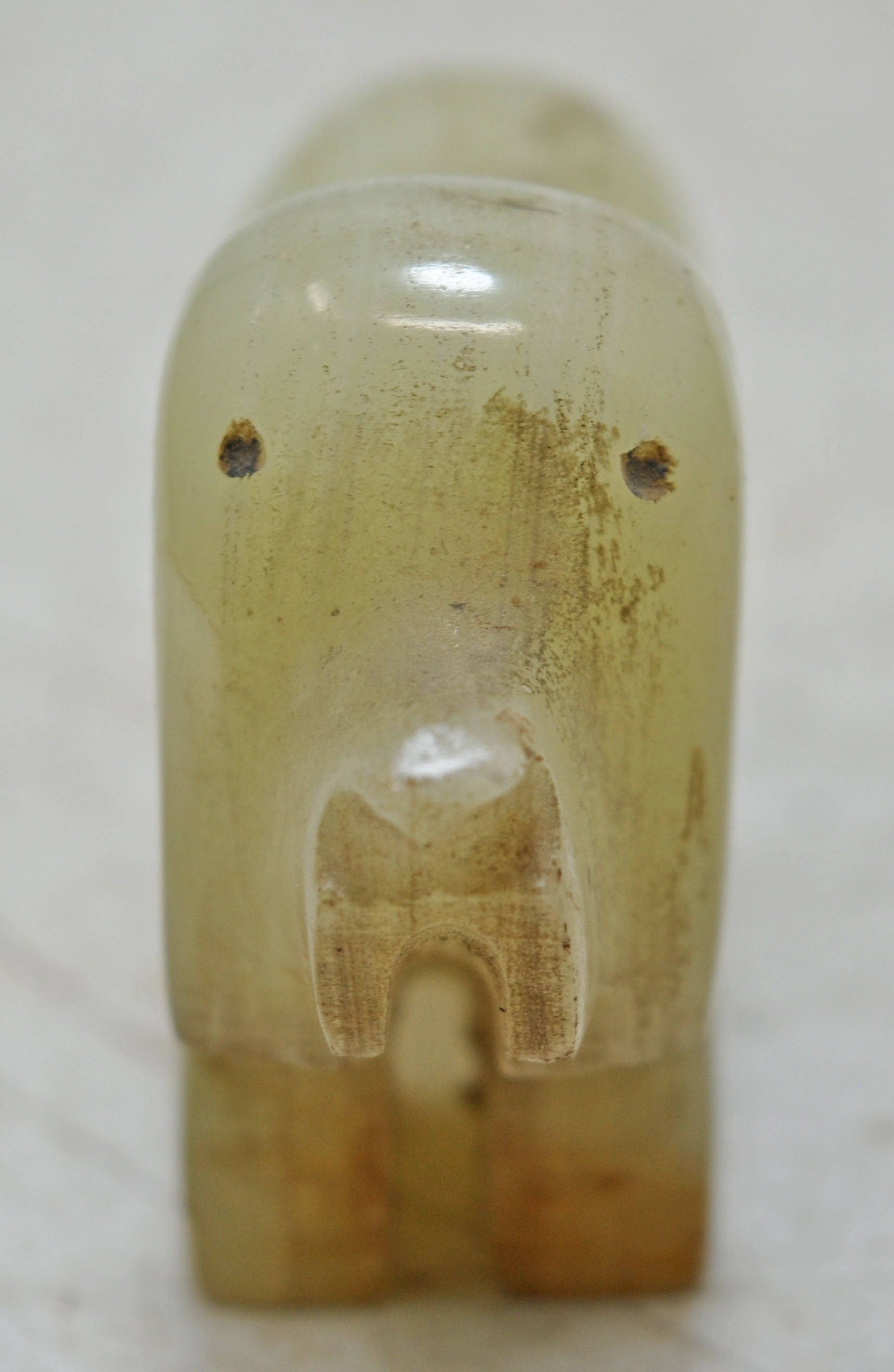 A small yet beautifully carved dog figurine made from semi-precious stone, created entirely by hand. The carving shows refined detailing that captures the playful spirit of the animal. The stone has aged gracefully, producing a warm patina that enhances its textured appearance. Still maintained in good condition, this piece stands as a testament to traditional stone craftsmanship and miniature artistry. Authentic artifact from India.