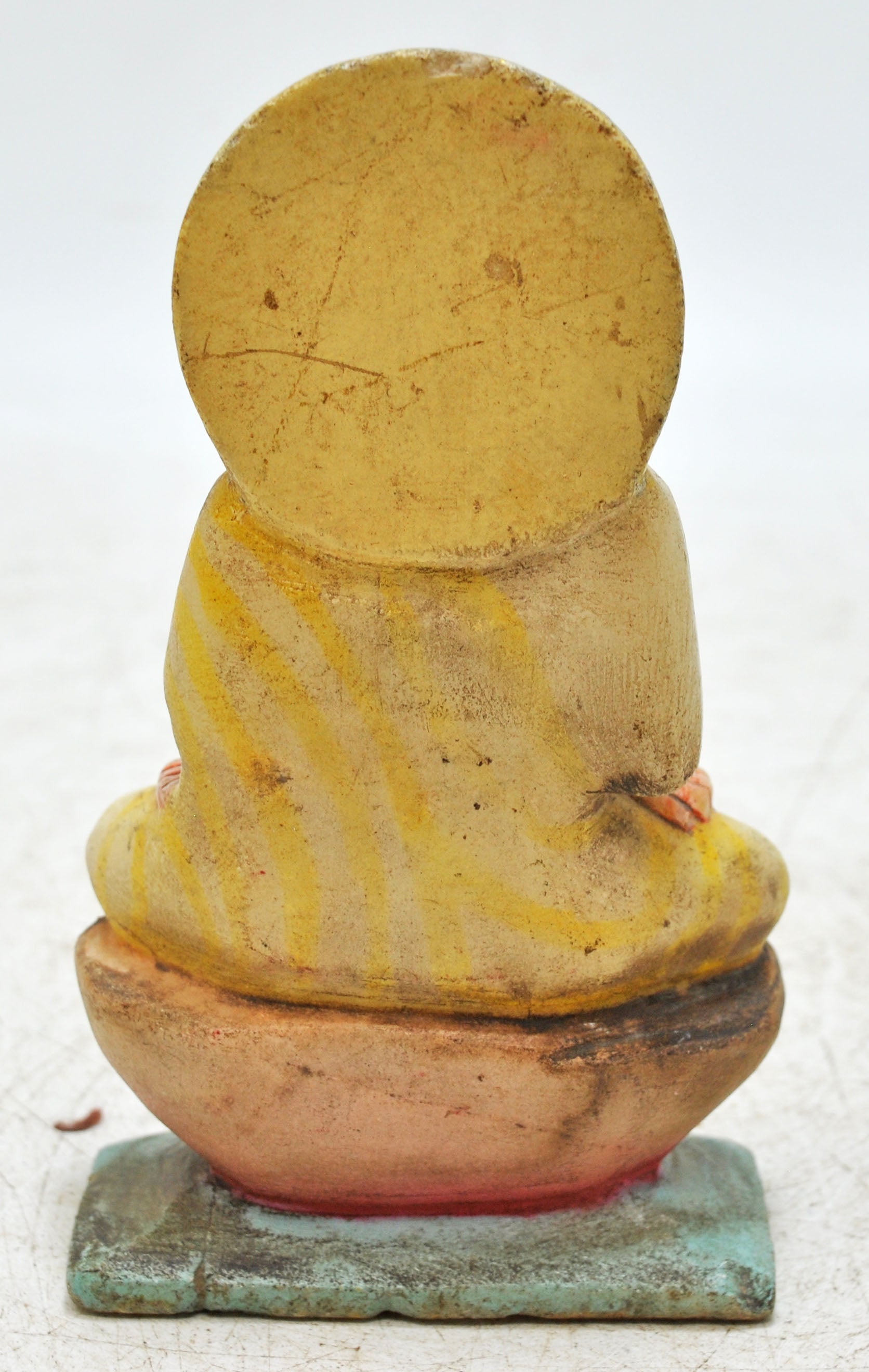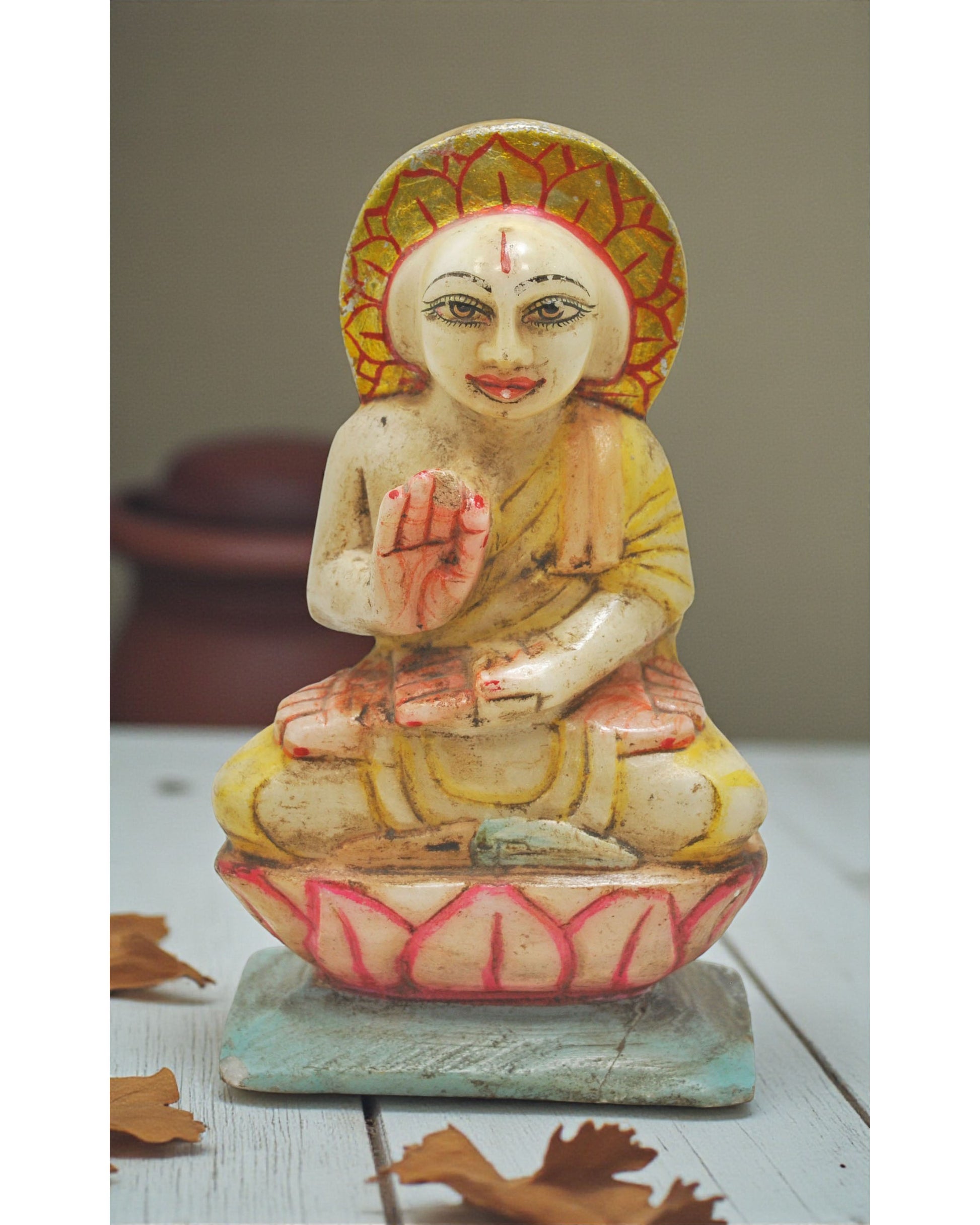 This old white marble idol of Gautama Swami, a significant figure in Jainism, is crafted with extraordinary precision. Every contour and facial feature is carefully hand-carved and hand-painted, reflecting the artisan’s skill and spiritual reverence. The rich patina enriches the antique charm, and the piece remains in good condition. Sourced from India, it embodies the heritage of fine religious craftsmanship.