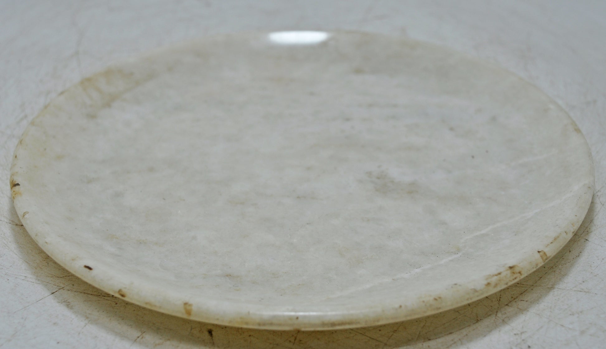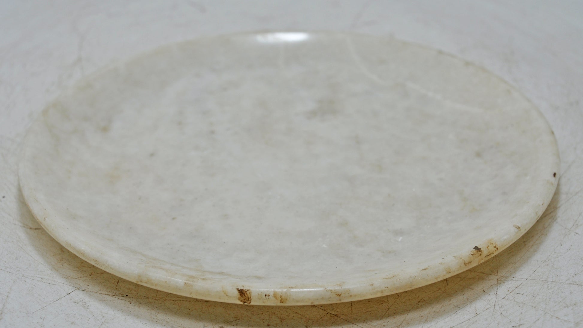 A beautifully hand-carved round plate made from solid white marble, showcasing traditional craftsmanship through its smooth contour and balanced shape. The marble displays a naturally developed patina that highlights its history and gives it a warm, vintage feel. This piece works well as a decorative platter, a pedestal for small objects, or a subtle accent in minimalist or rustic interiors. A lovely collectible with enduring charm. Good condition. Origin India.