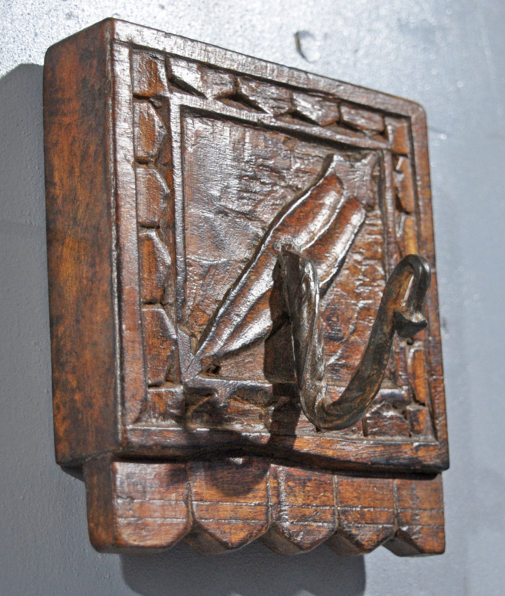 Carefully crafted, this wooden single-hook hanger exhibits precise hand-carving and a well-proportioned form, featuring a deep, rich patina while remaining in very good preservation, hailing from India, exemplifying centuries of skilled woodworking, functional artistry, and the enduring appeal of hand-crafted decorative wooden household items admired by collectors of antique heritage objects.