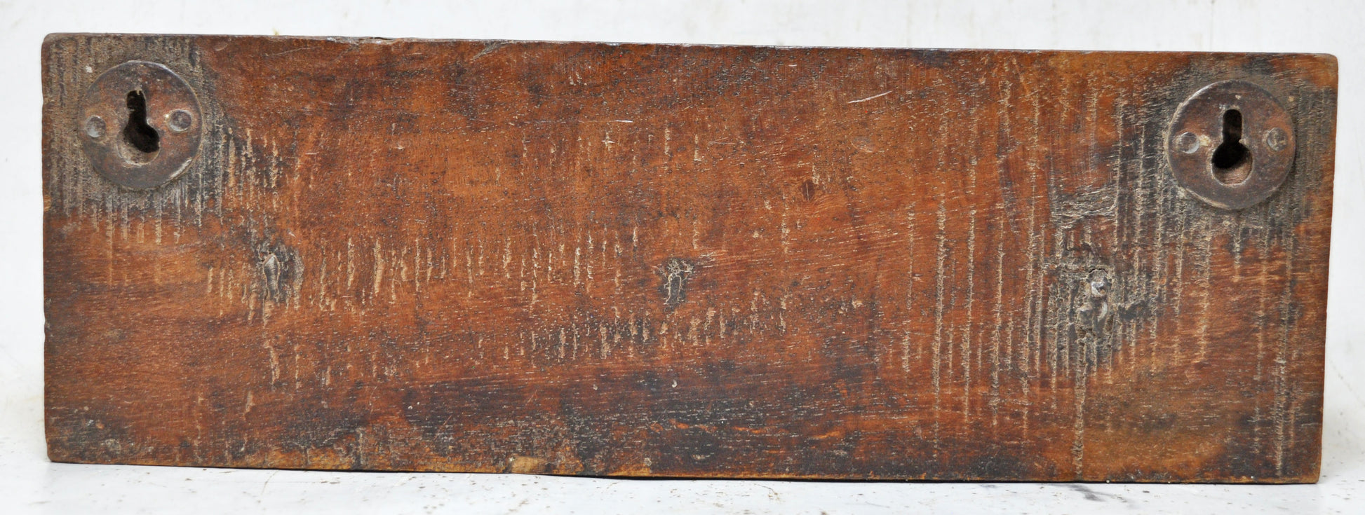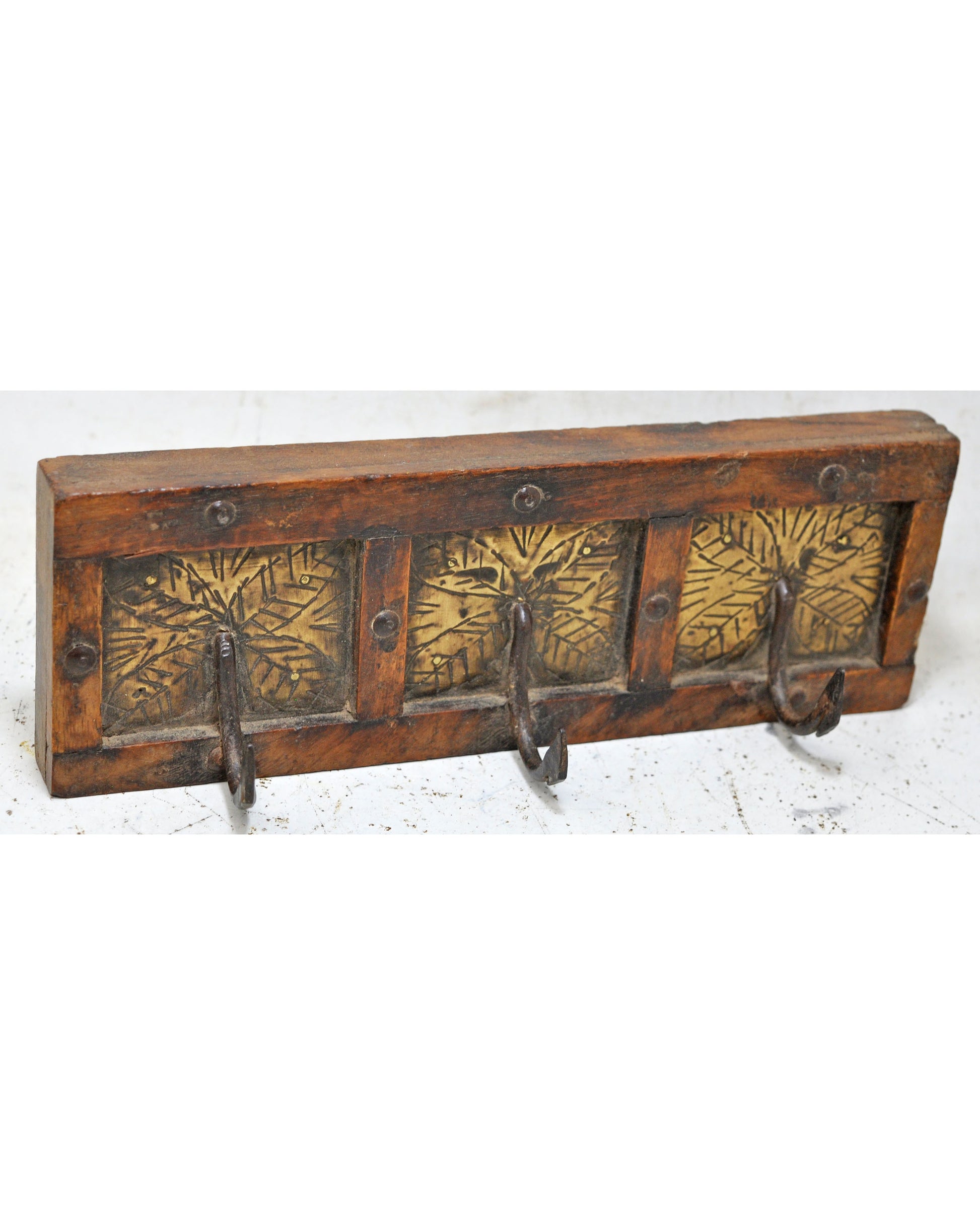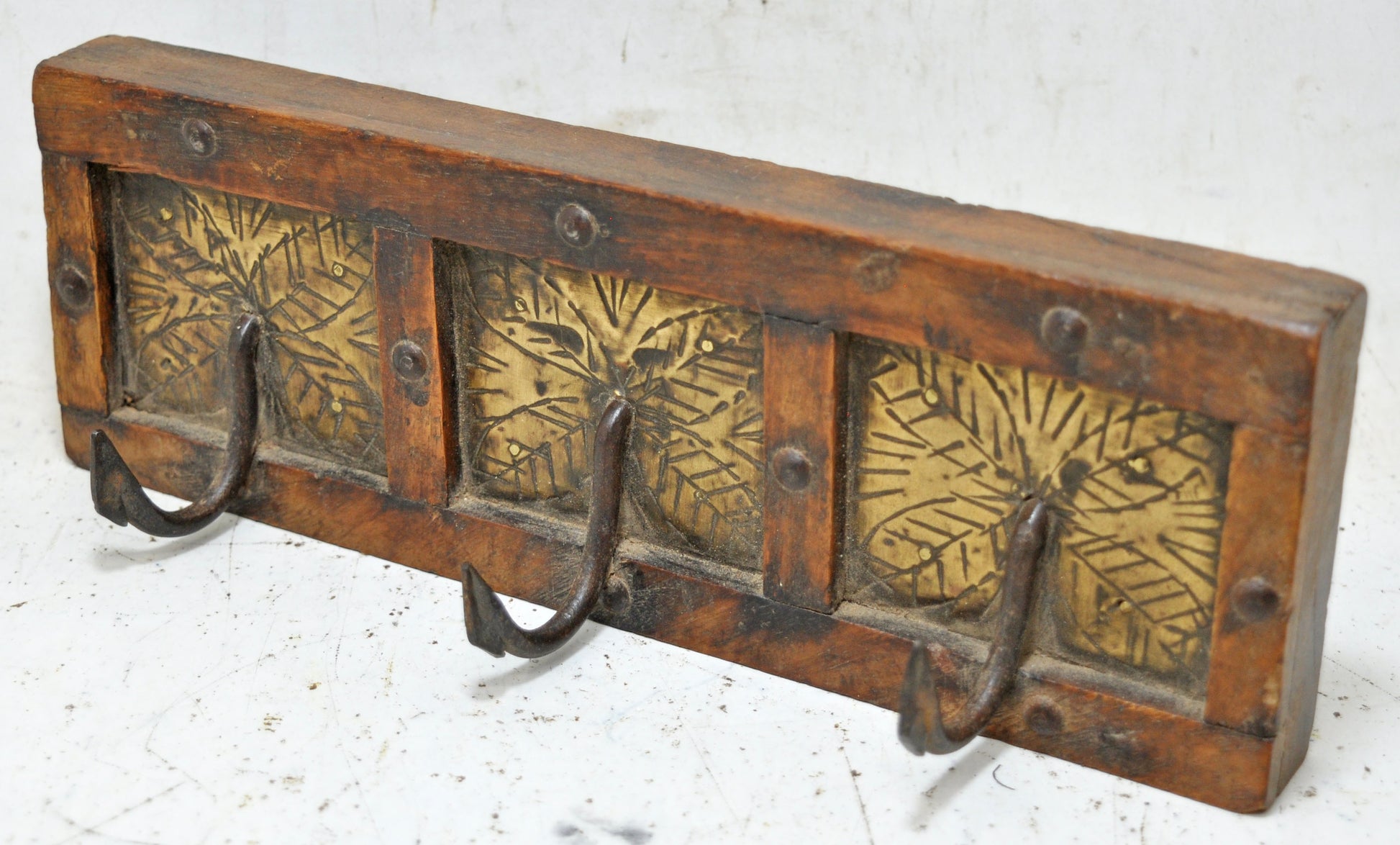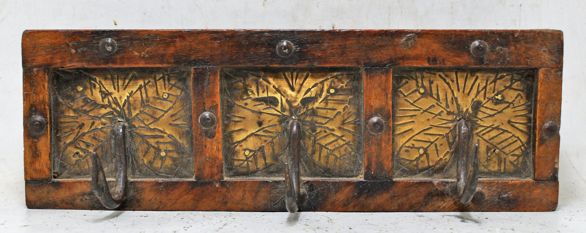 A nice looking old wooden 3 hook hanger. Hand crafted in a nice shape, with brass sheet on wood. Good condition and a rich patina. Origin India.