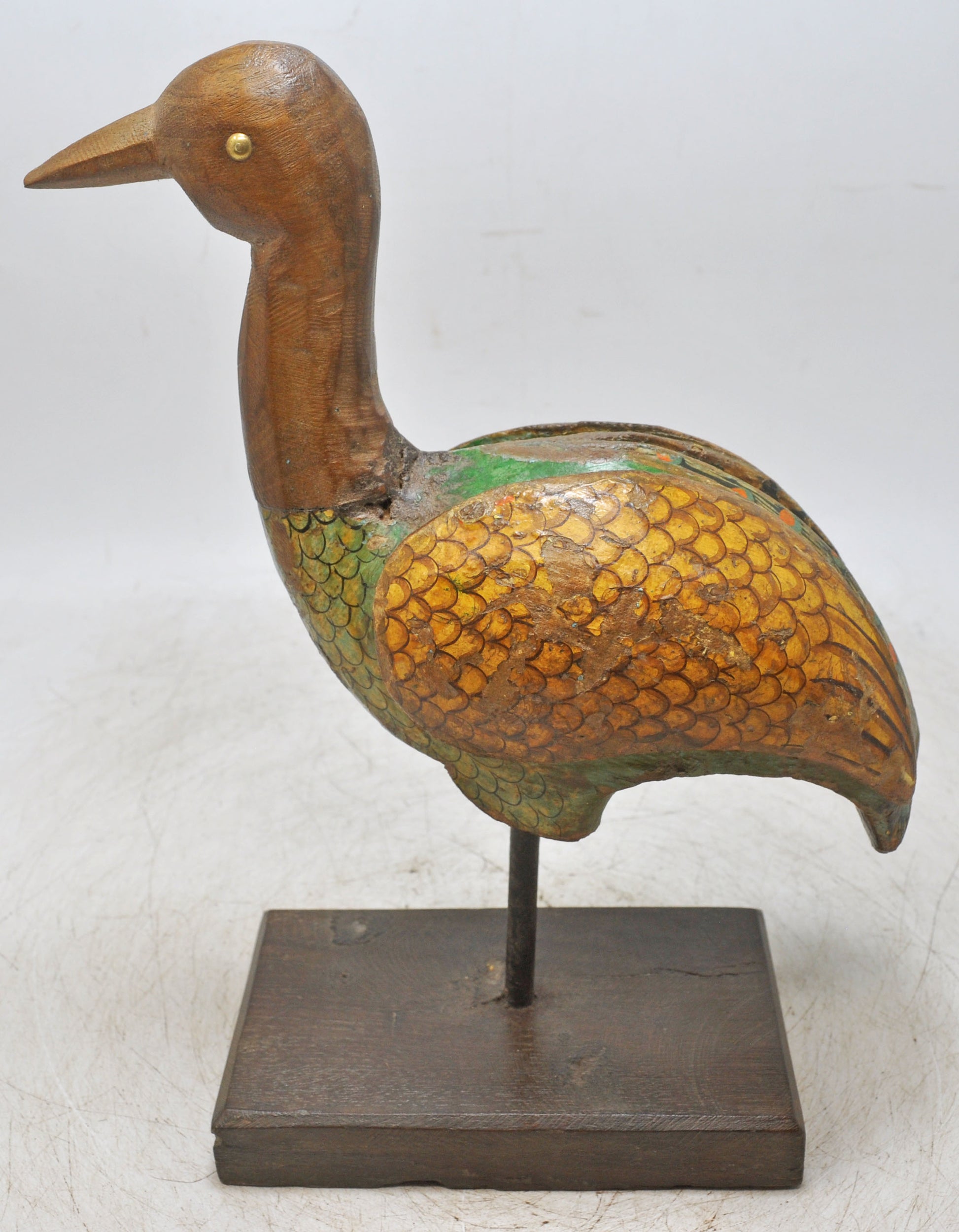 An antique Indian wooden bird figurine carved entirely by hand with pleasing detail and a timeless silhouette. The sculpture shows natural signs of age that contribute to a deep, attractive patina. The carving remains clear and balanced, and the figurine is in good condition, making it a charming example of traditional Indian decorative art.