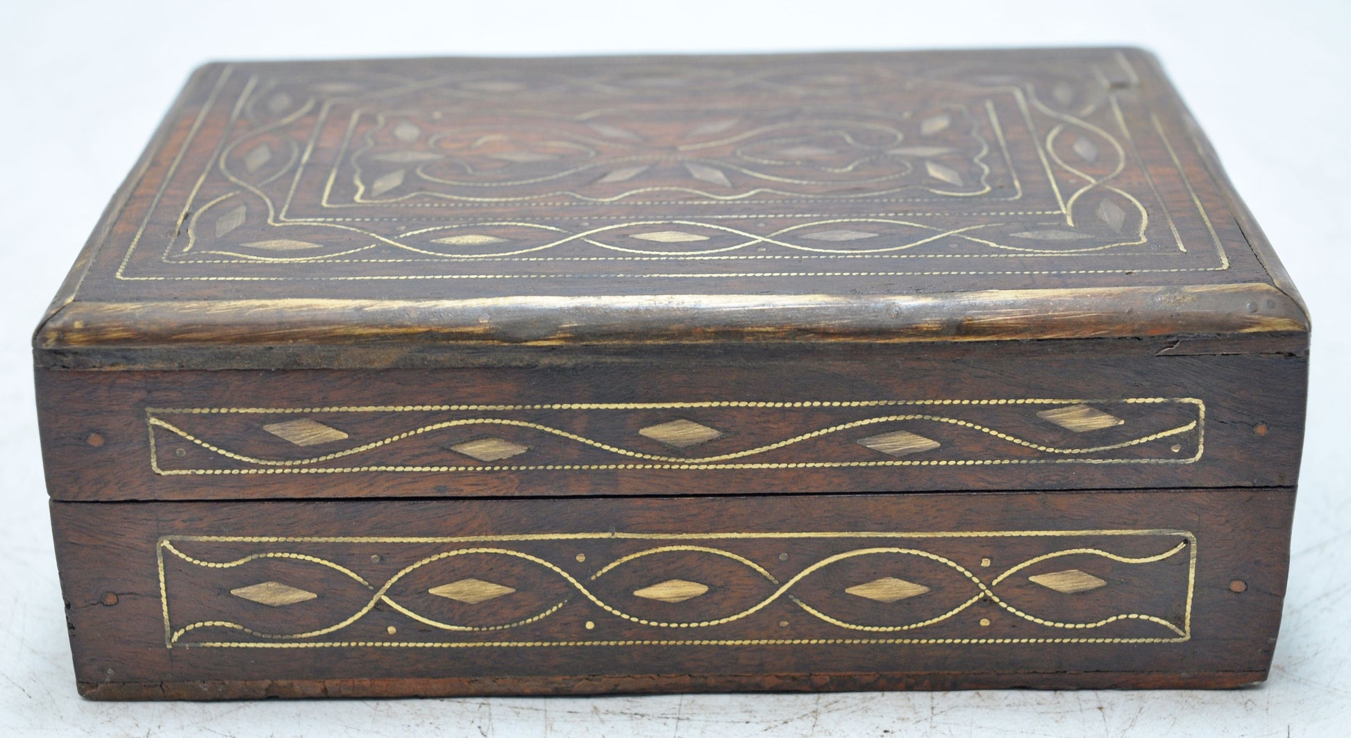 An elegant, vintage wooden box featuring beautiful brass embellishments that provide a striking contrast to its dark, seasoned grain. The craftsmanship is evident in every detail, making this more than just a box; it's a piece of decorative art. This authentic Indian item is in excellent condition, its warm patina and ornate metalwork combining to create a charming and sophisticated accent for any home or office.