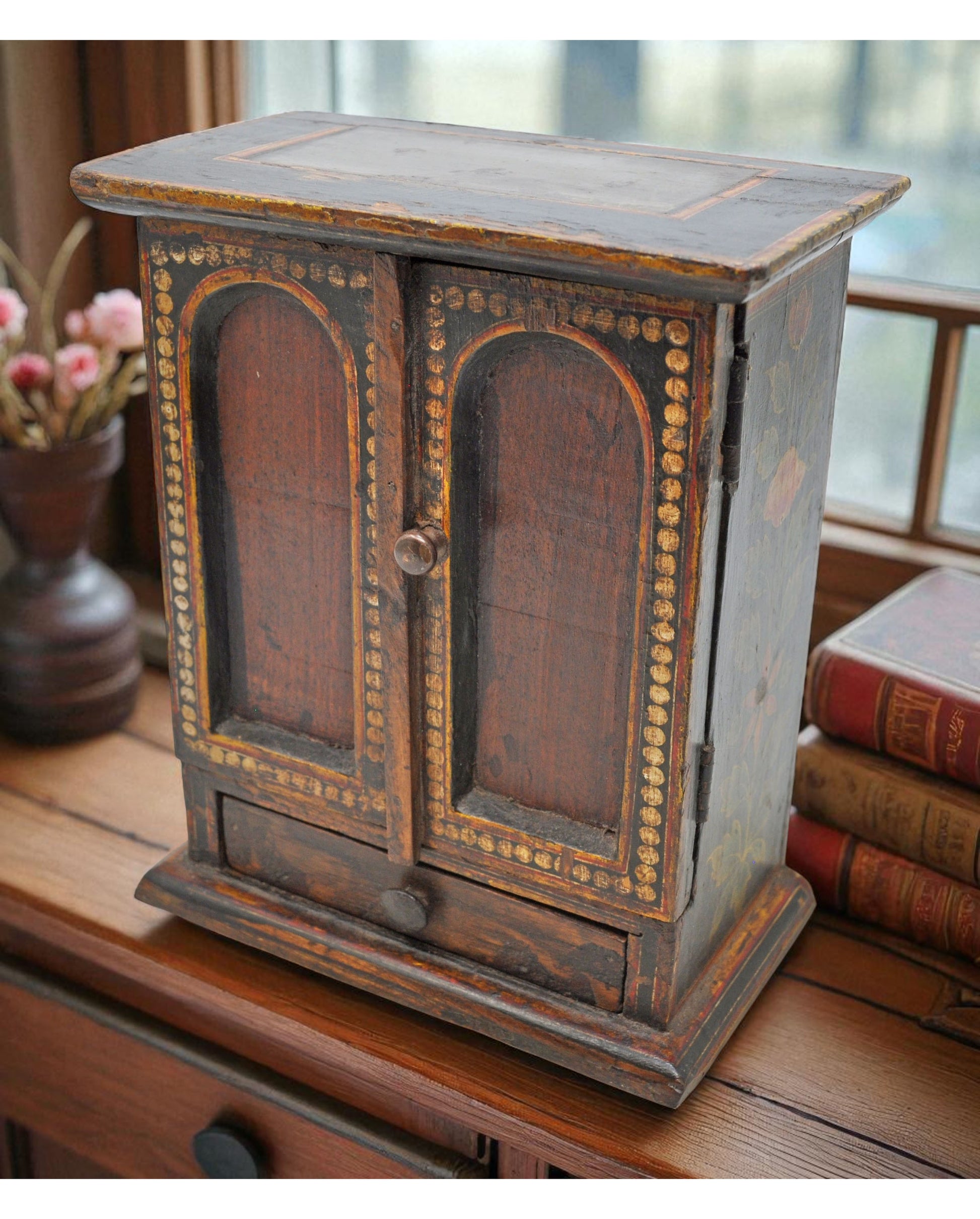 An antique wooden jewelry box crafted in the style of a miniature cabinet, reflecting fine workmanship and cultural charm. The exterior displays remnants of the original painted decoration, enhancing its authentic character. The wood has aged gracefully, developing a deep and attractive patina. Strong, decorative, and functional, this Indian piece is a wonderful example of traditional artistry preserved in time.