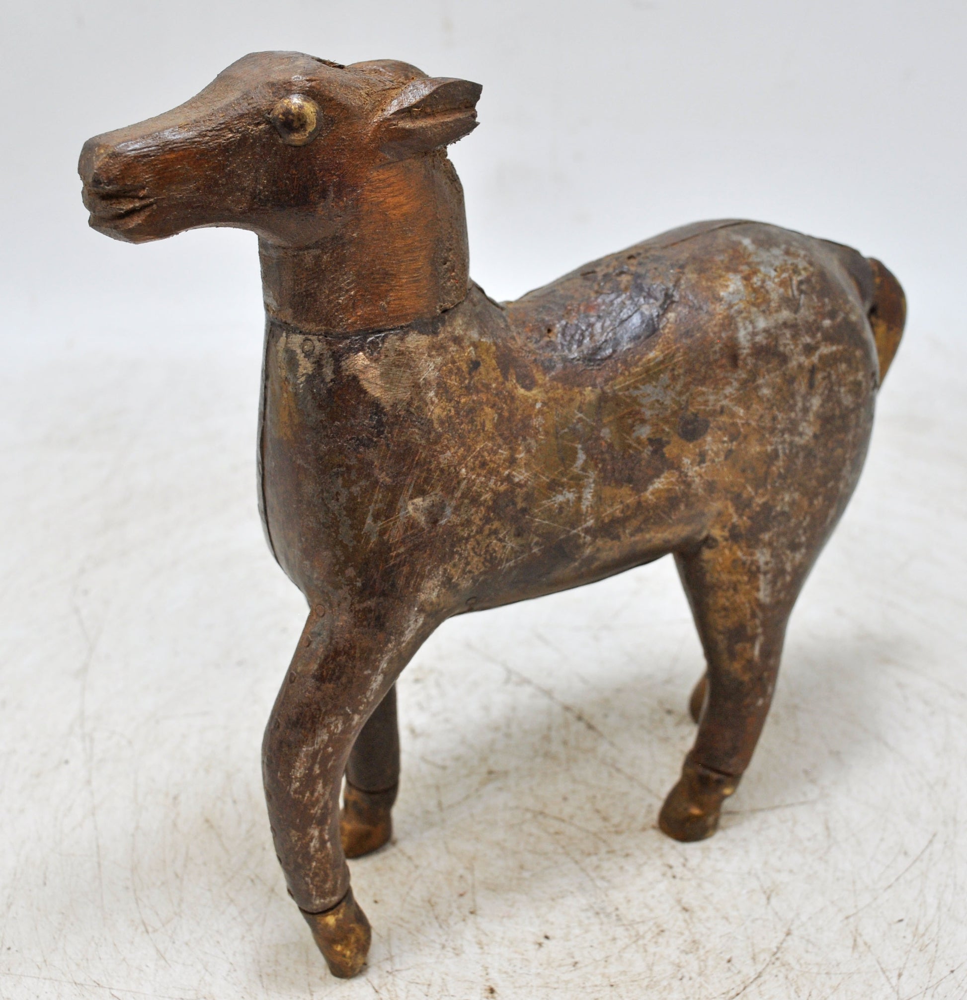 This old wooden deer figurine is finely hand-carved, showcasing intricate detailing and graceful form. Preserved in good condition, it bears a warm, rich patina that highlights its vintage character. Crafted in India, this piece exemplifies skilled artisanal work and makes a remarkable addition to any collection or décor setting.
