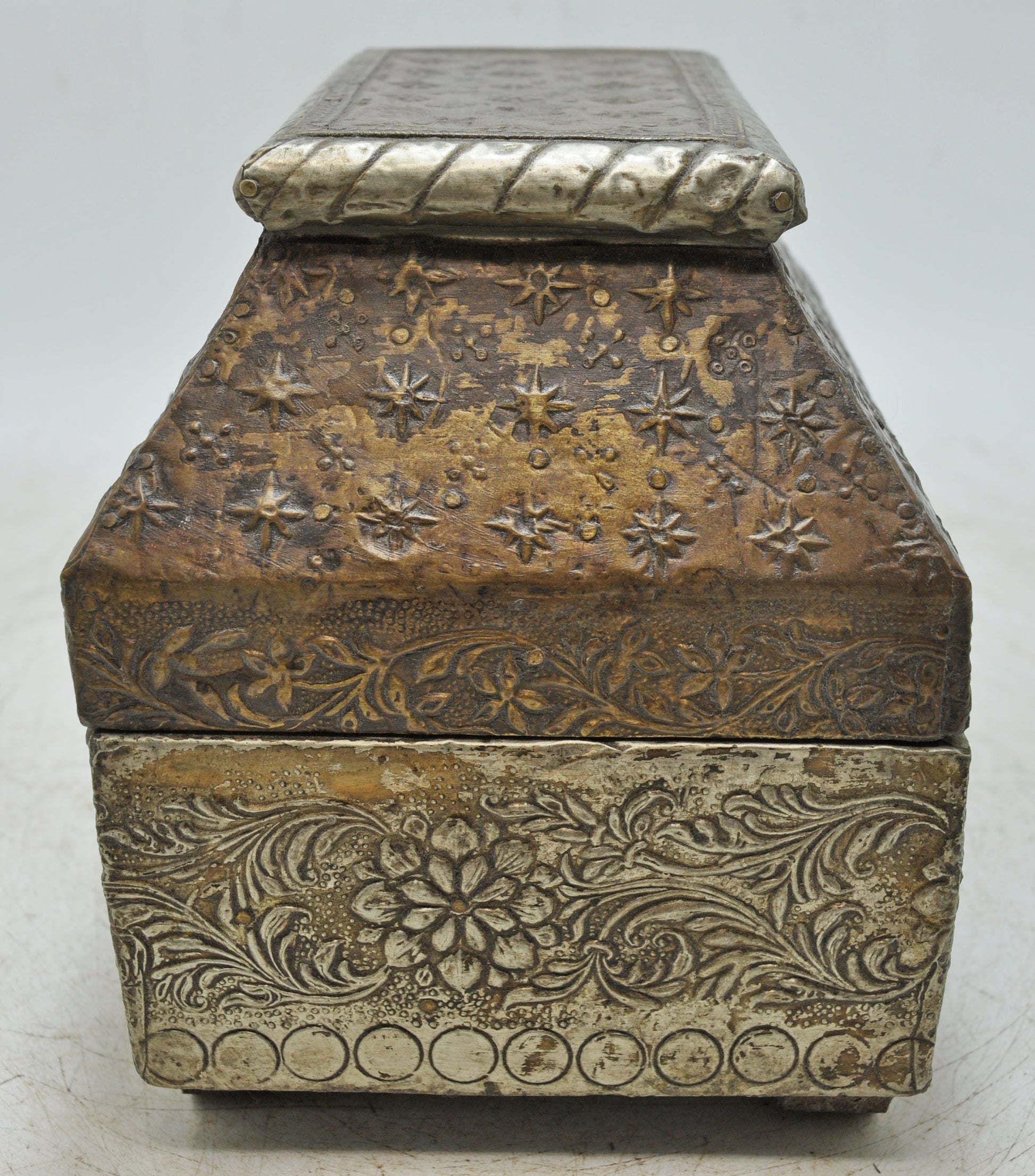This dome-topped wooden storage box exudes elegance with its hand-carved form and intricate metalwork. Brass and white metal fittings adorn the surface, giving the piece strength and sophistication. The warm patina enriches its antique essence, making it highly desirable for collectors. Handmade in India, it combines charm and practical use, standing as a fine representation of traditional craftsmanship.