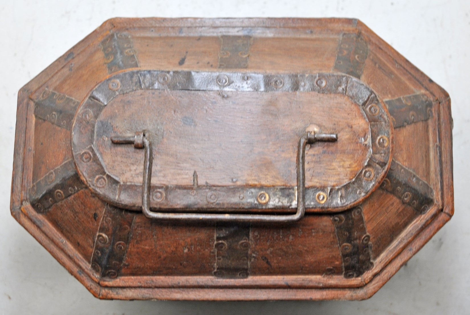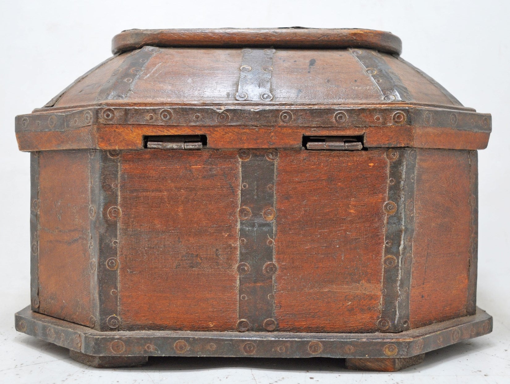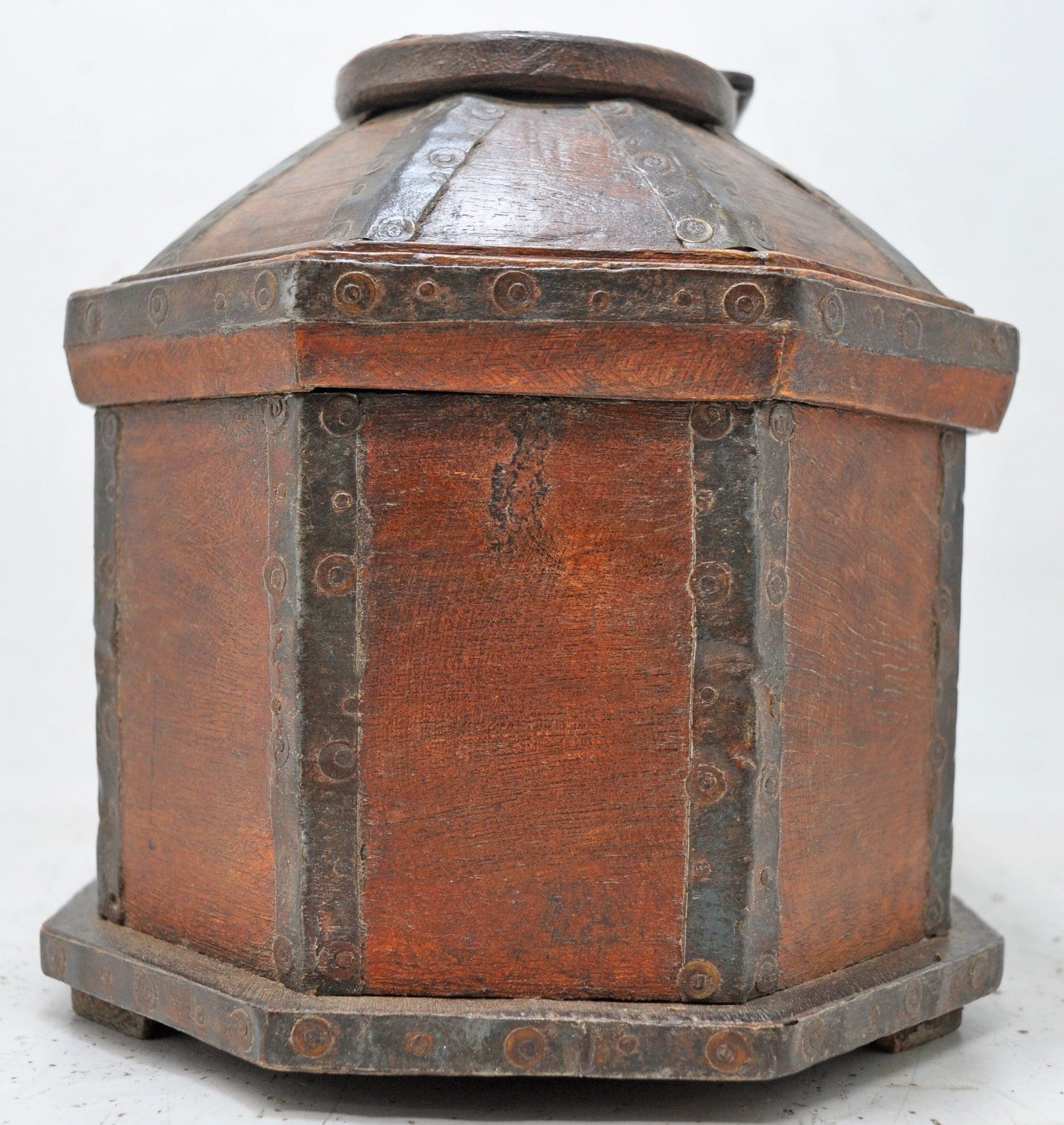 A nice looking old wooden dome shaped storage box. Hand crafted in a nice shape. Good condition and a rich patina. Origin India.