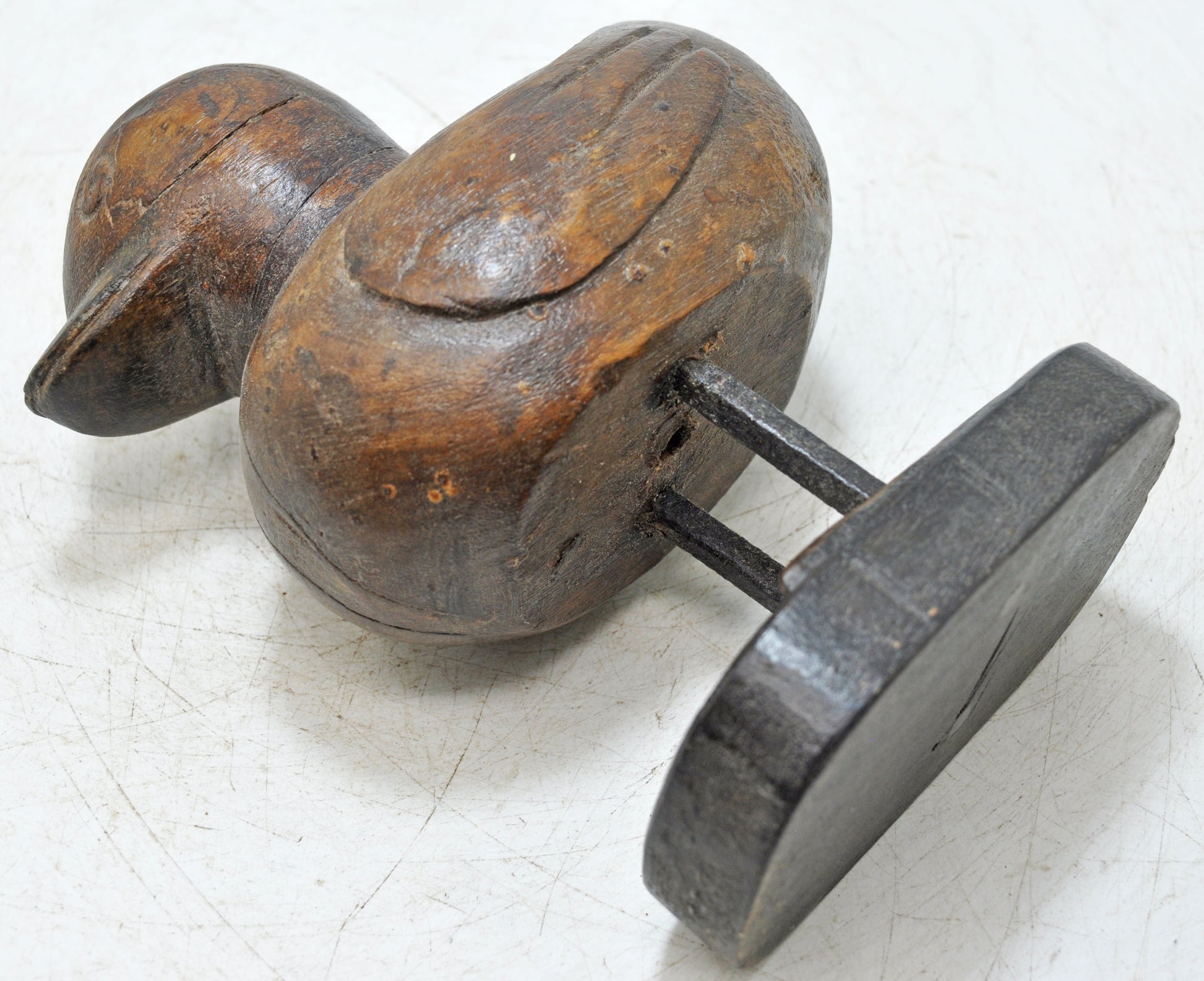 Introducing a fascinating, old-world duck effigy, this artistic wooden piece is a product of fine handiwork from the Asian subcontinent. The creature's portrayal is rendered in a wonderfully petite scale, making it irresistibly sweet and endearing. Its smooth, organic contours were expertly created by an individual carver, giving the statuette a distinctive personality. The material integrity is very high, retaining a spectacular, dark luster that has developed over countless years. Acquire this unique, miniature animal carving as a symbol of peace and enduring handicraft.