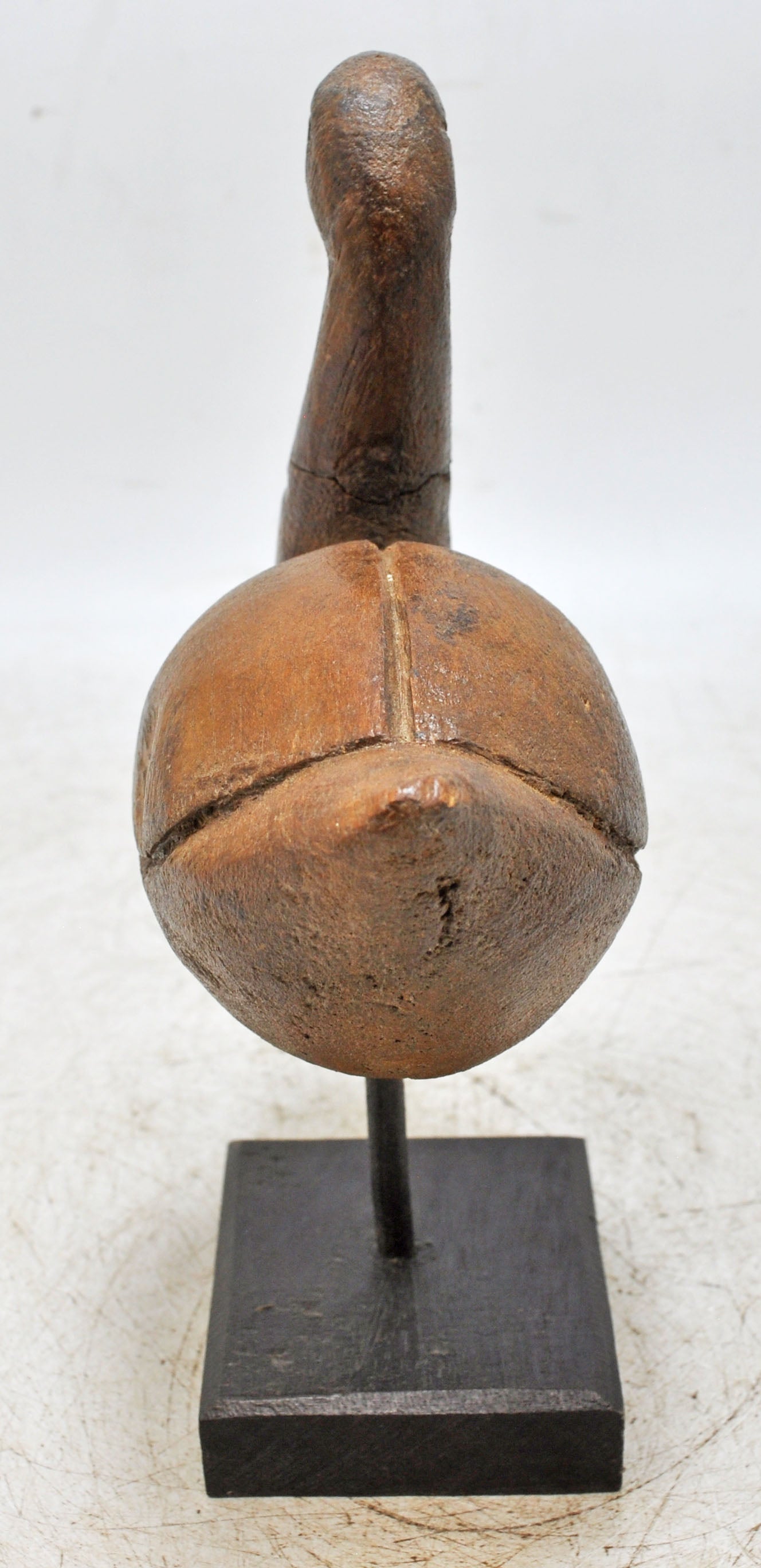 Exquisitely crafted, this antique wooden duck figurine features refined hand-carved contours with smooth flowing lines, displaying a warm, aged patina and excellent preservation, originating from India, reflecting traditional woodworking skill, artisanal craftsmanship, and the timeless charm of hand-made decorative bird figurines treasured by collectors of antique heritage décor.
